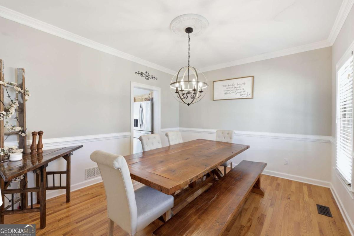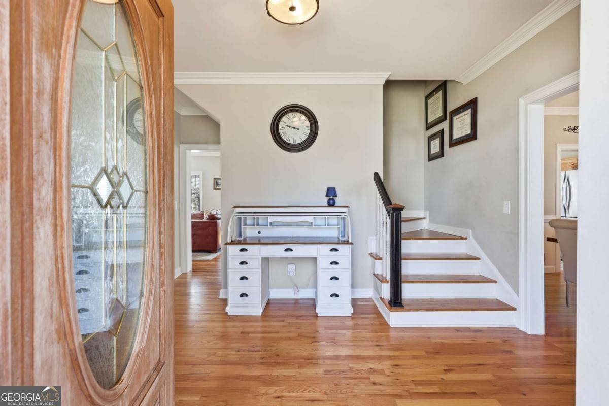 This 4 bedroom, 2.5 bathroom home in North Hall is an ideal family home! Located in a quiet neighborhood with no through traffic, its perfect blend of comfort and convenience in a peaceful, close-knit community is a rare find. The main level has an easy flow between rooms, and includes a formal dining room, sitting room, and kitchen that opens to the living area, as well as the laundry room and a half bath. All three bedrooms are located upstairs, and the primary suite has an adjoining bonus room that is ideal for use as a home office for remote or hybrid work. There is ample storage throughout the home, and the unfinished basement offers space for a home gym or workshop, or can easily be finished, as bathroom plumbing is already in place. The lovely setting with tree foliage that changes with the seasons, a small creek, and frequent deer sightings provides a lovely backdrop for such a wonderful home.