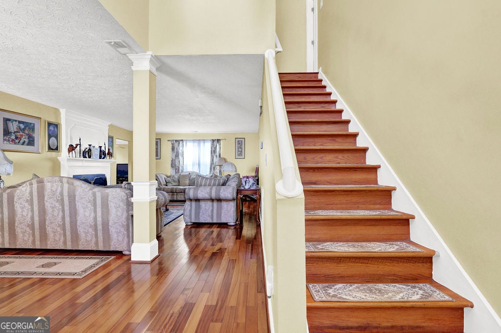 Beautiful traditional 4-bedroom, 2 full bath, and 1 half bath home featuring stunning hardwood floors throughout. The spacious dining room flows seamlessly into the inviting living room with a cozy gas fireplace-perfect for entertaining. The large, updated kitchen boasts granite countertops, an eat-in breakfast area, and a walk-in pantry. The kitchen opens to a comfortable den, creating a wonderful gathering space. A half bath, two storage closets, and a convenient laundry room are all located on the main level. Upstairs, you'll find a generous primary suite complete with a double vanity, soaking tub, and separate shower. Three additional spacious bedrooms complete the second floor. Enjoy outdoor living with two backyard decks overlooking a large, semi-flat yard-ideal for relaxing or entertaining. Located in the highly regarded DeKalb County School District.