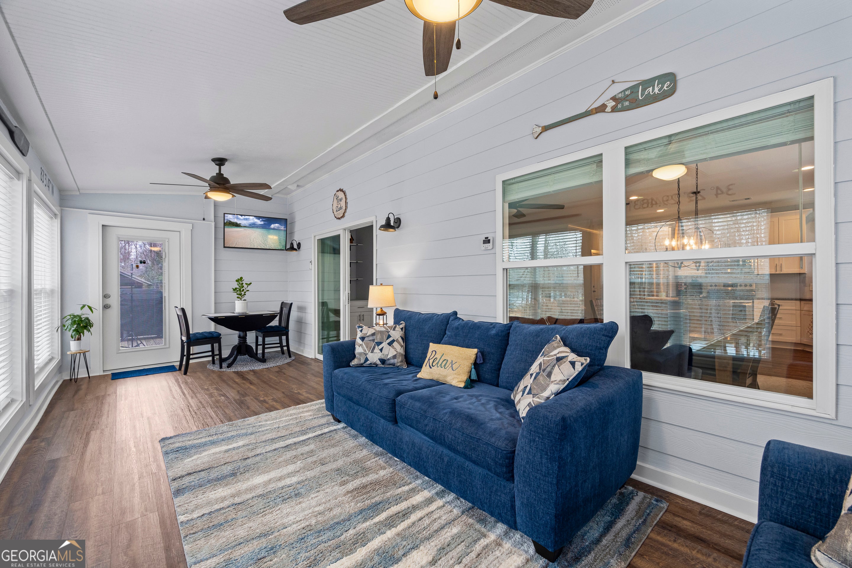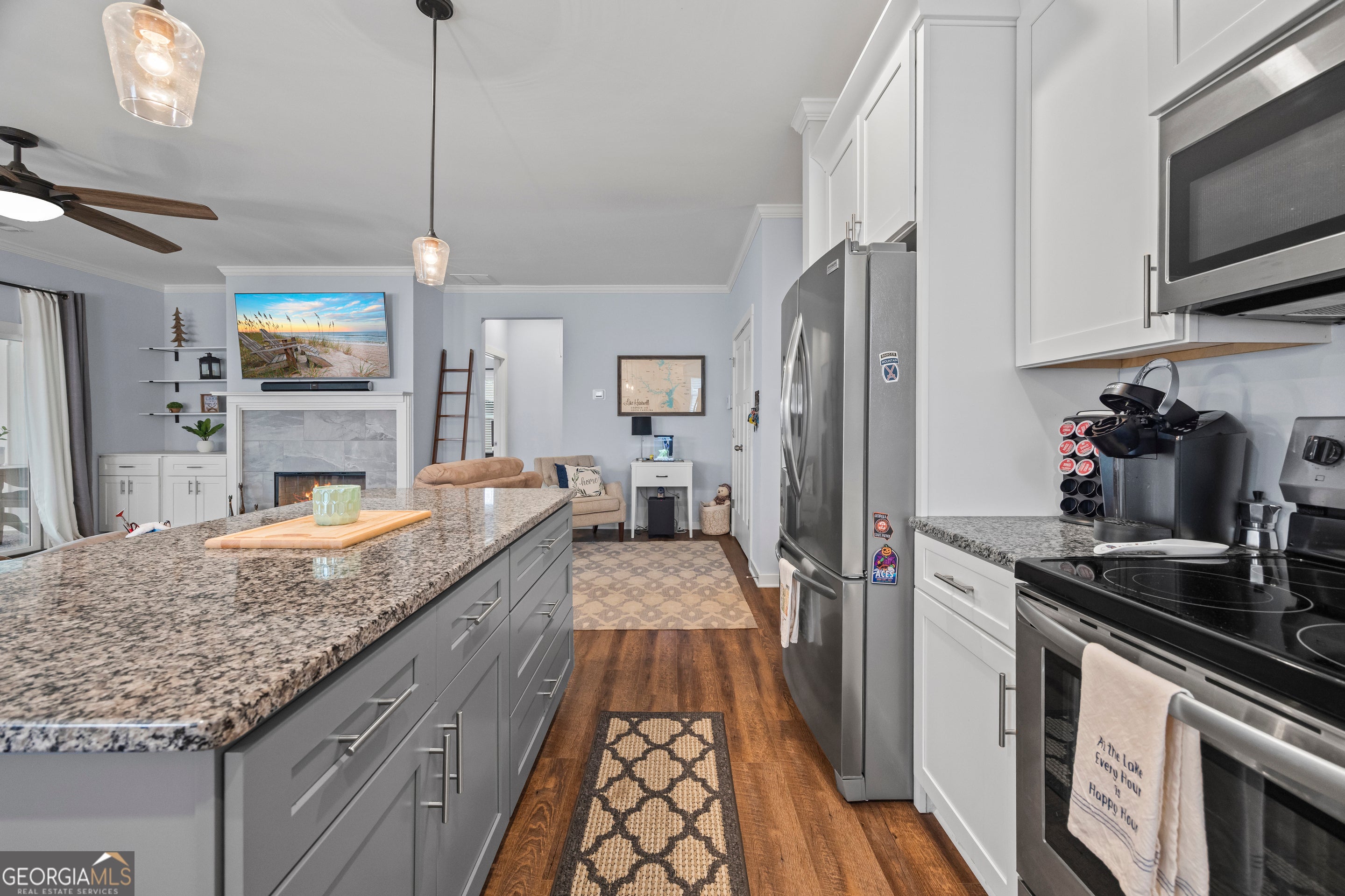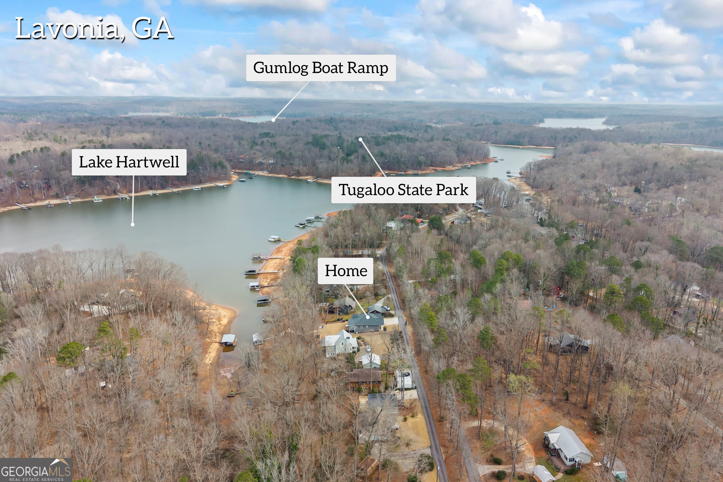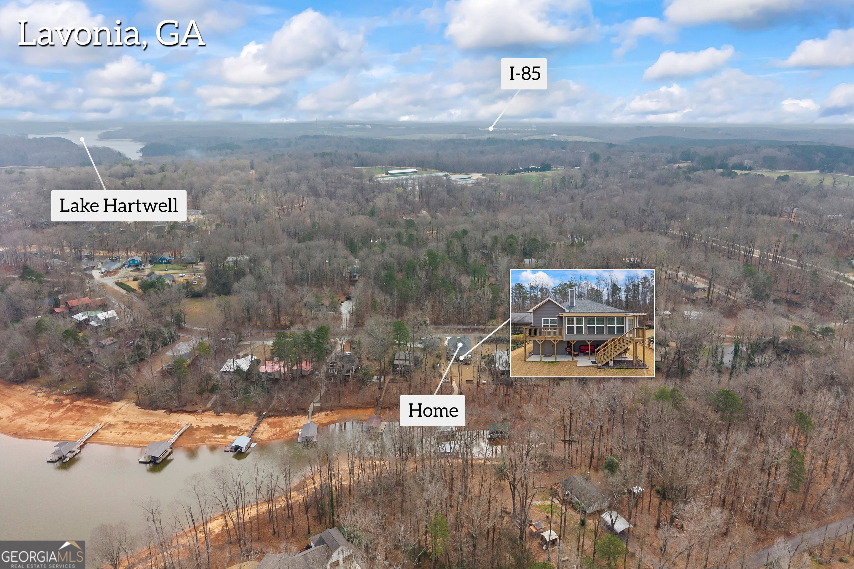 Ready for Lake Living? This inviting lake home, featuring 2 bedrooms and 2 baths, is just minutes from I-85 in Lavonia. Begin on the cozy front porch, then step inside to an open-concept living area warmed by a fireplace. The kitchen offers granite countertops, a large center island with bar seating, and sleek stainless appliances. An expansive sunroom stretches across the back, showcasing endless lake views. The split-bedroom layout ensures privacy, while the walk-in concreted basement/ crawlspace offers ample storage and a workshop. Outside, enjoy the covered patio, large fire pit area, and sodded yard. Stroll the paved walkway to your single-slip dock in a peaceful cove - your lake life dream awaits!