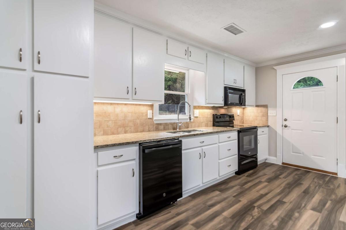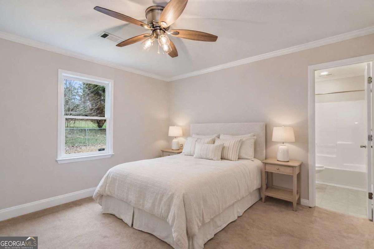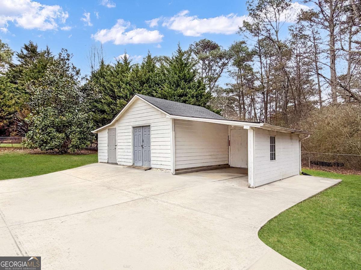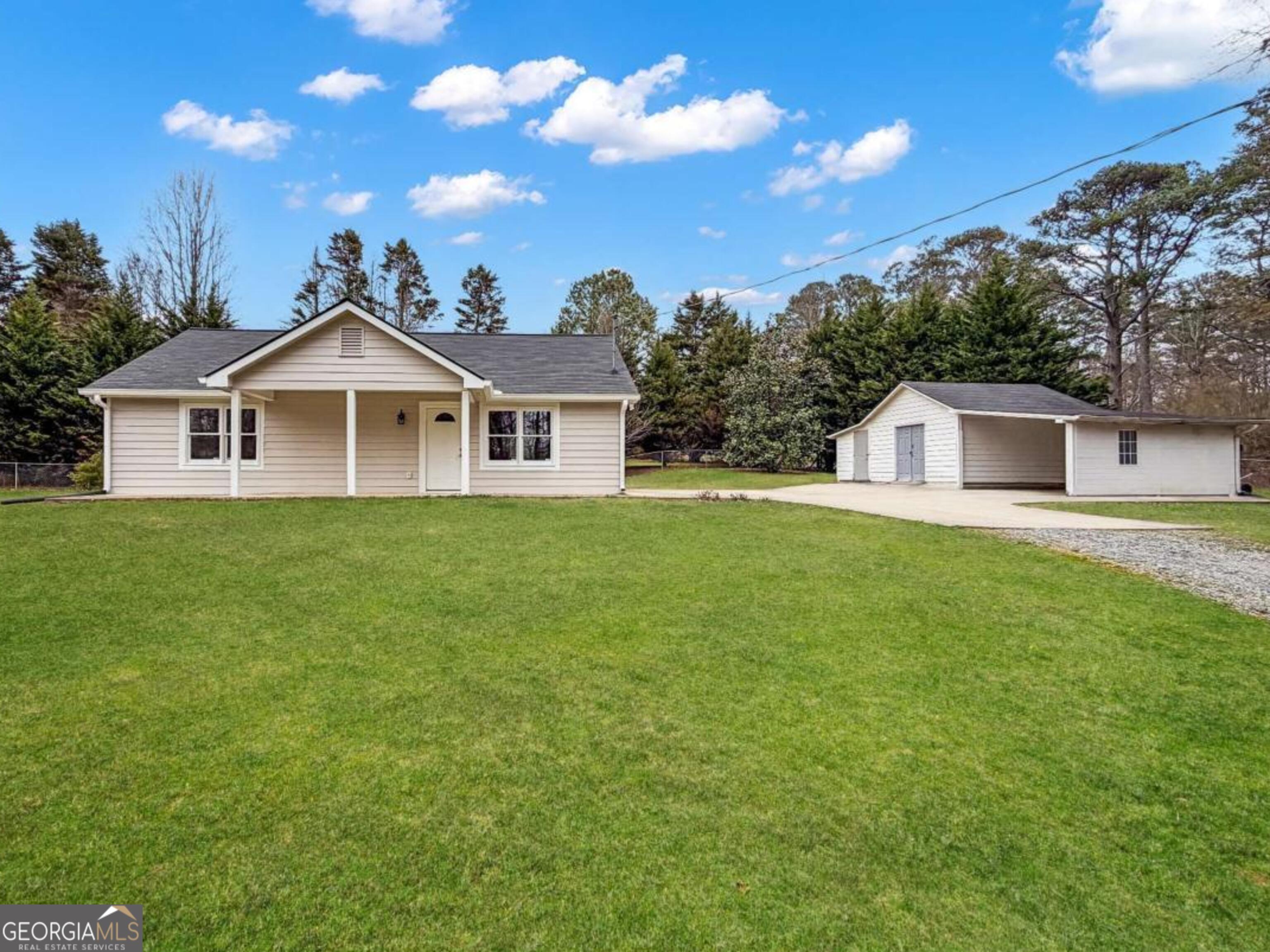 2BR/2BA Creekside Charmer - 1,000 Sq Ft on 1.18 Acres, Only 6 Minutes from North Georgia Premium Outlets! Off all paved roads with a babbling creek running through the property, this charming one-level ranch 2-bedroom, 2-bath, 1,000 sq ft home on 1.18 acres offers the perfect blend of easy one-level living, privacy, convenience, and move-in readiness. The home is wheelchair accessible with step-free entry and a functional single-level layout for ease of mobility, and it features abundant closet space throughout, with both bedrooms offering double closets, essentially providing two master-style suites. Storage is plentiful with an attic above the carport, additional side storage, and a detached outbuilding perfect for tools, lawn equipment, or hobby space. Enjoy a 1-car carport with attic storage above. The beautiful, cleared and flat front and back yard is perfect for pets, relaxation, and outdoor activities, and the property is completely fenced, providing safety and privacy. Inside, fresh paint inside and out in 2026 and tile floors flow throughout the living areas, complemented by a nice-size laundry room offering added convenience and storage. The kitchen features granite countertops, tile backsplash, freshly painted white shaker cabinets, and included electric stove, dishwasher, and microwave. The open living and dining areas feature tile floors, while the first bedroom has carpet, double closets, and shares a full bath with tile floors, granite countertops, and a fiberglass tub. The second bedroom functions as a true primary suite with carpet, double closets, and a private bath with tile floors, granite countertops, and a fiberglass tub. Major improvements provide peace of mind, including a new HVAC unit in 2022, shingle roof replaced in 2019, 7-year-old tile floors, city water with new deep water line, retrimmed windows, exterior gate, and updated septic. Located off all paved roads with no HOA, no rules, and no covenants or restrictions, this home offers easy access to GA-400, only 2.3 miles (6 minutes) to North Georgia Premium Outlets and just 9 miles from downtown Dawsonville. Convenient to GA-400 for quick trips to Cumming and Atlanta, yet also close to North Georgia attractions including hiking trails, wineries, Amicalola Falls, and pumpkin patches - a rare combination of serene creekside living and everyday convenience.