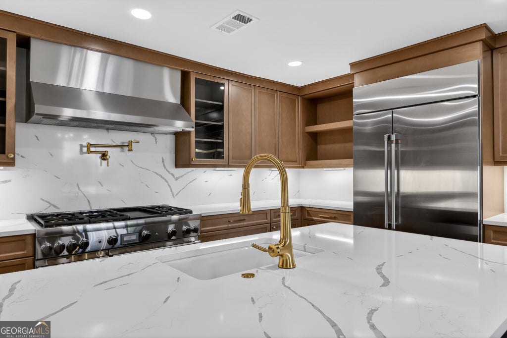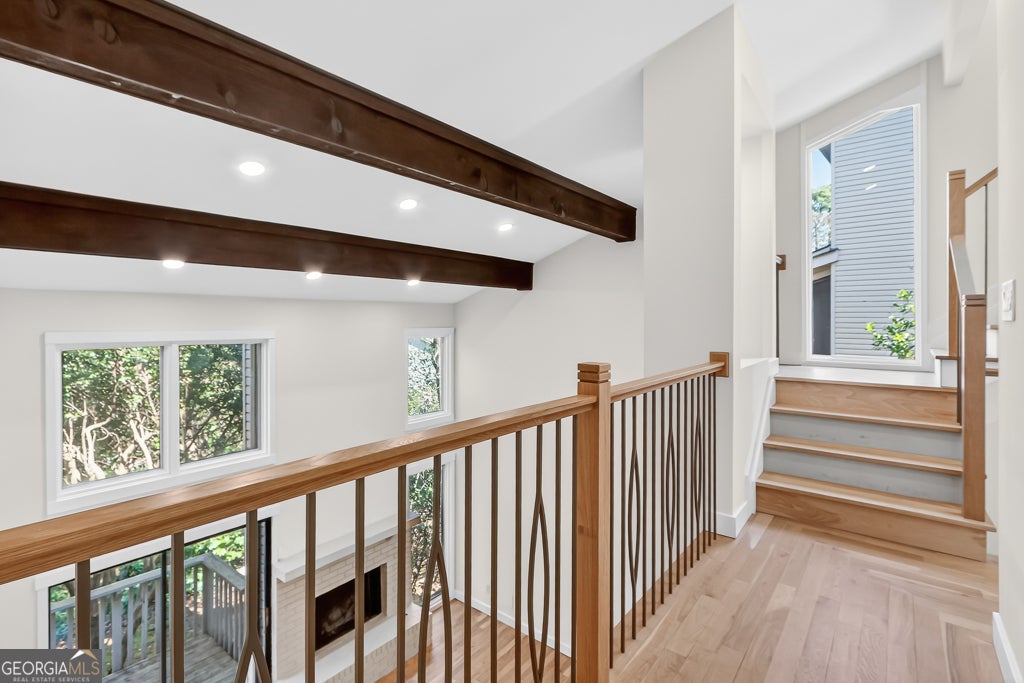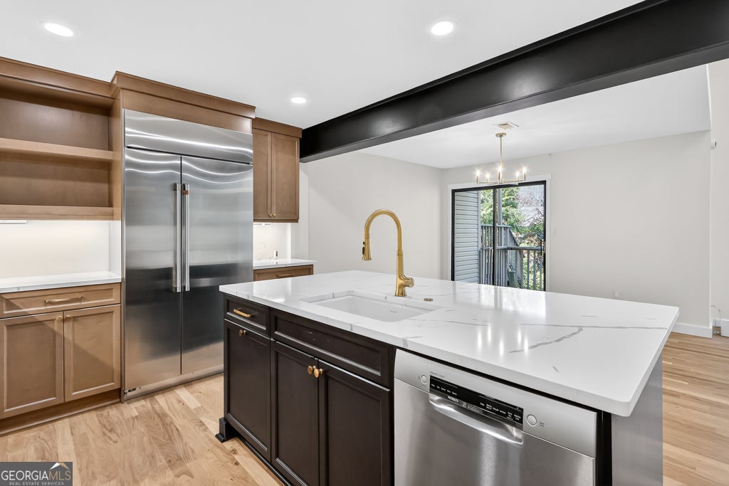 A Hidden Gem in Indian Hills - Completely Reimagined with Over $160K in Designer Renovations Some homes surprise you the moment you walk through the door. This end-unit townhome has been completely reimagined from the inside out, blending thoughtful architecture with more than $160,000 in designer upgrades to create a home that feels far beyond its price point. Step inside and the transformation is immediate. Soaring vaulted ceilings with exposed wood beams draw your eyes upward while oversized windows flood the living space with natural light. A classic brick fireplace anchors the room, creating a warm focal point, while sliding glass doors open to a private deck-perfect for morning coffee or evening gatherings with friends. At the heart of the home is a kitchen designed to impress. Custom cabinetry surrounds a generous island while a seamless quartz surface flows from countertop to backsplash, creating a clean, modern aesthetic. Gold hardware, a professional six-burner gas range with griddle, pot filler, and built-in refrigerator complete a space that feels both luxurious and highly functional. Upstairs, a beautifully rebuilt staircase with custom wood and iron railings leads to spacious bedrooms and a built-in bookcase ideal for a home office or quiet reading space. The primary suite offers a spa-inspired retreat featuring a floor-to-ceiling herringbone tile shower, updated vanity, and brushed gold fixtures. A secondary bath with double vanity, elegant arched mirrors, and matching designer finishes offers an equally refined experience for family or guests. Behind the beauty lies an equally impressive list of improvements. This home has been thoughtfully rebuilt with a new plumbing system, new drywall throughout, updated electrical and lighting, and structural beam and column work, offering peace of mind for years to come. New hardwood flooring flows throughout the home, every room has been freshly painted, and the garage features an epoxy-coated floor. Located within the Indian Hills community of East Cobb, this home is zoned for the highly regarded Walton High School district and is just a short walk to East Side Elementary School. Shopping, dining, and entertainment at The Avenue East Cobb are only minutes away. For the buyer who appreciates design, craftsmanship, and value, this home offers something rare: a completely renovated space where every detail has already been done for you.