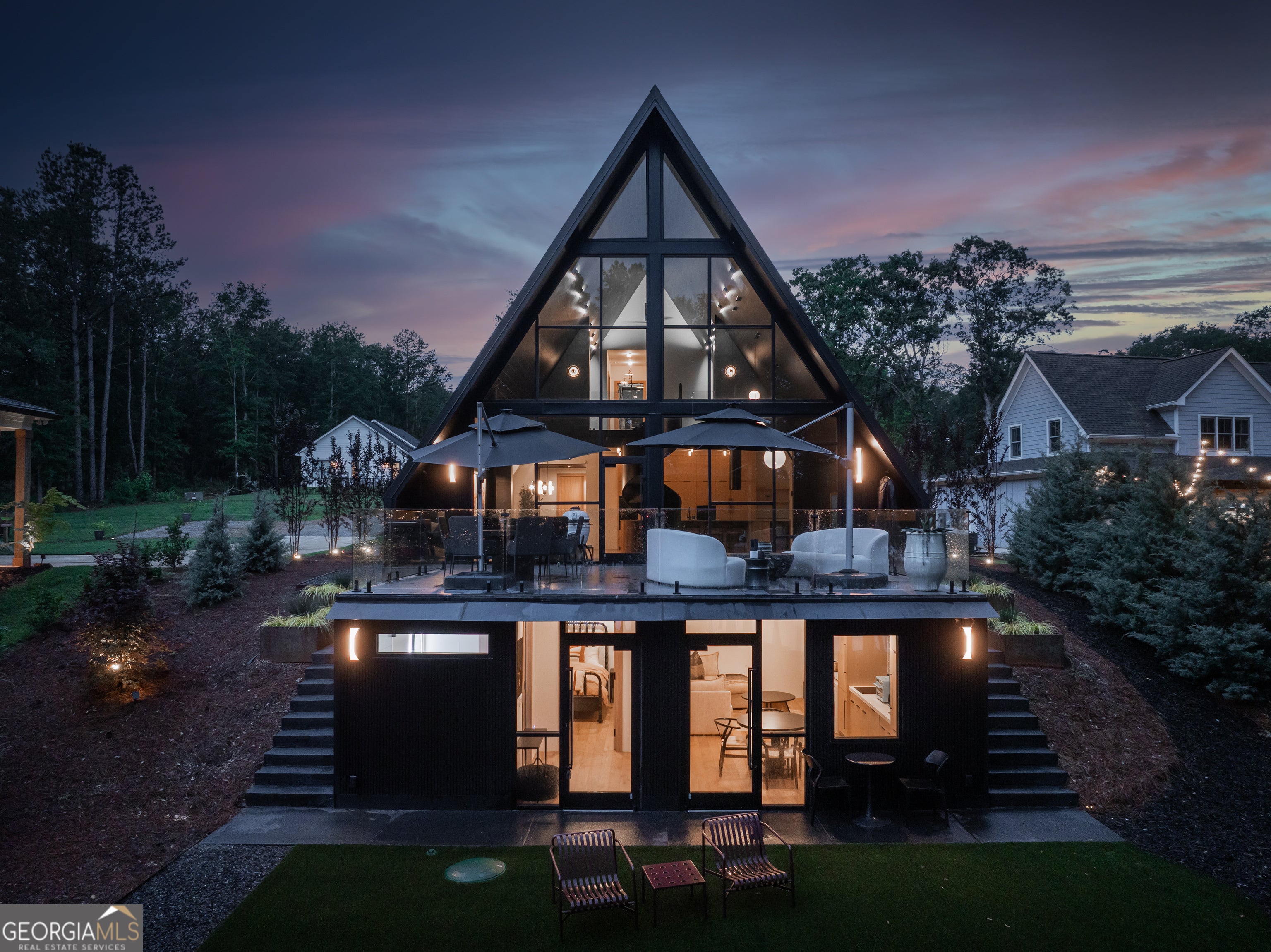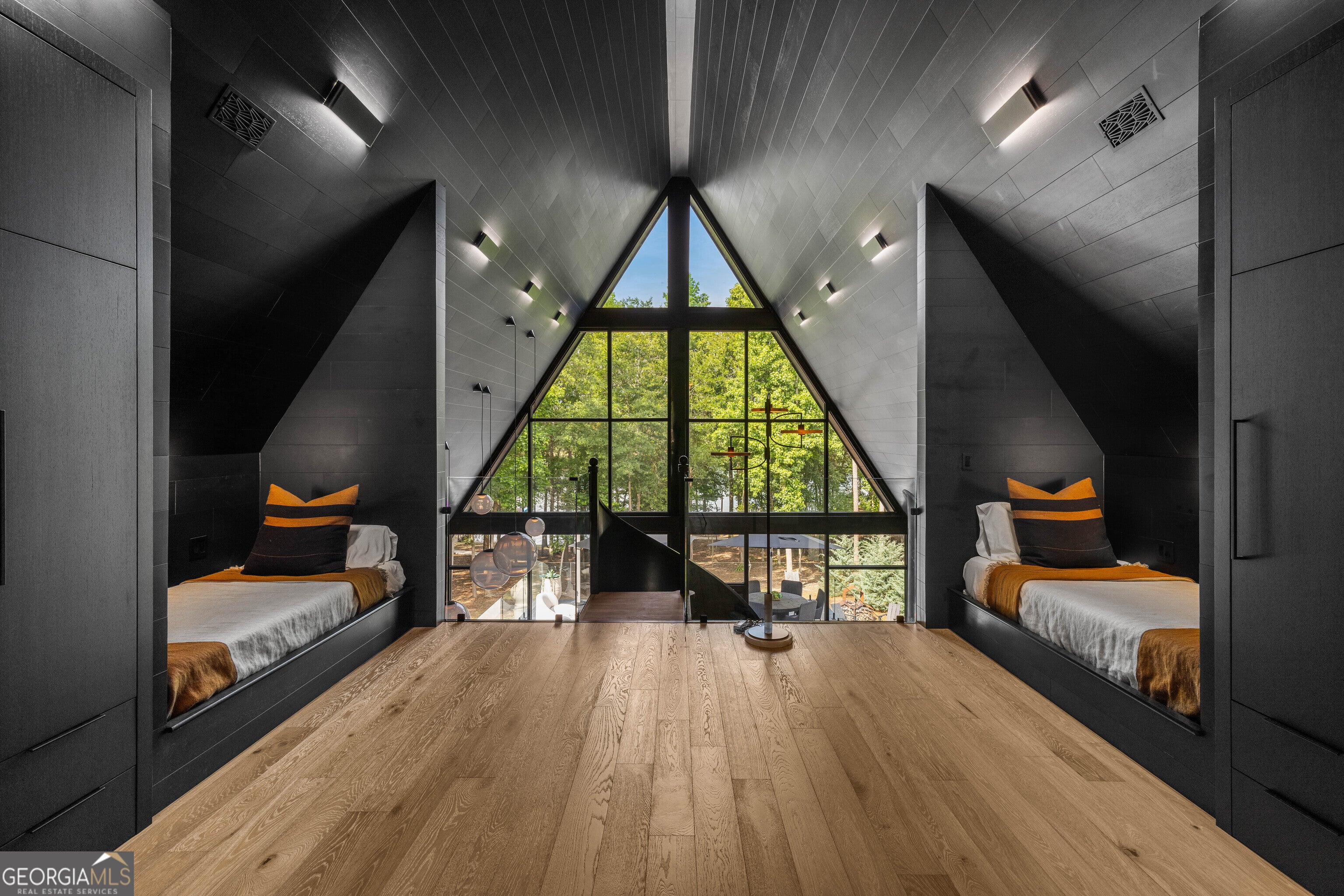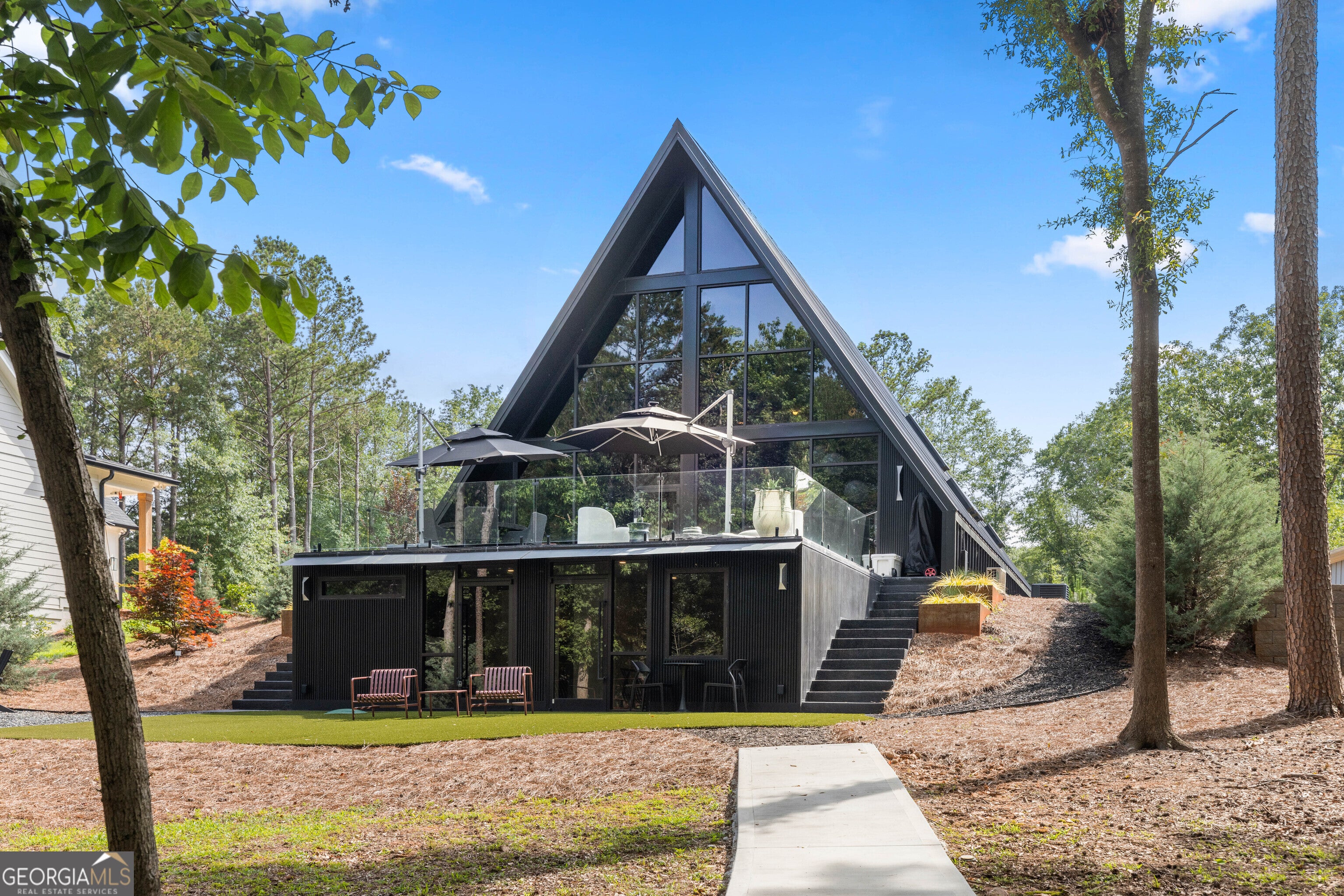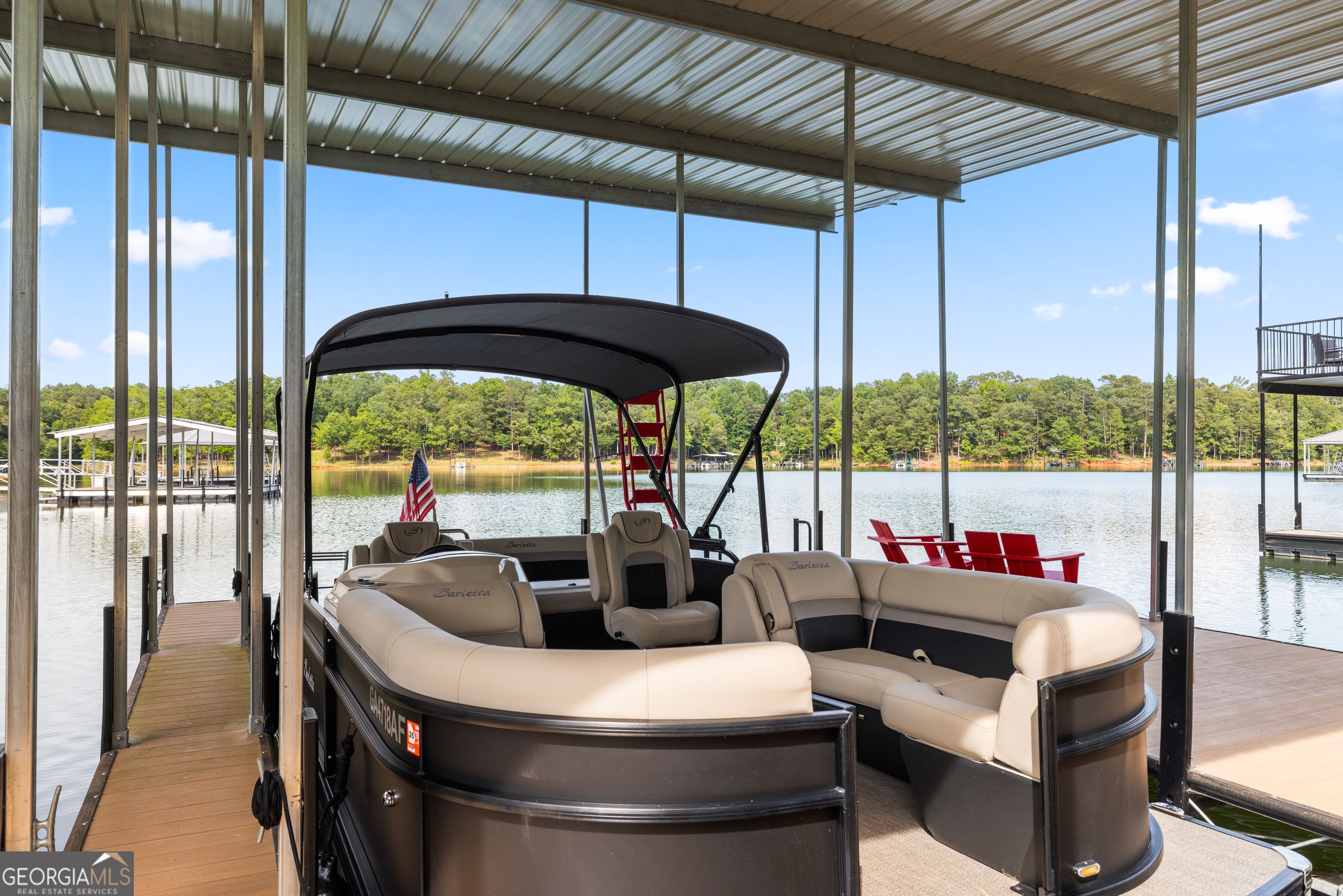 Striking Modern A-Frame on Deep Water Lake Hartwell Set on .77 private acres along the peaceful shoreline of Lake Hartwell, this architecturally stunning 2022 custom-built A-frame offers a rare blend of modern design and effortless lake living. Thoughtfully created by award-winning interior designers, this four bedroom, four bathroom residence spans more than 3,000 square feet and is unlike anything else on the lake. The moment you enter, soaring cathedral ceilings, walls of glass, and an open layout draw your eye to sweeping water views. Natural light fills the home, creating a seamless connection between indoor spaces and the outdoors. The chef's kitchen is both beautiful and functional, featuring leathered quartzite countertops, premium Fisher & Paykel appliances, a built-in refrigerator and freezer, and a dedicated coffee and espresso station designed for everyday enjoyment and entertaining. At the heart of the home, a custom sunken conversation pit and mid-century inspired fireplace create an inviting gathering space. Storage has been intelligently designed throughout, including a custom modern dog crate that blends effortlessly with the home's aesthetic. The main level offers two spacious bedrooms and two spa-inspired bathrooms, each with direct walk-out access to a turfed lawn area that provides privacy while staying connected to the outdoors. A striking custom spiral staircase leads to the upper level, where the primary suite serves as a private retreat. Vaulted ceilings, panoramic lake views, a hand-hammered copper soaking tub, and a designer bath with floor-to-ceiling tile and separate vanities create a serene and luxurious escape. Also on the upper level is a thoughtfully designed bunk loft with four built-in twin beds, each equipped for private television viewing and headphones, making it ideal for guests or a cozy retreat. The lower level features a fully equipped studio apartment with private entrance, complete with a modern kitchen, living space, bedroom, and full bath. This flexible space is perfect for guests, extended family, or short-term rental opportunities. Just outside, a beautifully positioned fire pit area invites evenings spent enjoying lake views and gathering with friends. Outdoor living is exceptional, with an expansive deck designed for dining, entertaining, or relaxing under the stars. A gentle, level pathway leads to a deep water cove and a brand-new double-slip boat dock with composite decking and a sun platform, offering easy access to boating, swimming, and all that Lake Hartwell has to offer. Electric vehicle owners will appreciate two NACS plugs with dedicated 30-amp circuits for convenient charging. Every detail of this home reflects refined craftsmanship, from designer lighting and luxury finishes to uninterrupted lake views from nearly every room. Tucked into a private cove yet conveniently located near Hartwell Marina, dining, shopping, and recreation, this is a rare opportunity to own a truly distinctive Lake Hartwell retreat. Schedule your private showing and experience modern lakefront living at its finest. This home is being sold fully furnished so that you can move right in and enjoy true luxury living on Lake Hartwell.