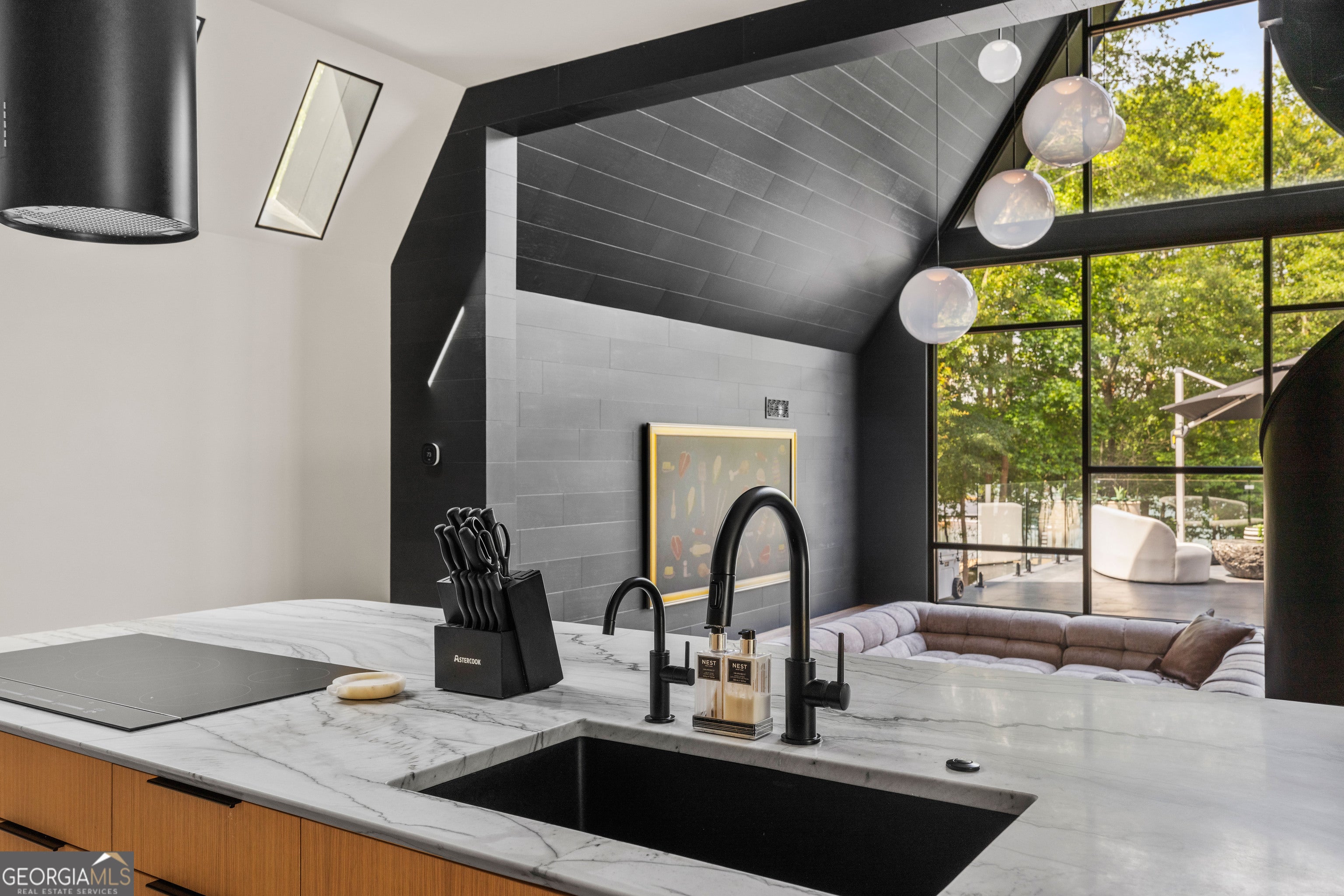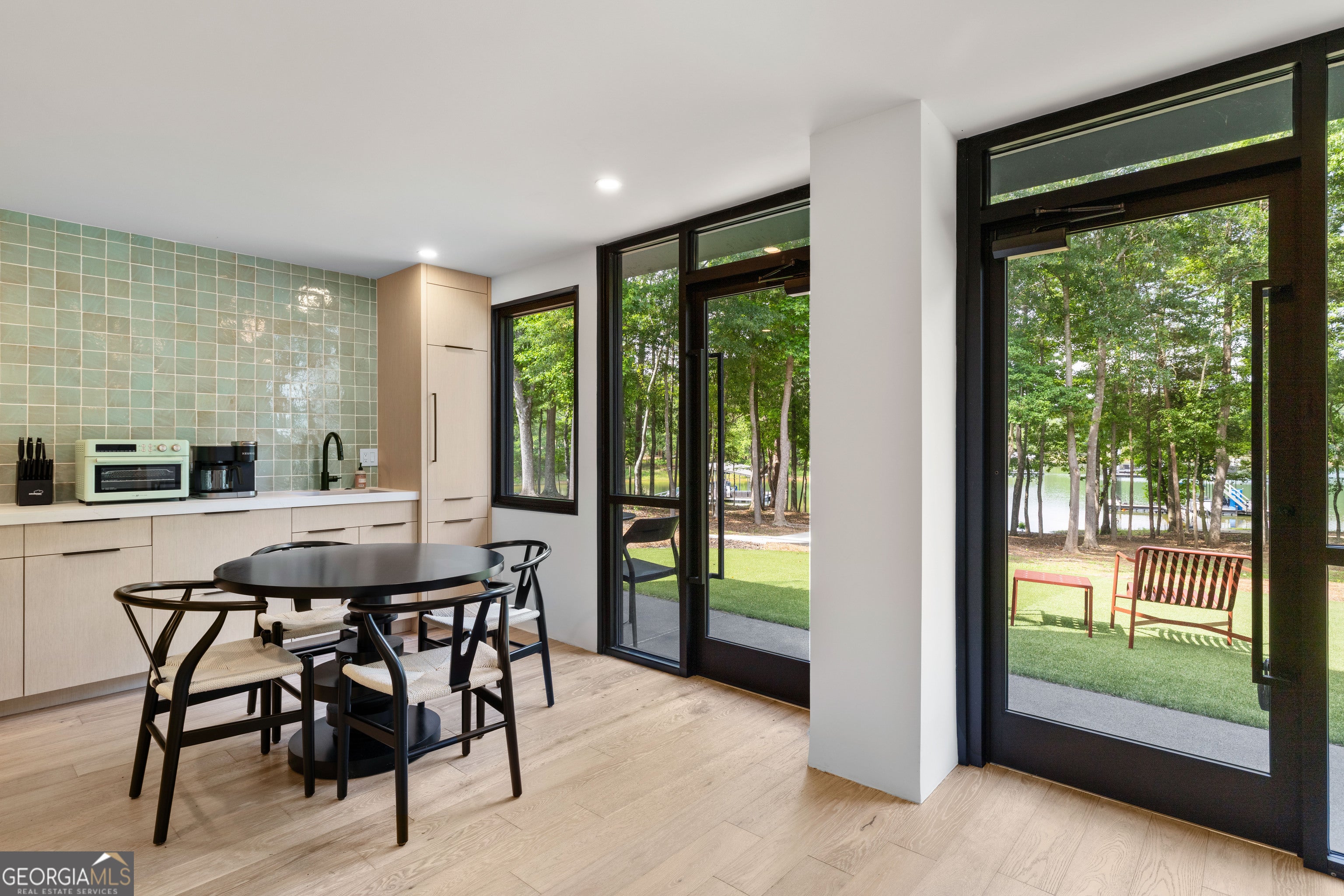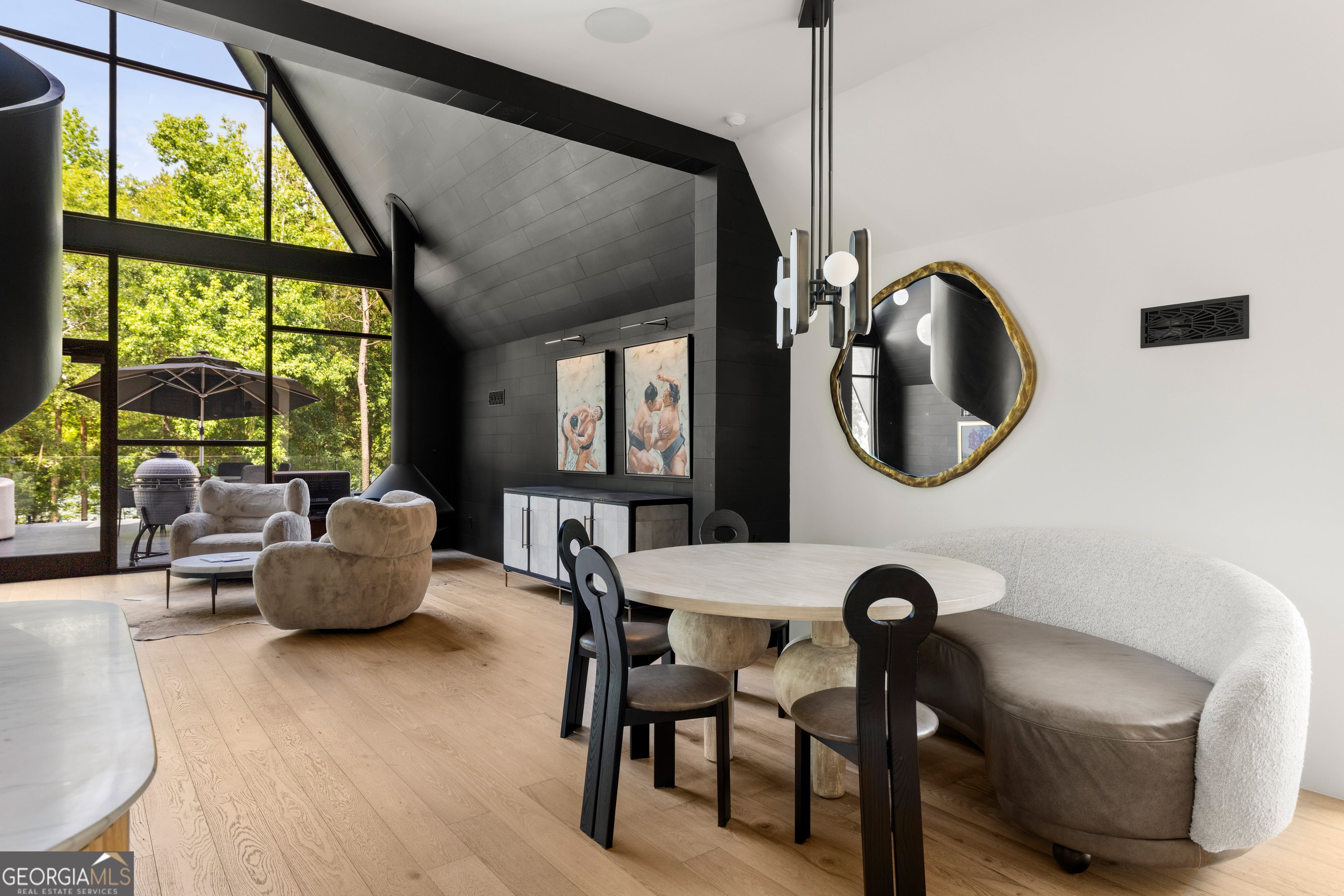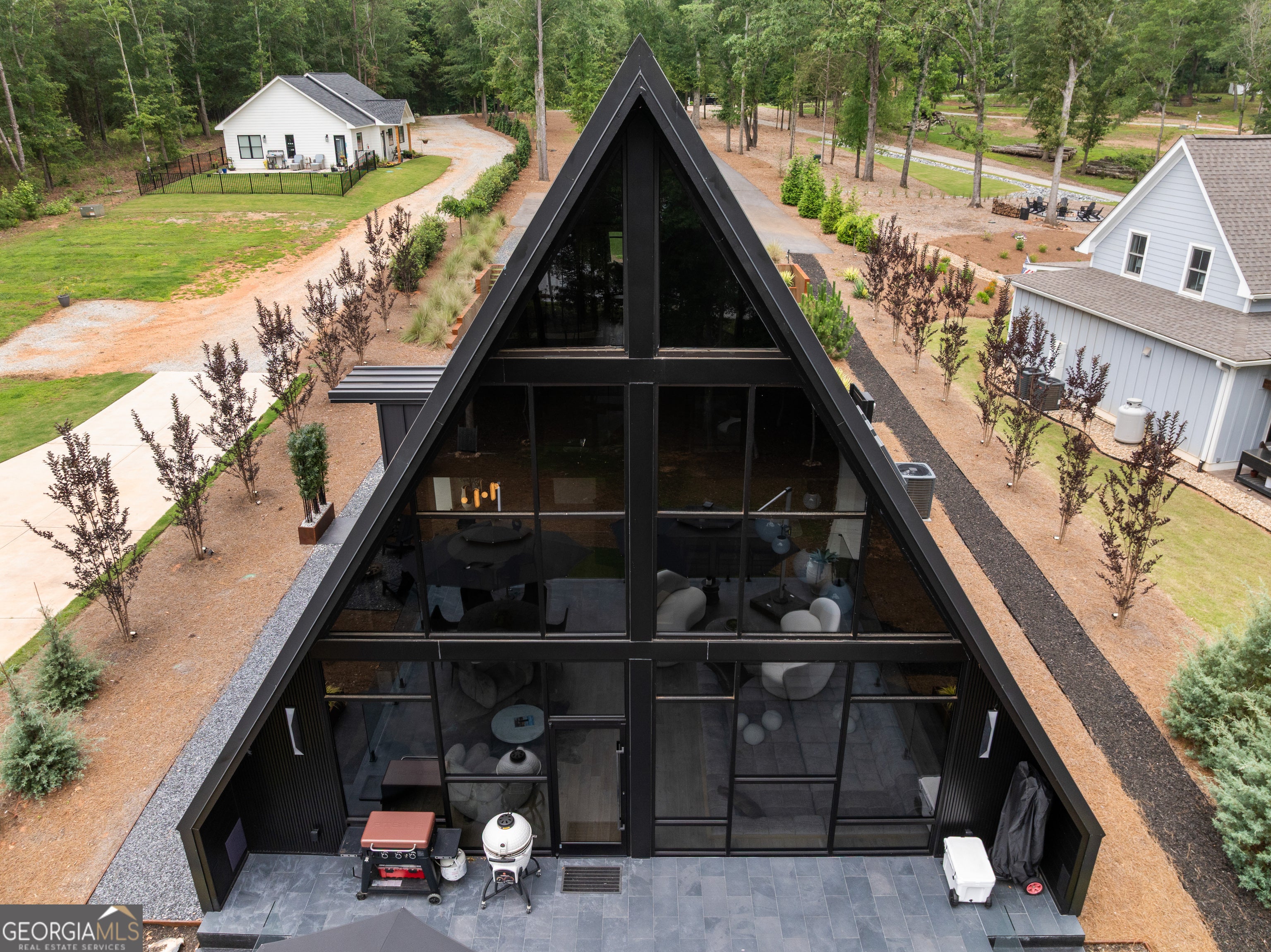 Striking Modern A-Frame on Deep Water Lake Hartwell Set on .77 private acres along the peaceful shoreline of Lake Hartwell, this architecturally stunning 2022 custom-built A-frame offers a rare blend of modern design and effortless lake living. Thoughtfully created by award-winning interior designers, this four bedroom, four bathroom residence spans more than 3,000 square feet and is unlike anything else on the lake. The moment you enter, soaring cathedral ceilings, walls of glass, and an open layout draw your eye to sweeping water views. Natural light fills the home, creating a seamless connection between indoor spaces and the outdoors. The chef's kitchen is both beautiful and functional, featuring leathered quartzite countertops, premium Fisher & Paykel appliances, a built-in refrigerator and freezer, and a dedicated coffee and espresso station designed for everyday enjoyment and entertaining. At the heart of the home, a custom sunken conversation pit and mid-century inspired fireplace create an inviting gathering space. Storage has been intelligently designed throughout, including a custom modern dog crate that blends effortlessly with the home's aesthetic. The main level offers two spacious bedrooms and two spa-inspired bathrooms, each with direct walk-out access to a turfed lawn area that provides privacy while staying connected to the outdoors. A striking custom spiral staircase leads to the upper level, where the primary suite serves as a private retreat. Vaulted ceilings, panoramic lake views, a hand-hammered copper soaking tub, and a designer bath with floor-to-ceiling tile and separate vanities create a serene and luxurious escape. Also on the upper level is a thoughtfully designed bunk loft with four built-in twin beds, each equipped for private television viewing and headphones, making it ideal for guests or a cozy retreat. The lower level features a fully equipped studio apartment with private entrance, complete with a modern kitchen, living space, bedroom, and full bath. This flexible space is perfect for guests, extended family, or short-term rental opportunities. Just outside, a beautifully positioned fire pit area invites evenings spent enjoying lake views and gathering with friends. Outdoor living is exceptional, with an expansive deck designed for dining, entertaining, or relaxing under the stars. A gentle, level pathway leads to a deep water cove and a brand-new double-slip boat dock with composite decking and a sun platform, offering easy access to boating, swimming, and all that Lake Hartwell has to offer. Electric vehicle owners will appreciate two NACS plugs with dedicated 30-amp circuits for convenient charging. Every detail of this home reflects refined craftsmanship, from designer lighting and luxury finishes to uninterrupted lake views from nearly every room. Tucked into a private cove yet conveniently located near Hartwell Marina, dining, shopping, and recreation, this is a rare opportunity to own a truly distinctive Lake Hartwell retreat. Schedule your private showing and experience modern lakefront living at its finest. This home is being sold fully furnished so that you can move right in and enjoy true luxury living on Lake Hartwell.