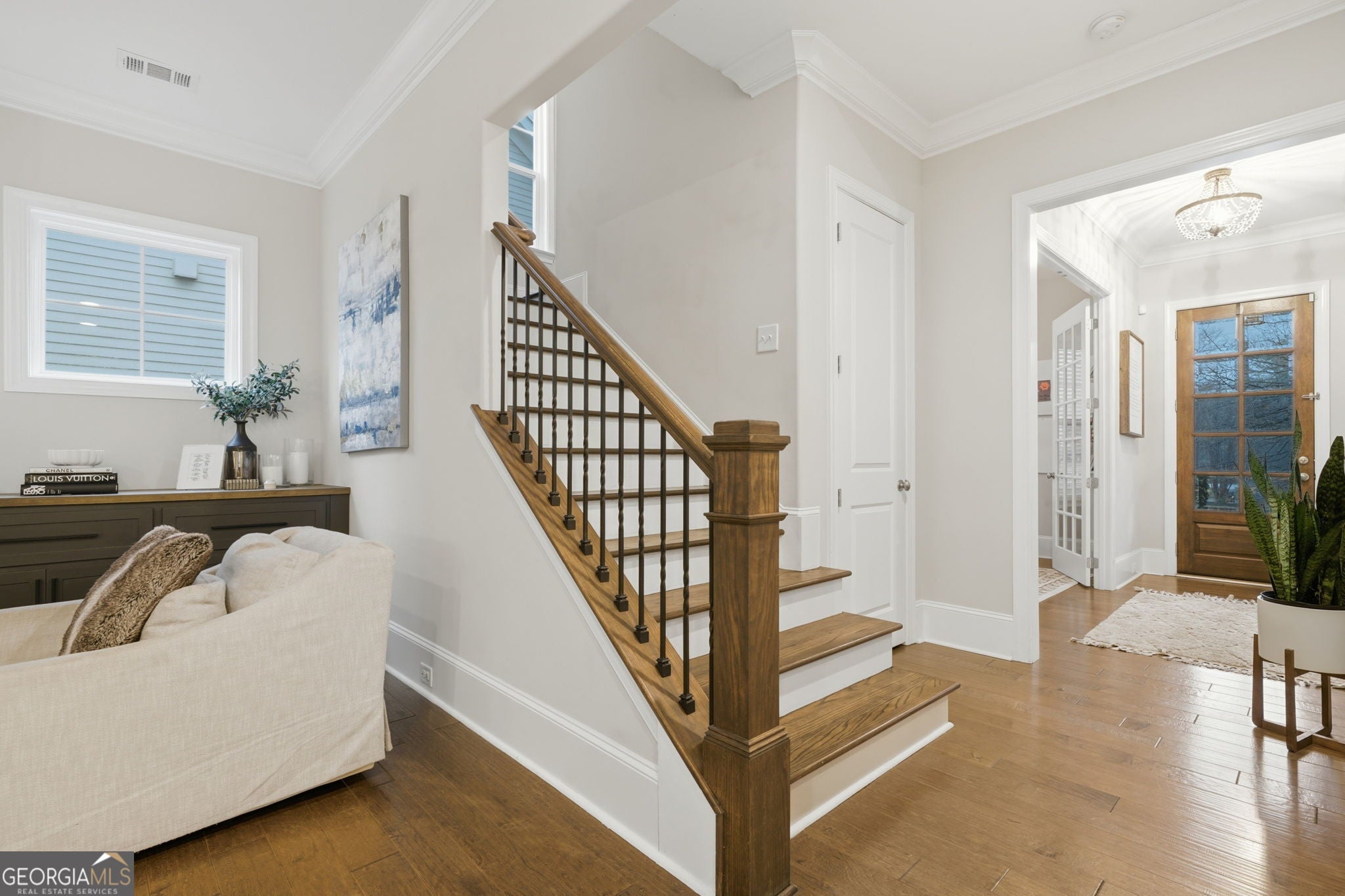 Located at the end of a quiet dead-end cul-de-sac directly across from the 120-acre Wills Park, this rare four-sided brick home offers an exceptional Alpharetta setting with added privacy thanks to wooded private space along one side (no neighboring home) and extra cul-de-sac space for additional guest or homeowner parking. A charming rocking chair front porch overlooks the front lawn and park views, creating a warm and welcoming first impression. Just blocks away is downtown Alpharetta, a highly walkable live-work-play district known for its chef-driven restaurants, boutiques, Town Green, and year-round events. Long considered a centerpiece of the community, Wills Park features a 60-acre equestrian facility, 10 baseball fields, a newly renovated pool, tennis courts, playgrounds, stables, and expansive green space - all just steps from your front door. The entire home features hardwood floors and 10' ceilings are complemented by designer lighting. Addditionally the home features custom closets throughout. Inside, the open floor plan is designed for comfortable everyday living and easy entertaining. The great room features a brick fireplace with custom built-ins and flows into the kitchen with white cabinetry, quartz countertops, generous prep space, and a large island. A separate bar and butler's pantry connect to the spacious dining room, ideal for hosting. A private living room with French doors offers flexibility for a home office, library, or playroom. A dedicated drop zone off the garage offers custom storage for backpacks, coats, and daily essentials, creating a functional and polished transition into the home. Upstairs, four large bedrooms include a well-appointed spacious primary suite with a spa-like bath, soaking tub, separate vanities, and custom his-and-hers closets. One secondary bedroom has a private ensuite bath, while two others share a Jack-and-Jill The third floor adds valuable additional space with a large bonus room, fifth bedroom, full bath, and abundant storage. New roof -2025. Outdoor living includes a screened porch for year-round enjoyment. Enjoy the ease of a townhome lifestyle within a true single-family home. The HOA maintains the lawn and landscaping, allowing for a lock-and-leave lifestyle while preserving the space and privacy you expect. Less than 2 miles from The Avalon and GA400 -with super easy access to Downtown, Buckhead & the Atlanta Airport. This is refined Alpharetta living - steps to Wills Park and moments from downtown.