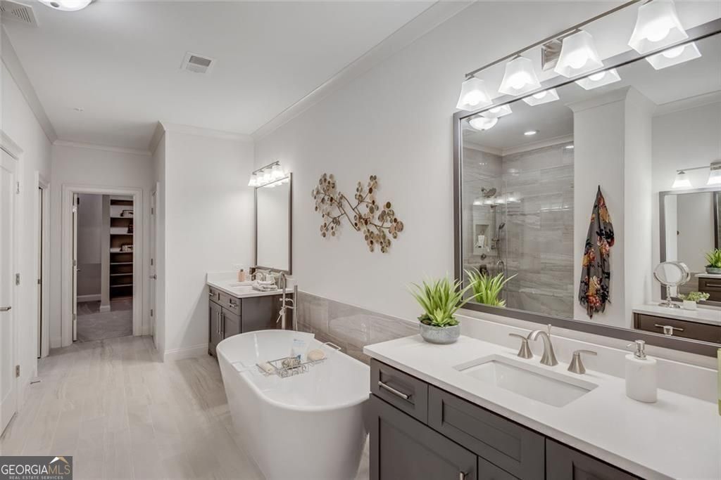 - Interior FeaturesBookcases, Double Vanity, Walk-In Closet(s), Split Bedroom Plan, High Ceilings, Roommate Plan, Separate Shower