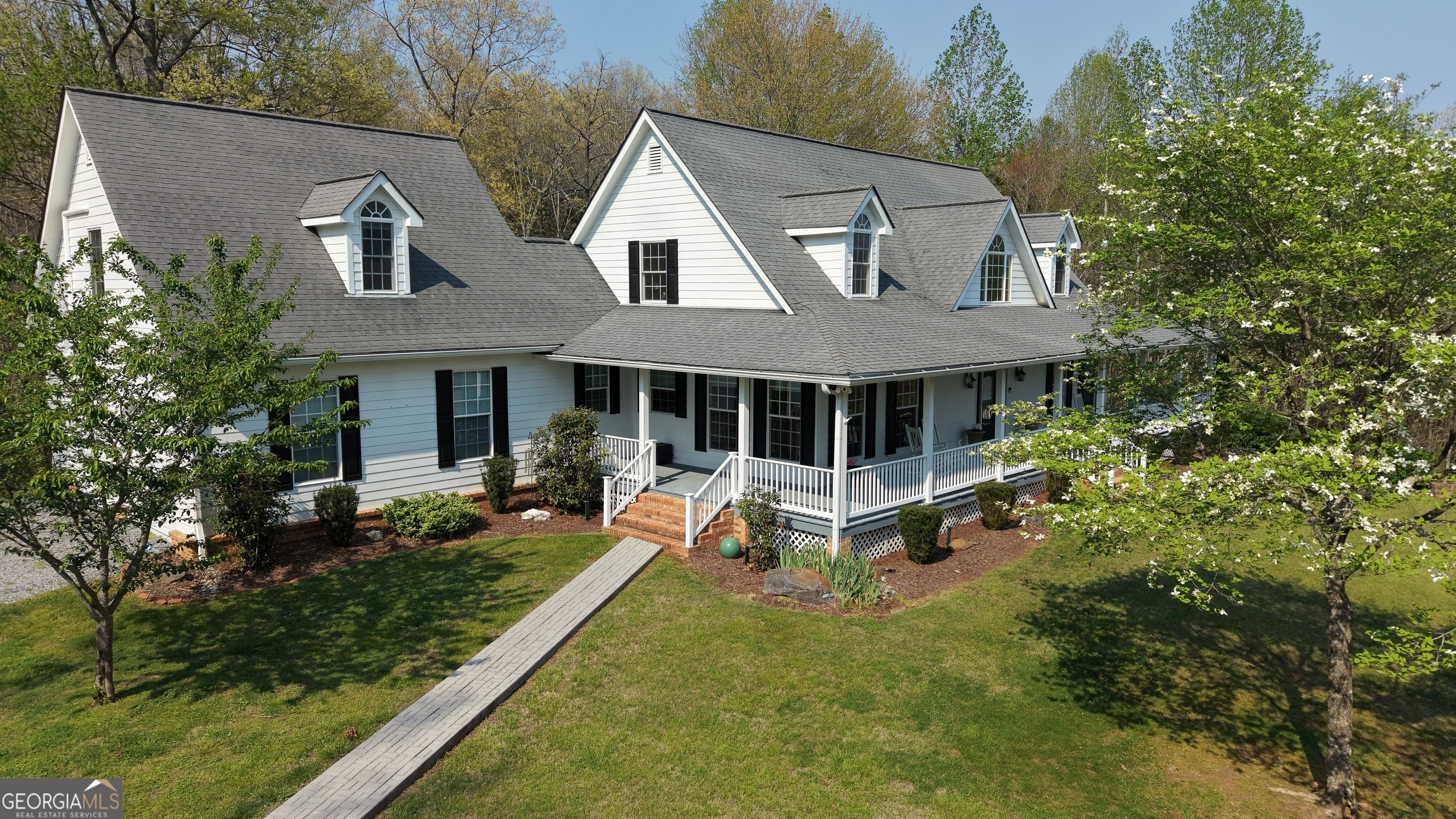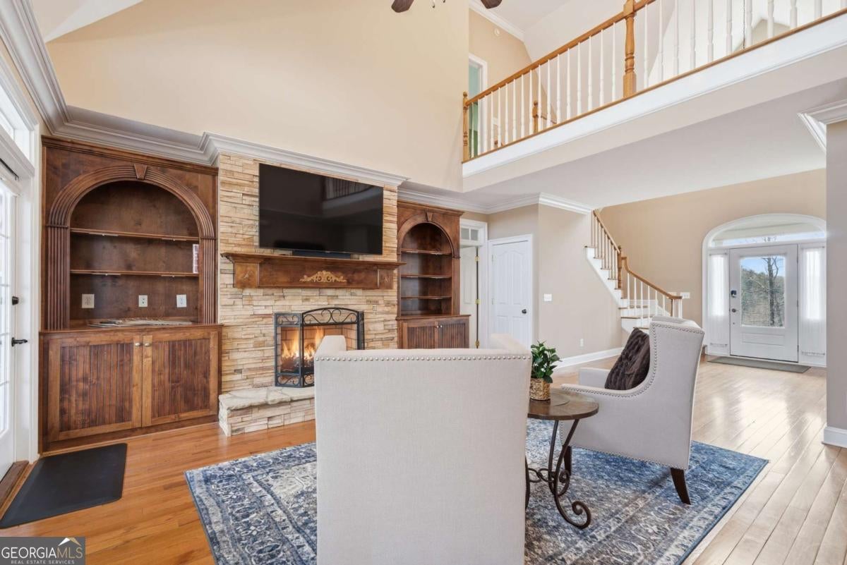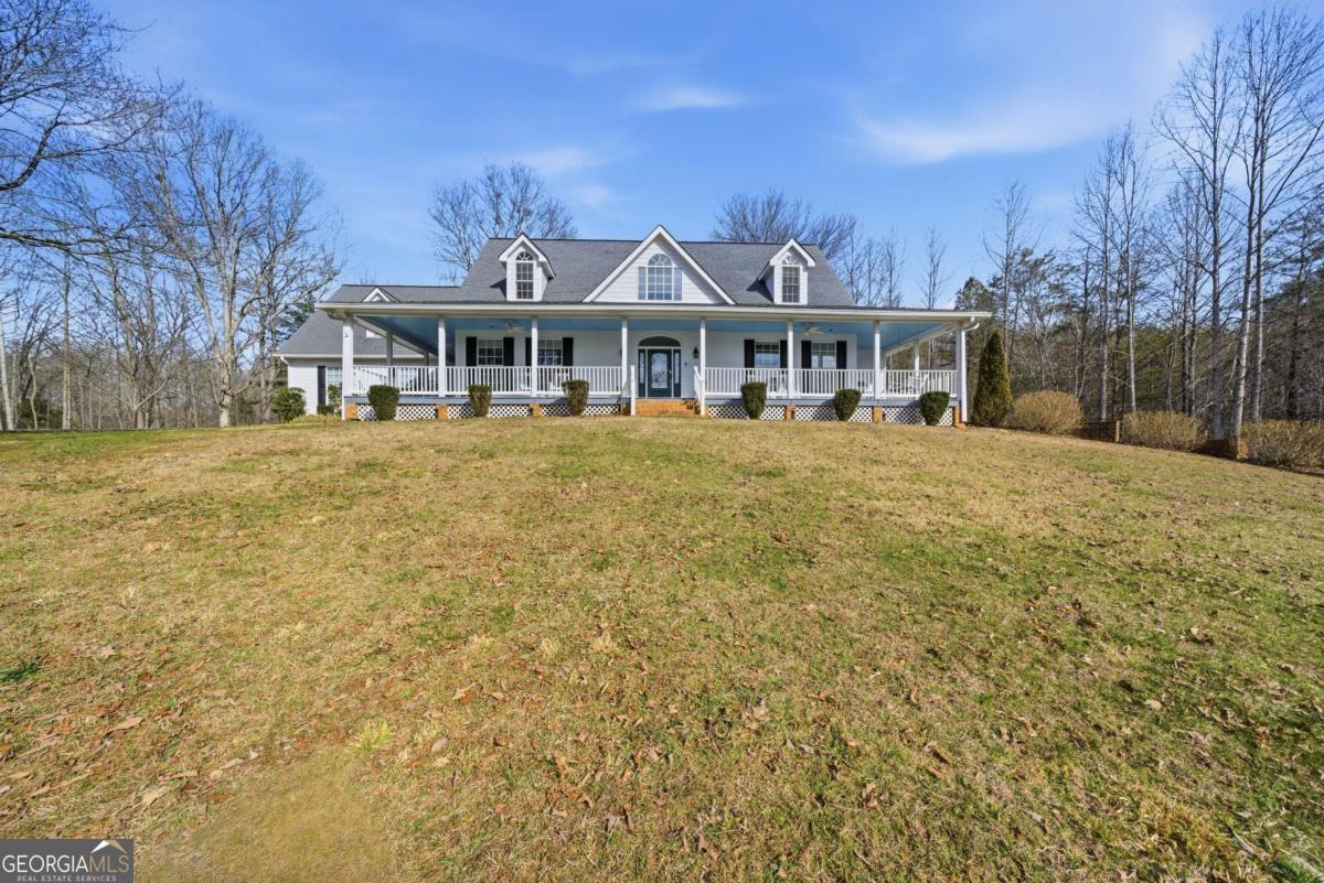 Welcome to 552 Dalrymple Circle - a farmhouse-style estate on over 21 acres in the North Georgia mountains, less than 10 minutes from downtown Ellijay. The winding paved driveway takes you up through the property, transitioning to gravel near the top, and by the time you reach the house, you feel like you've left everything behind. No other homes in sight. Just rolling meadows, mature woods, and mountain views. The first thing that stops you is the front porch. It runs the entire length of the house with a blue-painted ceiling and a porch swing, and it continues around to the back - giving you more outdoor sitting space than most homes have indoor living space. Rocking chairs, sweet tea, mountain air. This is why people move to Ellijay. Inside, the main level features a semi-open floor plan with hardwood floors, transom windows over the doorways, and a stone fireplace flanked by custom wood built-ins. The kitchen has granite countertops, a large center island with seating, stainless steel appliances, rich wood cabinetry, and a butler's pantry for additional storage and prep space. A breakfast nook with bay windows offers a bright, casual spot for morning coffee, and a separate formal dining room handles the bigger gatherings. The primary suite is on the main level, which is a big deal for a home this size. It includes a sitting area, an oversized walk-in closet with built-in organization, and a spa-inspired ensuite with heated floors and a soaking tub. When the tile is warm under your feet on a cold mountain morning, you'll understand why that matters. Upstairs, two guest bedrooms each have their own full ensuite bathrooms, connected by a catwalk. There's also a large 21x23 finished bonus room that's accessible from the garage - making it an ideal home office, studio, or creative space that feels separate from the rest of the house. If you work from home and want a real boundary between work and life, this layout delivers. The fully finished daylight terrace level adds even more versatility. It includes a full bedroom and bathroom, a large living area, and a kitchenette space with French doors opening to the backyard. This could be an in-law suite, a teen retreat, a rental unit, or guest quarters - it functions as its own apartment. Outside, the property is as impressive as the home. Over 21 acres of meadows and woods - usable land that's ready for whatever you envision. There's a custom shed, a carport, a 2-car garage, a garden area, a stone fire pit with custom pavers, and a spot for RV parking. A whole-home generator and underground propane tank round out the list of features that make this property ready for full-time mountain living. 552 Dalrymple Circle works as a primary residence, a mountain retreat, or an income-producing family compound. It's private enough to feel like you're miles from everything, but you're pulling into downtown Ellijay in under 10 minutes. This is the one.