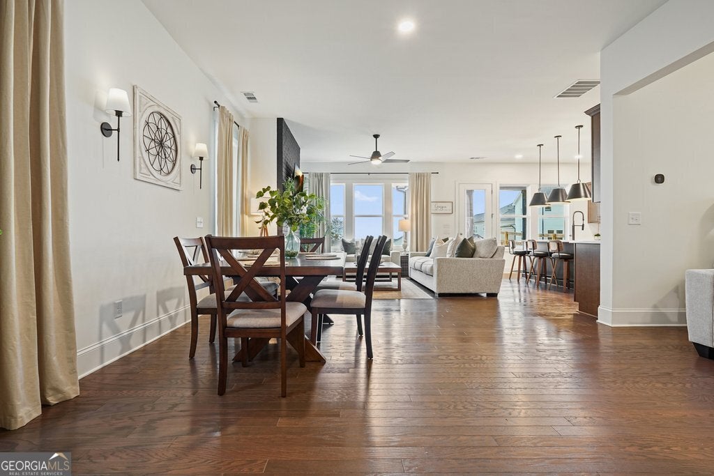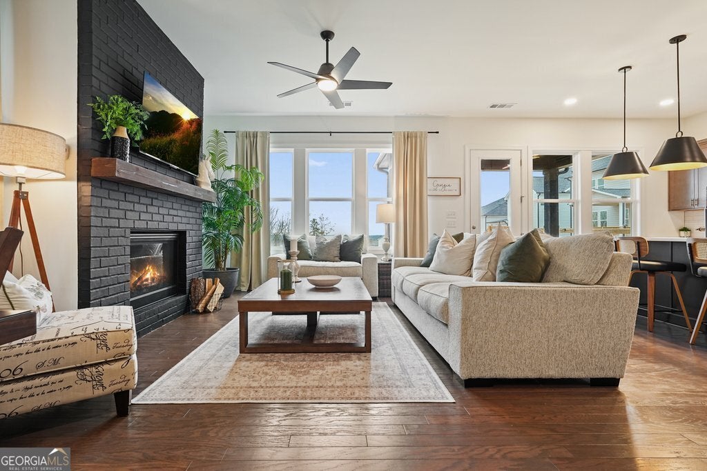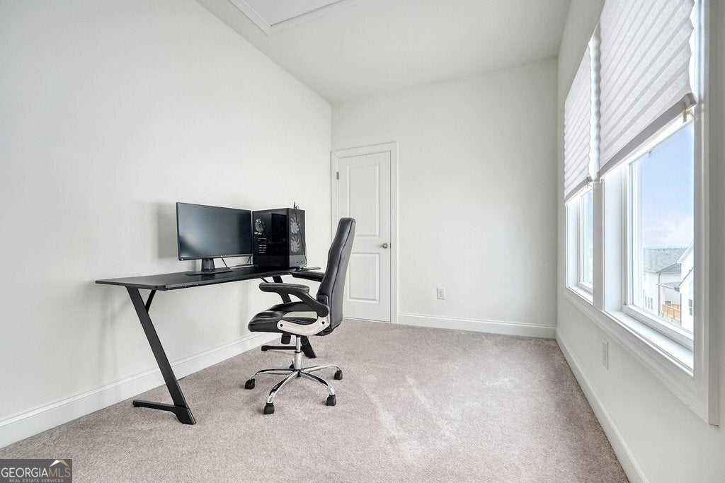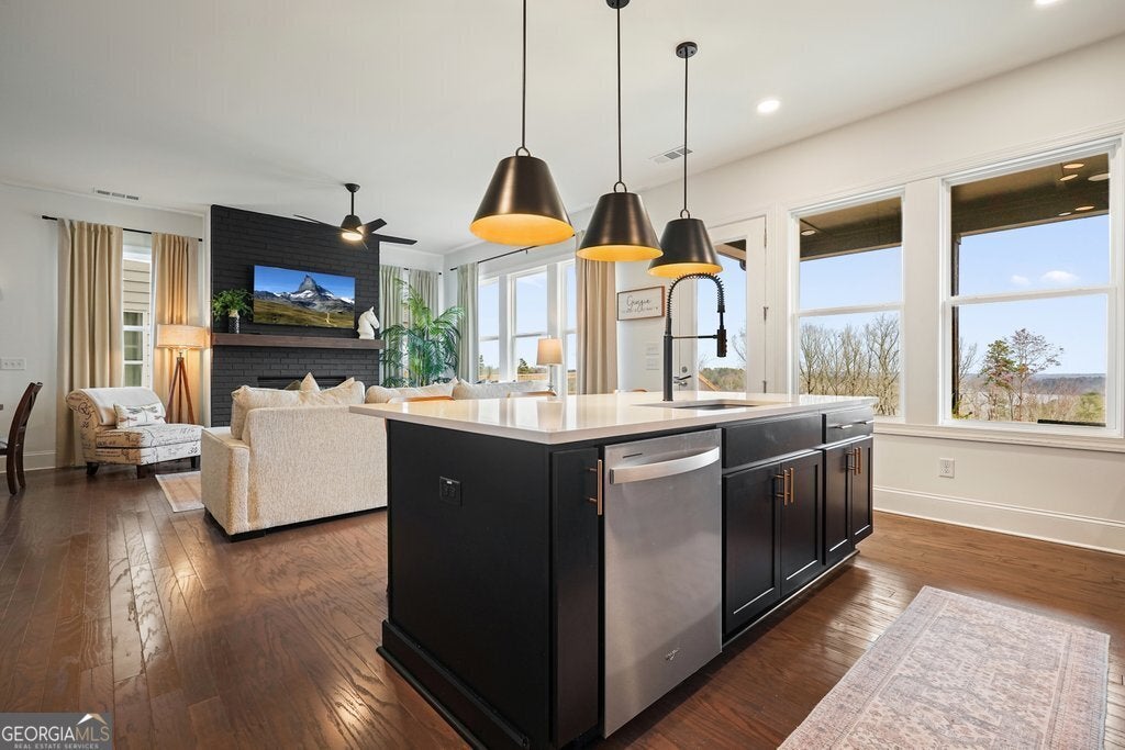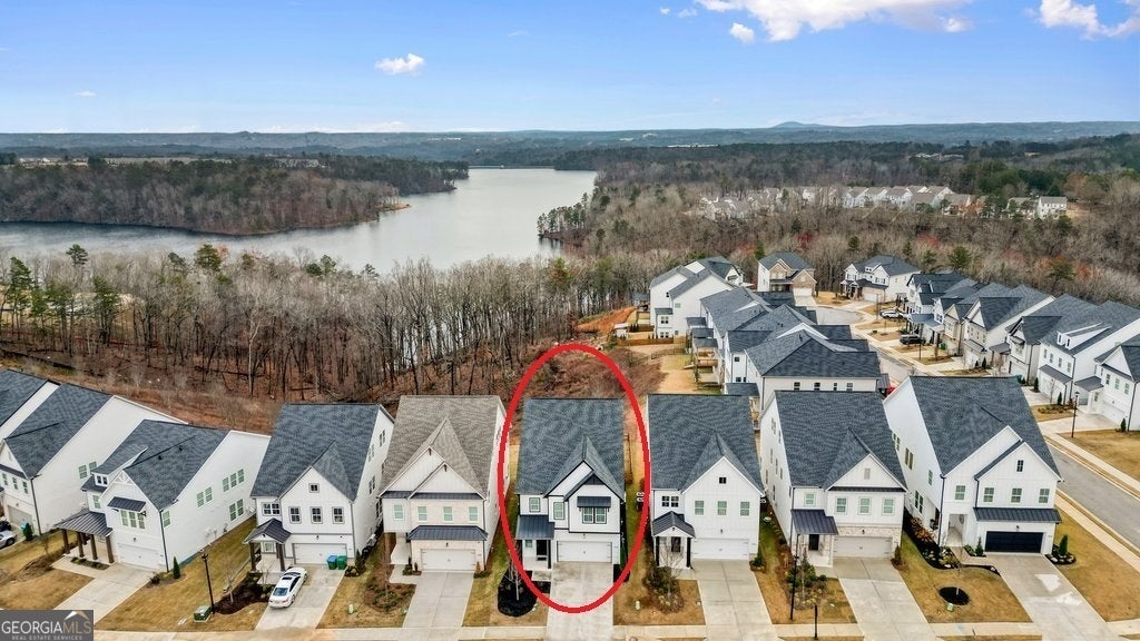 LAKE VIEWS!! Welcome to the Chestatee Farmhouse, a stunning three-level home offering 4 bedrooms and 3.5 baths, thoughtfully designed for modern living and effortless entertaining. This is the only available home in the community with lake views, making it a truly rare opportunity. The main level features a beautifully updated kitchen with a large island, flowing seamlessly into an open-concept great room with a cozy fireplace and a dedicated dining area. A flexible office or bonus room, along with a stylish powder room, completes the first floor. Upstairs on the second level, retreat to the spacious primary suite with a spa-like bath showcasing a soaking tub, double vanity, and a large walk-in closet. Enjoy the convenience of direct access to the laundry room from the primary bedroom. Two additional bedrooms, a shared bath, and a generous loft provide ample space for family or guests. The third level expands your living options with an additional large loft, a fourth bedroom and full bath, plus a dedicated office, perfect for remote work, hobbies, or a private guest suite. Step outside to the covered back porch overlooking the lake and fully fenced backyard, an ideal spot for morning coffee or evening relaxation. Additional highlights include a Level 2 EV charger in the garage, tankless water heater, elegant wall accents in the entryway, hardwood stairs, and smart thermostats on all three floors. Nestled in the prestigious Aurora Ridge at Great Sky, homeowners enjoy resort-style amenities including pools, tennis and pickleball courts, scenic trails, and tranquil water views, all just minutes from Downtown Canton's shopping, dining, and entertainment. This exceptional home blends luxury, functionality, and location. Don't miss your chance to make it yours!