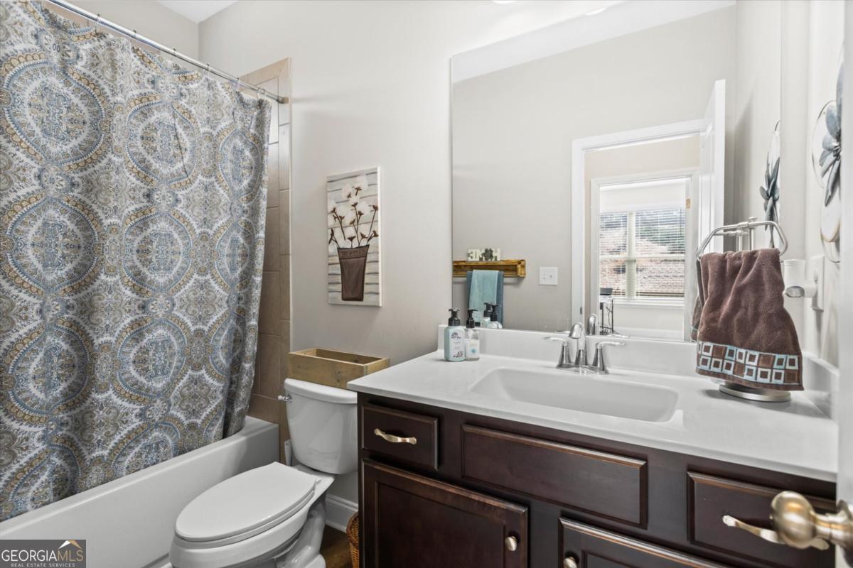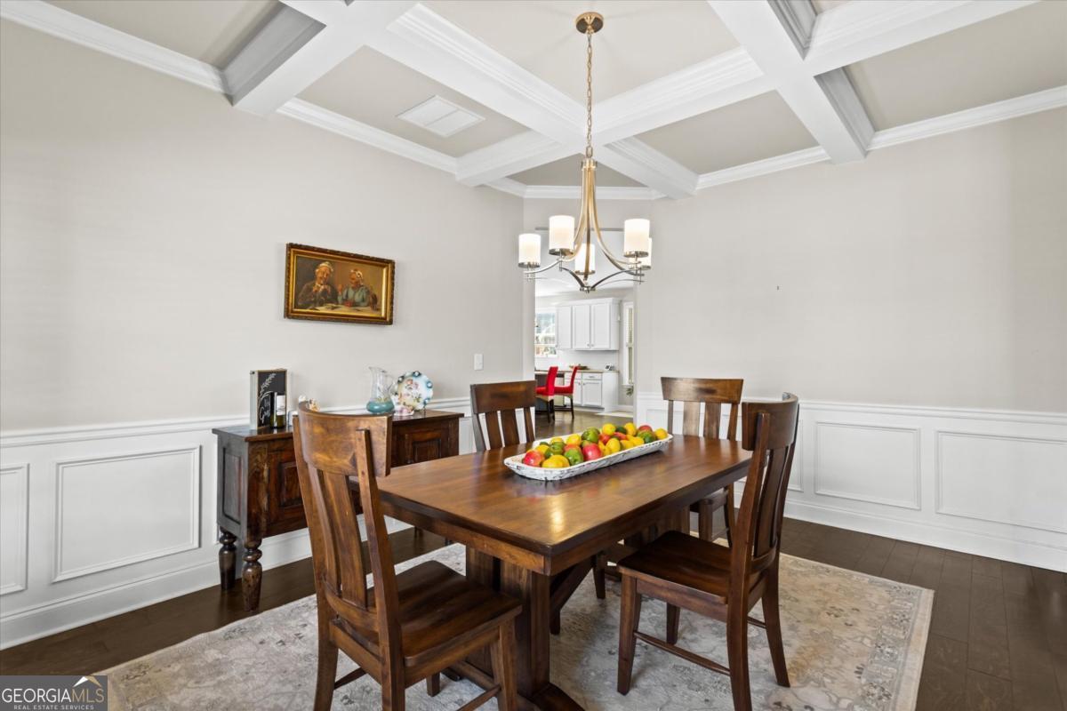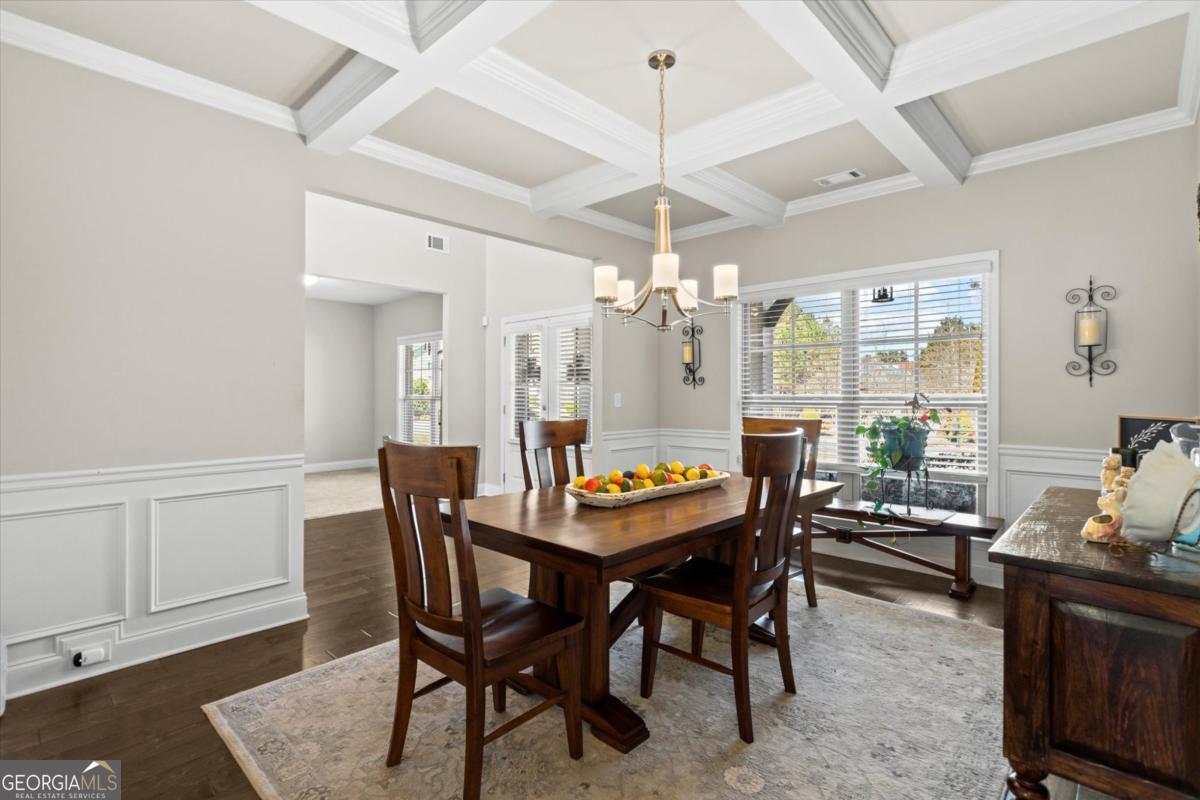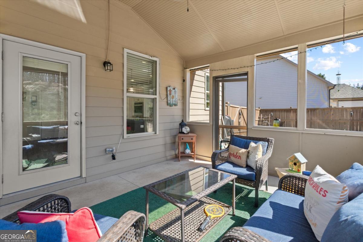 This stunning Rosewood plan in the highly desirable Concord Creek subdivision truly stands out. Thoughtfully designed with both comfort and style in mind, this home features an open and airy floor plan highlighted by a dramatic two-story great room and grand foyer that create an immediate sense of space and elegance. The bright, chef-inspired kitchen is the heart of the home, offering crisp white cabinetry, a spacious walk-in pantry, and an oversized island that overlooks the inviting family room perfect for everyday living and effortless entertaining. A separate formal dining room with beautifully detailed coffered ceilings provides the ideal setting for holiday gatherings and special occasions. Just off the kitchen, step into the screened-in porch a perfect extension of the living space overlooking a private, fenced backyard designed for relaxing evenings or weekend get-togethers.The main level includes a guest bedroom and full bath, offering flexibility for visitors, a home office, or multi-generational living. Upstairs, the expansive primary suite serves as a true retreat with a spa like bathroom and an impressively large walk-in closet. Three additional generously sized bedrooms complete the upper level, including one with its own private en-suite bath.This home is ideally positioned with a desirable northeast-facing orientation, offering beautiful natural light throughout the day. Located in the well maintained Concord Creek community, this home offers convenience to shopping, dining, and everyday essentials, including the North Georgia Premium Outlets, Coal Mountain Town Center, and a variety of restaurants and grocery stores. This is the perfect blend of modern living, thoughtful design, and an unbeatable location.