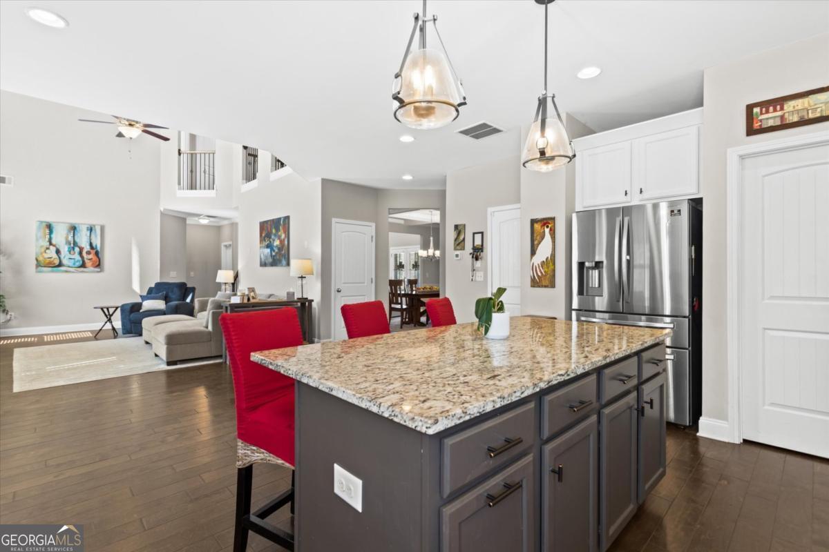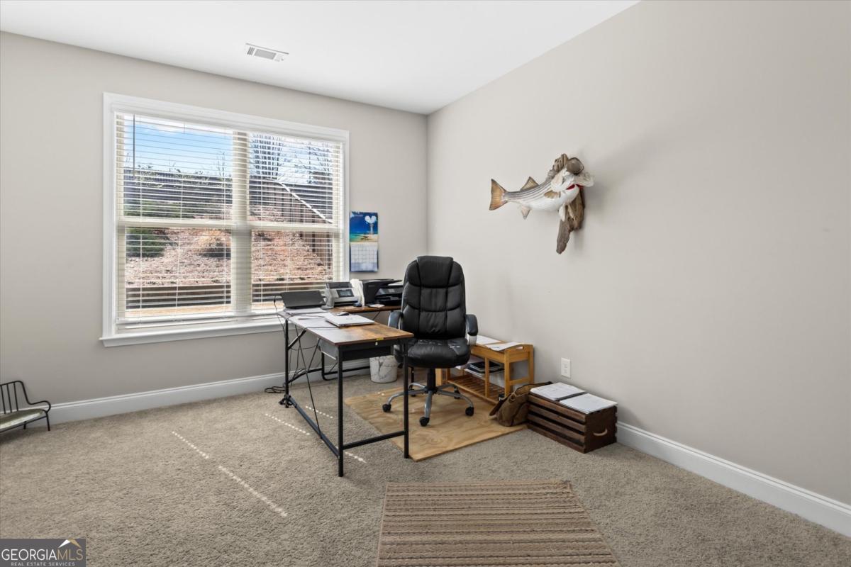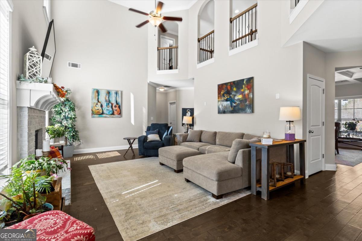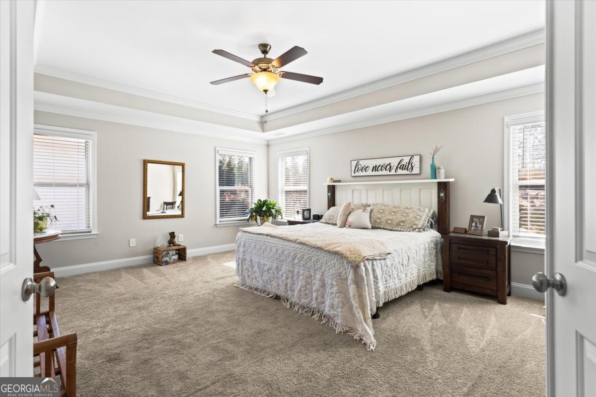 This stunning Rosewood plan in the highly desirable Concord Creek subdivision truly stands out. Thoughtfully designed with both comfort and style in mind, this home features an open and airy floor plan highlighted by a dramatic two-story great room and grand foyer that create an immediate sense of space and elegance. The bright, chef-inspired kitchen is the heart of the home, offering crisp white cabinetry, a spacious walk-in pantry, and an oversized island that overlooks the inviting family room perfect for everyday living and effortless entertaining. A separate formal dining room with beautifully detailed coffered ceilings provides the ideal setting for holiday gatherings and special occasions. Just off the kitchen, step into the screened-in porch a perfect extension of the living space overlooking a private, fenced backyard designed for relaxing evenings or weekend get-togethers.The main level includes a guest bedroom and full bath, offering flexibility for visitors, a home office, or multi-generational living. Upstairs, the expansive primary suite serves as a true retreat with a spa like bathroom and an impressively large walk-in closet. Three additional generously sized bedrooms complete the upper level, including one with its own private en-suite bath.This home is ideally positioned with a desirable northeast-facing orientation, offering beautiful natural light throughout the day. Located in the well maintained Concord Creek community, this home offers convenience to shopping, dining, and everyday essentials, including the North Georgia Premium Outlets, Coal Mountain Town Center, and a variety of restaurants and grocery stores. This is the perfect blend of modern living, thoughtful design, and an unbeatable location.
