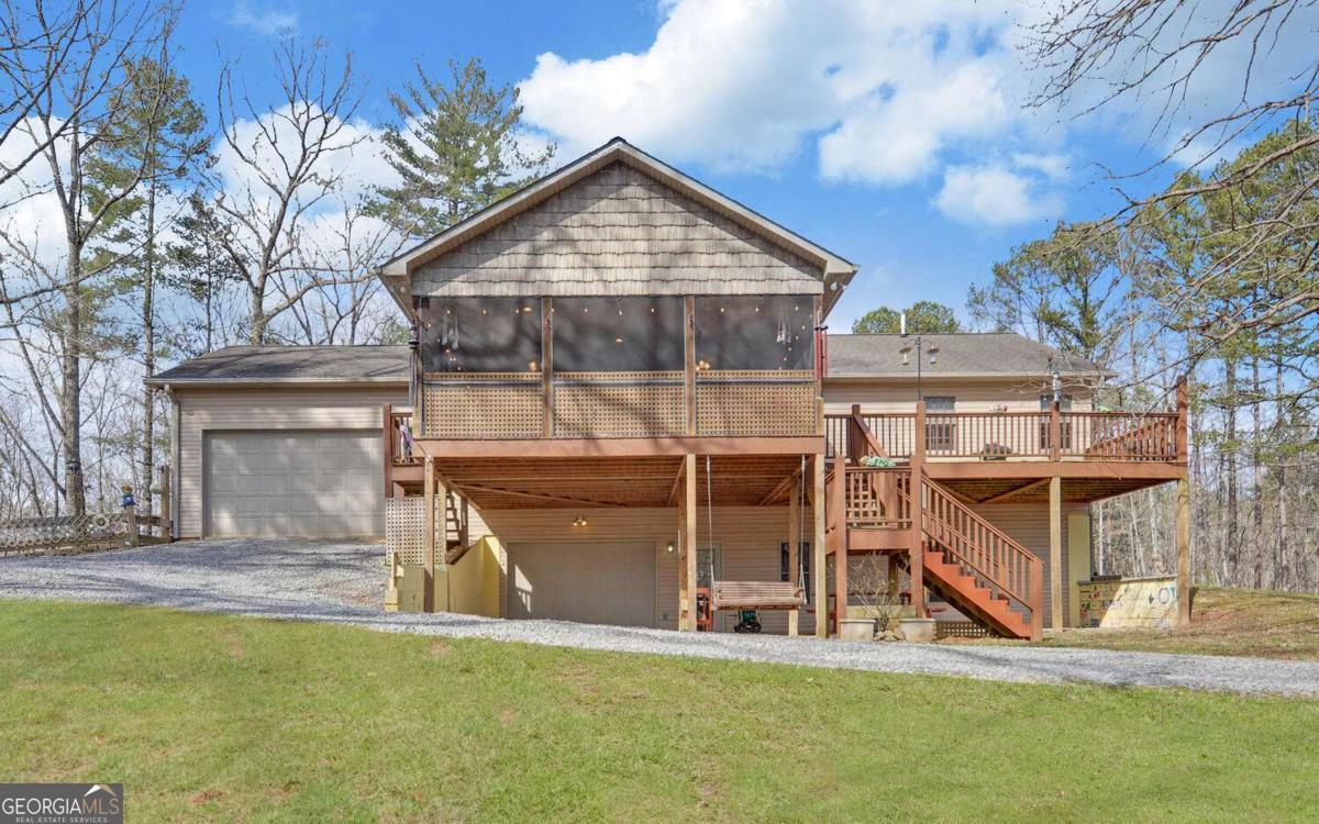 Escape to a home where "peace and quiet" is the standard, not the exception. Tucked away on a sprawling private lot, this property welcomes you with a classic rocking-chair front porch-the perfect spot for your morning coffee and a deep breath of fresh air. Inside, the home opens into a stunning great room anchored by cathedral wood ceilings, creating an atmosphere that is both grand and cozy. The heart of the home is a spacious, thoughtfully designed kitchen with abundant storage, ensuring a clutter-free space for the home chef. The main level features two comfortable bedrooms, including a primary suite complete with a generous walk-in closet. Seamlessly transition from the indoors to your choice of outdoor sanctuaries. Whether you prefer the breeze of the oversized covered screened-in porch or want to soak up the sun on the expansive uncovered deck, this home is built for entertaining. The finished lower level is a versatile powerhouse, offering a den/game room, a third bedroom, a full bath, and an integrated garage. Need more space? Step outside to the private backyard to find a massive open-bay garage, perfect for storing your boat, RV, or car collection. Enjoy total seclusion without sacrificing convenience. This property offers the rare combination of a private estate feel with the infrastructure to support all your hobbies.