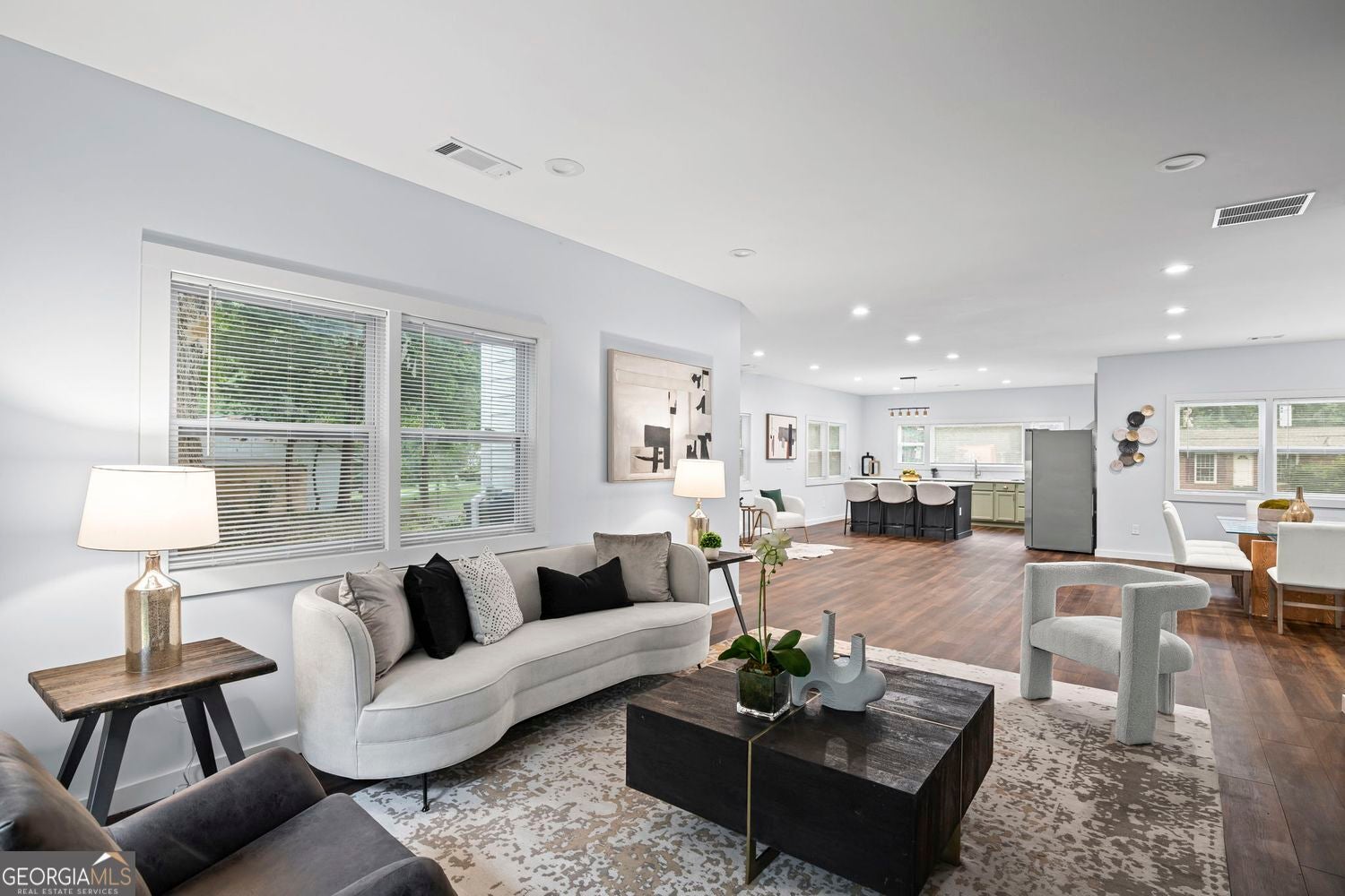 Step inside this completely renovated home where modern design meets timeless comfort. Taken down to the studs and rebuilt from the ground up, every inch of this property has been carefully crafted with high-quality finishes and thoughtful details. Boasting the largest square footage in the neighborhood, this home offers an expansive layout rarely found in the area. The kitchen is a true centerpiece, featuring walls of windows that drench the space in natural light, a generous island with seating for casual dining, gleaming quartz countertops, and brand-new stainless steel appliances that will delight any home chef. From the kitchen, the open-concept floor plan flows seamlessly into the dining area and the spacious family room, anchored by a sleek electric fireplace that serves as both a cozy gathering spot and an eye-catching design feature. The private primary suite offers a luxurious retreat with its spa-inspired bathroom, complete with a double vanity, an oversized standing shower with frameless glass, and premium tile work. Two additional bedrooms provide ample space for family, guests, or a home office, all served by beautifully updated bathrooms with modern fixtures and finishes. Step outside to the brand-new deck overlooking a fully fenced backyard-perfect for entertaining, gardening, or simply enjoying your morning coffee in peace. Every element of this home, from the new mechanical systems to the designer lighting, has been selected for style, comfort, and long-lasting value. Located just minutes from the freeway and less than ten minutes from Lakewood Amphitheatre, the Atlanta Airport, and a variety of shopping and dining destinations, this property offers an unbeatable combination of elegance, functionality, and convenience.