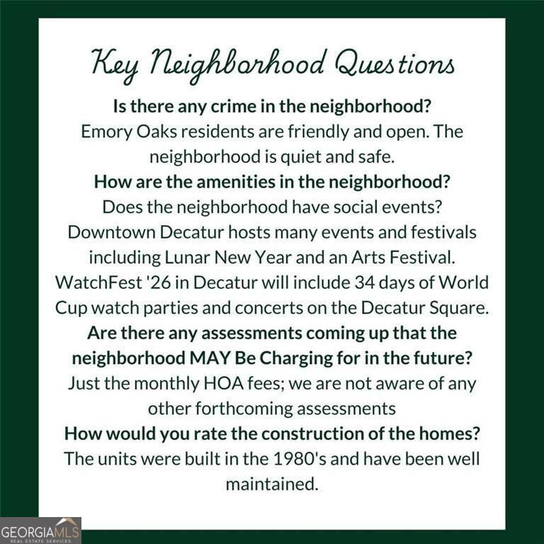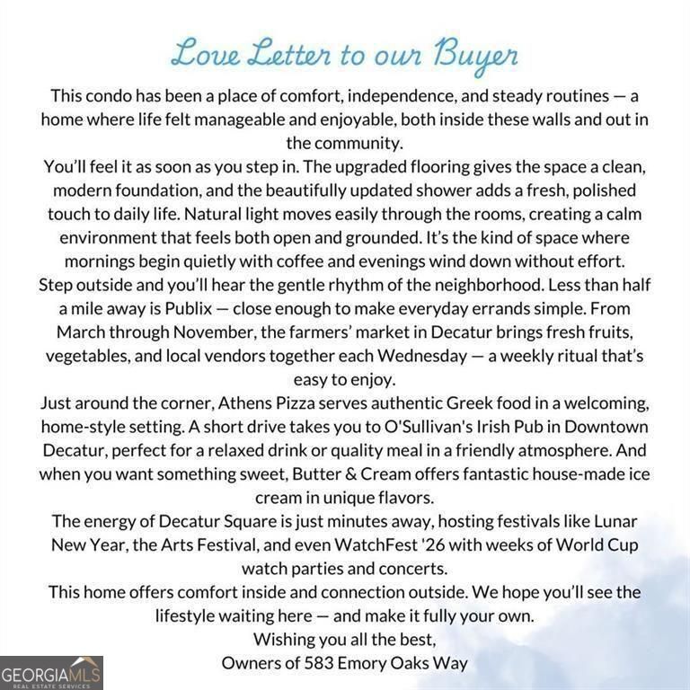 The following perspective is shared directly from the Owners of 583 Emory Oaks Way: This condo has been a place of comfort, independence, and steady routines - a home where daily life felt manageable and connected. With true ground-level entry and no stairs, coming and going has always been simple. Upgraded LVP flooring (2026) creates a clean, modern foundation, and the refreshed 2025 shower adds a polished touch to everyday living. Natural light fills the space, and the private rear patio - accessible from both the living room and bedroom - offers a quiet extension for morning coffee or relaxed evenings. Living here meant walking to Publix, visiting the Decatur Farmers Market, and being just minutes from Emory University Hospital and Downtown Decatur, where festivals, seasonal markets, and community events bring energy while still returning home to a peaceful residential setting. FROM THE LISTING AGENT: We intentionally priced below recent comparable sales in the Decatur/Emory corridor of Intown Atlanta, this one-bedroom ground-level residence combines accessibility, location strength, and ownership simplicity. Emory Oaks is a 40-unit established community with mature landscaping, assigned parking (Space 15), dedicated basement storage, and a structured HOA covering water, sewer, trash, exterior maintenance, exterior insurance, and roof maintenance - converting irregular exterior expenses into predictable monthly budgeting. The $450/month HOA fee reflects comprehensive exterior coverage. HVAC was replaced in 2020, and sellers report no insurance claims during ownership. Located approximately two miles from Emory and Downtown Decatur and about four miles from I-85, proximity within this institutional corridor consistently supports housing demand. Rentable per community guidelines, the property offers flexibility for both owner-occupants and long-term investors. A structured "Life at 583 Emory Oaks Way" OVERVIEW IS AVAILABLE detailing updates, HOA coverage, rental guidelines, and pricing positioning relative to recent comparable sales.