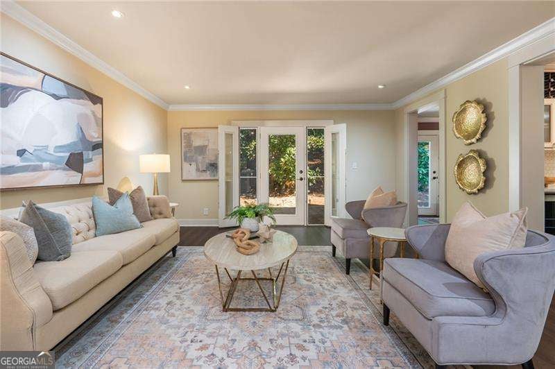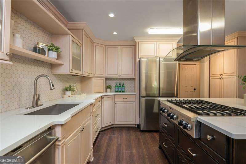 Welcome to Vinings Ferry, a tranquil community nestled on 15 wooded acres in Historic Vinings. This townhome offers a peaceful retreat just a short stroll from the vibrant Vinings Jubilee. The completely renovated townhome is one of the largest floor-plans in the community, offering plenty of space for everyone! On the main level, a welcoming foyer leads to well-designed living areas. Enjoy the convenience of a spacious living room with fireplace, a generously sized dining room, and a flexible den or potential fourth bedroom. The chef's kitchen is the heart of the home with a large island complete with gas cooktop, countertop seating and a bar area with wine rack and two wine refrigerators. Top of the line stainless steel appliances, quartz countertops, tile backsplash and abundant cabinets complete the package. Upstairs, you'll find three bedrooms and two baths, along with a convenient laundry area. The master suite provides a comfortable escape, boasting a vaulted ceiling, a wall of bookcases, and a roomy walk-in closet. Step outside to the private back patio, offering serene views of wooded surroundings-an ideal spot for pet owners or those seeking peace and quiet. Convenience is key here, with prestigious private schools like Lovett & Westminster nearby, along with abundant shopping, dining, and recreational options, including access to the Chattahoochee River at Paces Mill Park, Truist Park and The Battery Atlanta. Plus, easy access to major highways like I-285 and I-75 ensures seamless travel. Enjoy low Cobb County taxes. This is an extraordinary opportunity not to be overlooked!