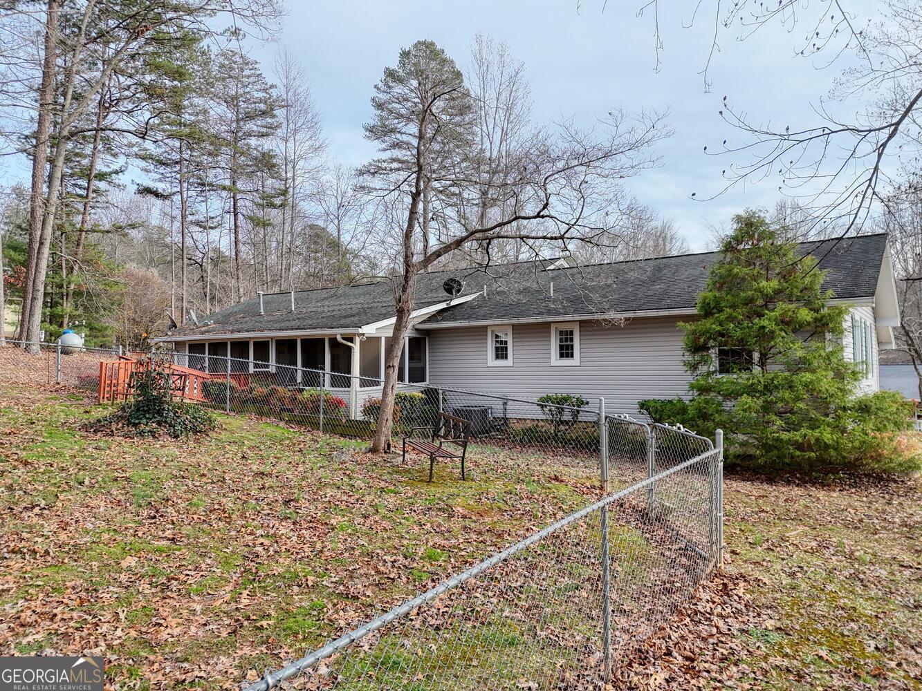 Welcome to this charming 3-bedroom, 2-bath traditional-style home offering easy one-level living just one mile from downtown Blairsville. Set on gentle, sloping terrain in a quiet, small community, this property combines comfort, convenience, and low-maintenance living. Step inside to a stunning, oversized sunroom with tall windows, filling the space with natural light and providing year round enjoyment of the outdoors. Next you will enter the centrally located family room boasting with an abundance of space, cathedral ceilings and warm wood accents. The fully equipped kitchen features granite countertops, oak cabinetry, and an efficient layout that flows seamlessly into the adjacent dining room. From here, step out onto the screened-in back porch, perfect for relaxing or entertaining while overlooking the fenced-in backyard. The primary suite includes a beautifully renovated ensuite bath with neutral tile tones, wood cabinetry, a step-in shower, and a convenient linen closet. Two additional bedrooms and a second full bath offer comfort for family or guests. A large laundry room with utility sink and built-in cabinets adds functionality, while the attached two-car garage includes a shop area ideal for hobbies or storage. Outside, you'll find a 12' x 16' storage shed, plenty of driveway parking, and a spacious front porch, a wonderful spot for children or small pets to play. With vinyl siding for low maintenance, central heat and air, and all living spaces on one level, this home is an excellent choice for a retirement home, starter home, or anyone seeking comfortable living close to town. This Blairsville gem is waiting for you!
