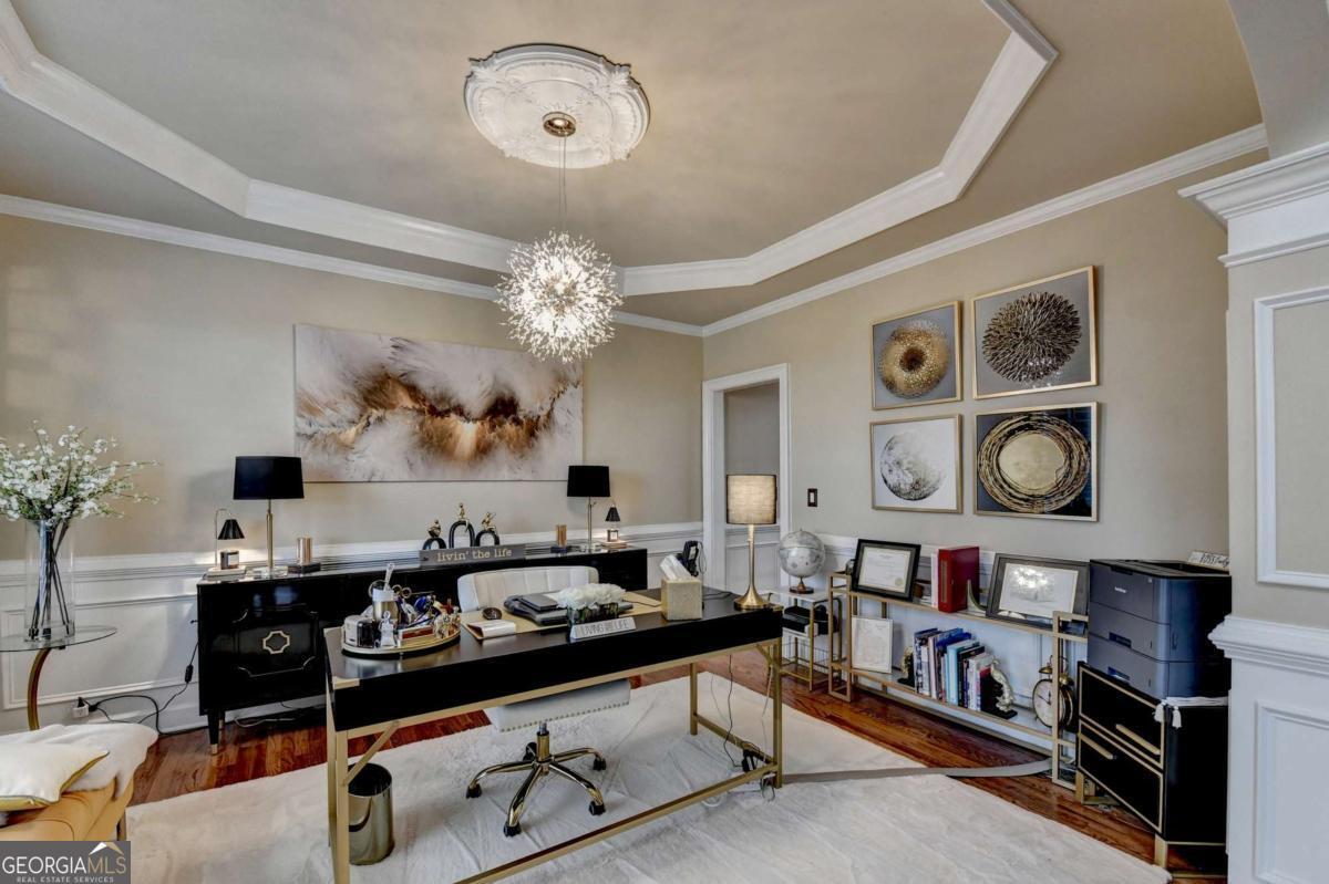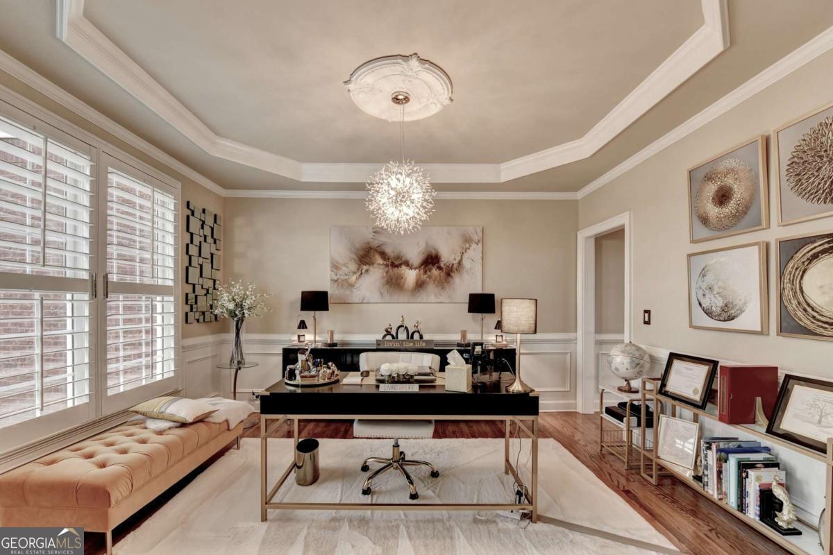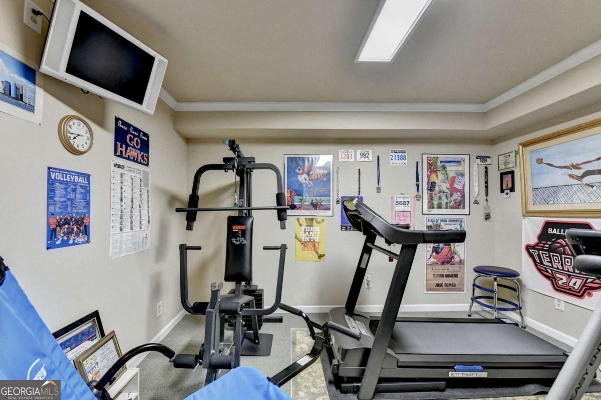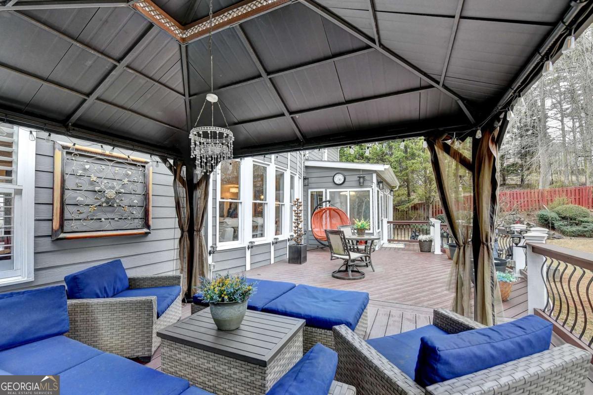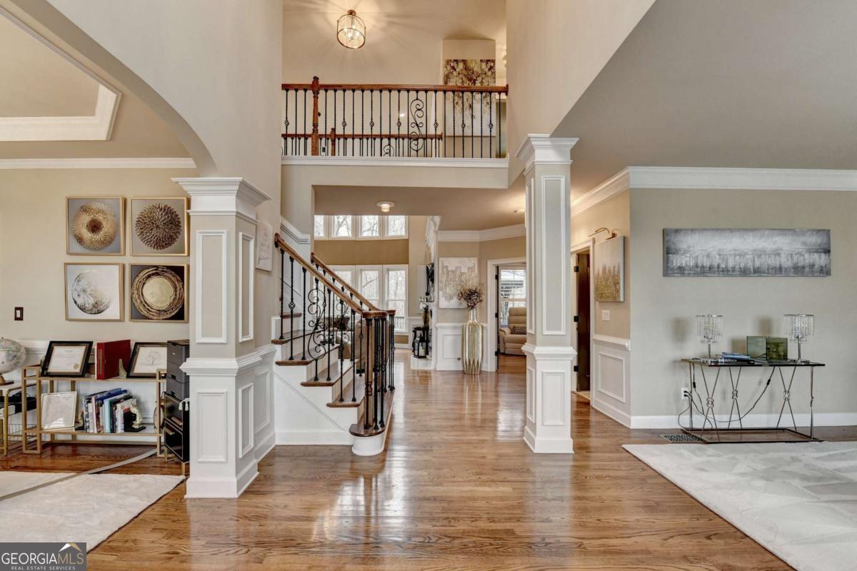 Custom-Built Elegance with Exceptional Entertaining Spaces Welcome to this stunning custom-built 2003 residence featuring 3-sides brick construction and a side-entry 3-car garage, perfectly situated on a beautifully maintained .43-acre lot. From the moment you enter the impressive 2-story foyer, you are greeted with timeless elegance and thoughtful design. Hardwood floors flow throughout the home, complemented by luxury lighting fixtures that elevate every space. The formal living and dining rooms-currently utilized as an executive office suite-offer flexibility to fit your lifestyle. The heart of the home is the dramatic 2-story family room filled with abundant natural light and centered around an electric fireplace. The upstairs catwalk overlooks both the grand foyer and family room, creating an open and airy architectural statement. The gourmet kitchen is designed for both functionality and gathering, complete with a center island, breakfast area, built-in business center, and seamless access to the sunroom. From there, step out onto the Trex deck with a gazebo-perfect for outdoor dining and entertaining-overlooking the fenced backyard accented by a beautiful two-tier water fountain. The owner's suite is a true retreat featuring a double-tray ceiling and an expansive custom closet conversion that extends into an additional closet for maximum storage. The spa-inspired owner's bath includes a double vanity, oversized whirlpool soaking tub, separate tiled shower, and an additional closet for added convenience. With 5 spacious bedrooms (including one on the main level and four upstairs), there is room for everyone. The fully finished basement offers both interior and exterior access and is ideal for multigenerational living or extended guest stays. It features: Media room, Family/Game area, Full kitchen, Bar area, and three additional flex rooms currently used as an exercise room, bedroom, and storage room plus a Full bathroom. The basement can also be purposed as wonderful in-law suite. So, whether hosting elegant indoor gatherings or enjoying evenings under the gazebo, this home was built for entertaining. At night, the exterior lighting surrounding the property creates a warm and inviting ambiance that truly sets this home apart. A rare combination of detailed craftsmanship, space, and lifestyle - this is more than a home; it's an experience.