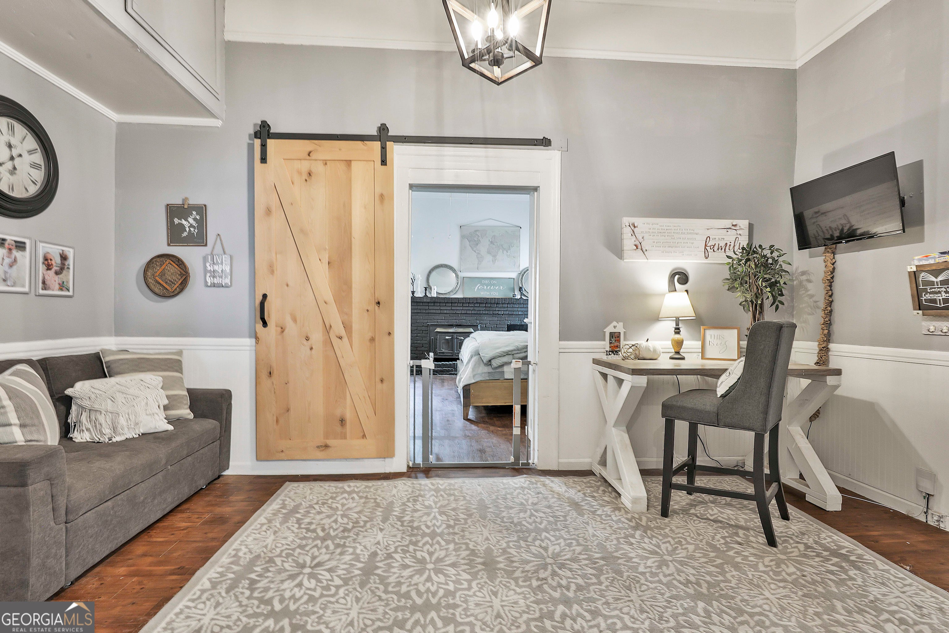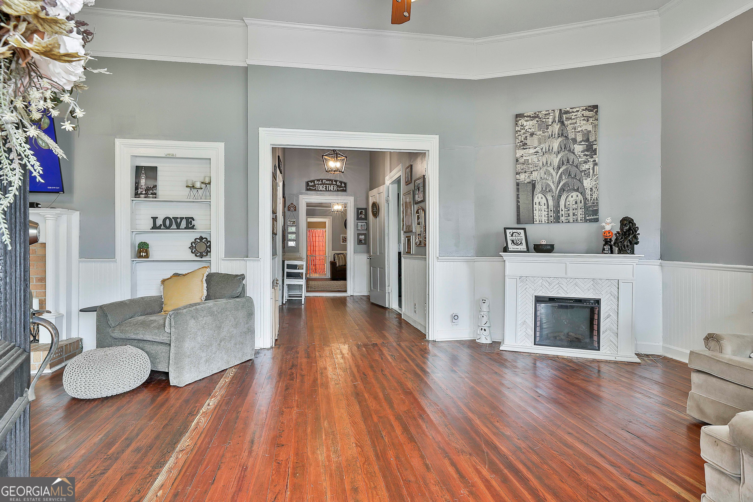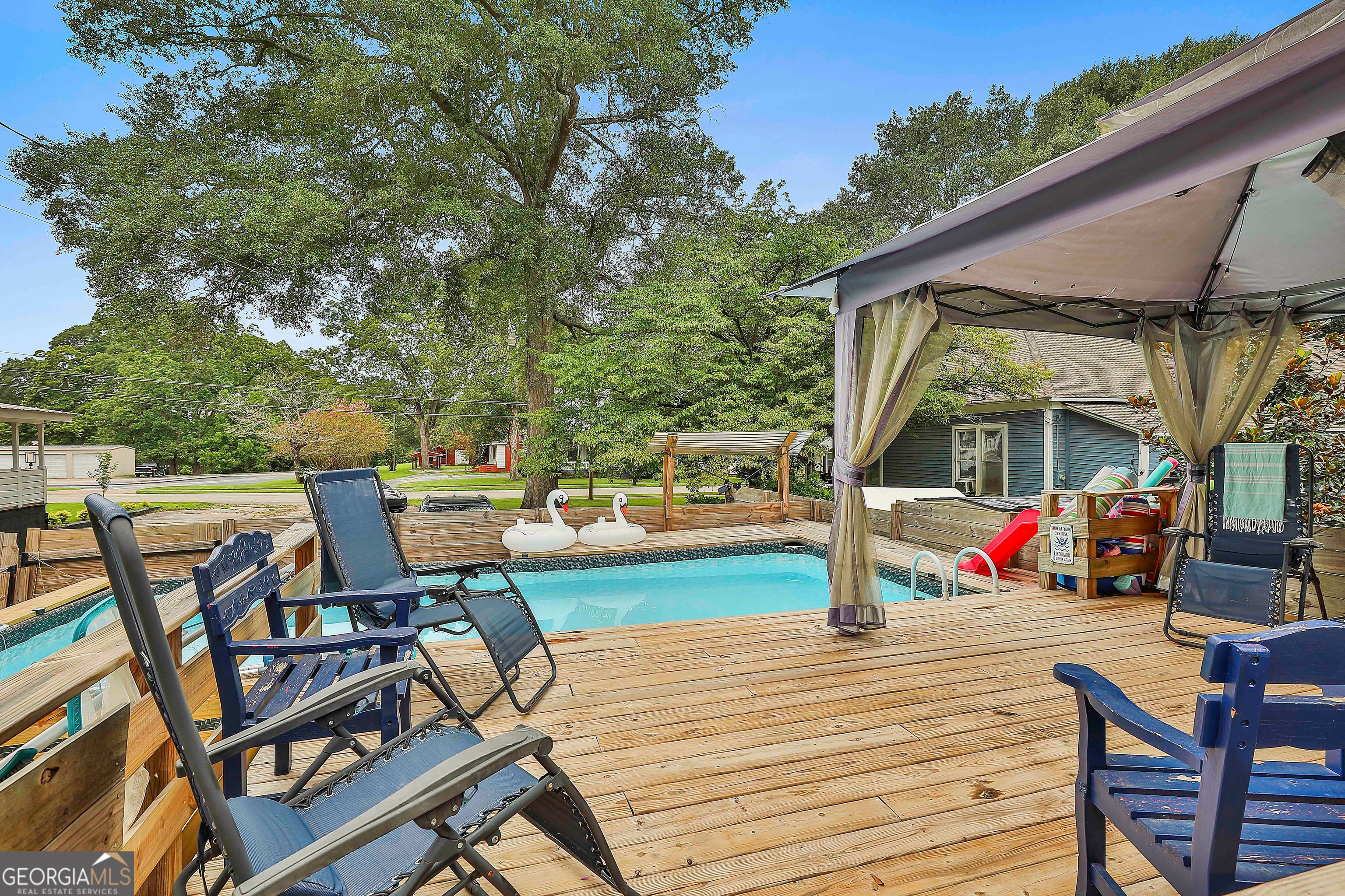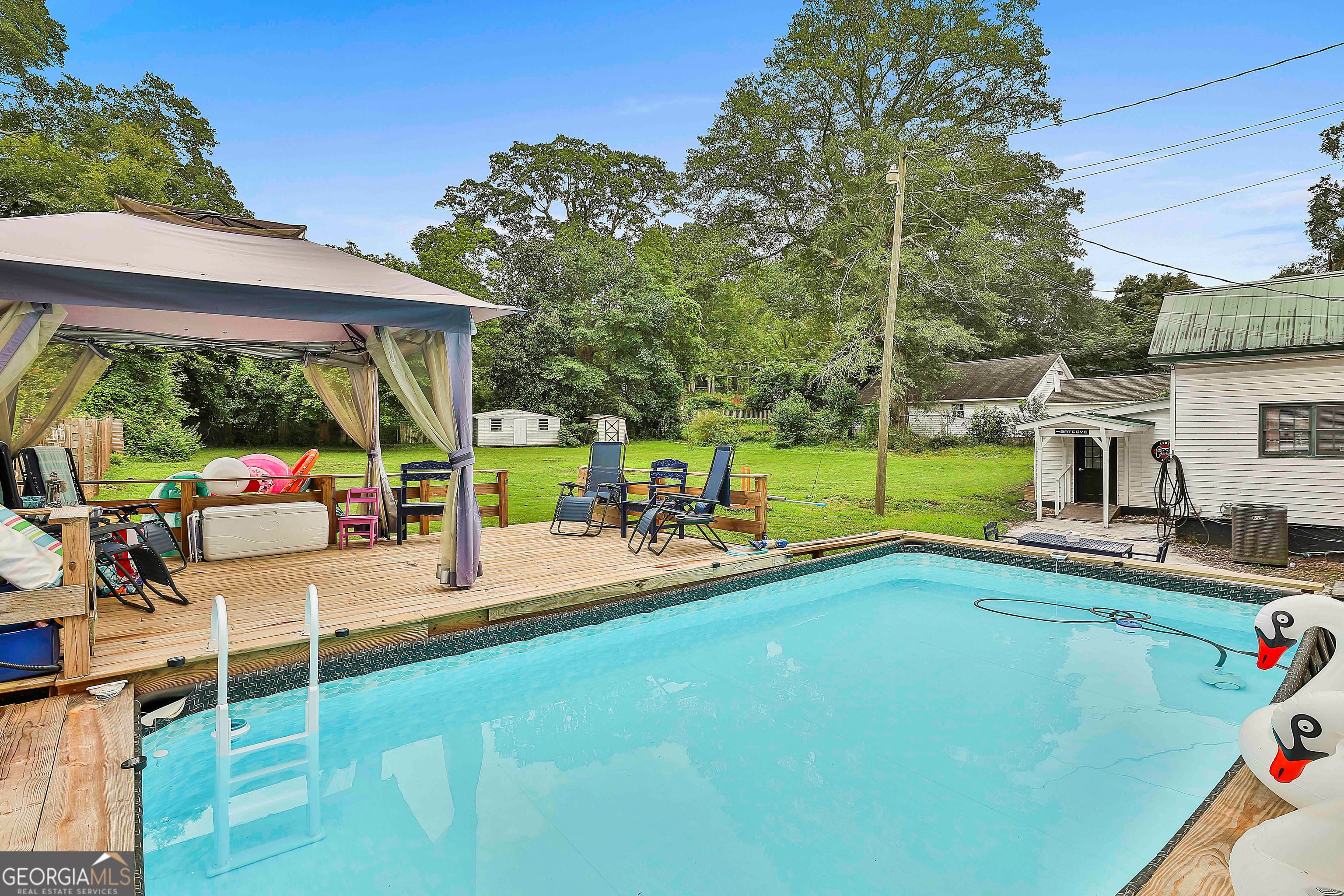 USDA 100% FINANCING TERRITORY + NEW WINDOWS + POPCORN CEILINGS REMOVED = A COMBINATION THAT'S HARD TO FIND!!! Welcome to this beautifully updated 1950s home in the heart of Downtown Hogansville, set on a spacious .6-acre lot on one of the most loved streets in town. You're just a short walk from local favorites like The Royal Theatre, the library, 404 Celsius, Karvelas Pizza, and more - small-town living at its best. The 695 SQ FT wrap-around covered front porch is a showstopper all on its own - plenty of room for rocking chairs, gatherings with friends, or quiet evenings at home. Inside you'll find original hardwood floors, soaring 11+ ft ceilings, beadboard accents, and abundant natural light. The main living area feels warm and welcoming with a brick fireplace, built-in shelving, and an additional sitting area. A spacious secondary bedroom features exposed cedar beams, a brick hearth, and built-in shelving. Separate dining room is ready for entertaining with TWO custom built-ins - one designed as a coffee bar and the other as a mini bar. The kitchen blends classic character with modern updates including subway tile, butcher block countertops, farmhouse sink, updated cabinetry (YES - EVEN A MATCHING DISHWASHER), and a center island perfect for gathering. Large flex space at the heart of the home, ideal for a second living room, office, or playroom. Beyond that, you'll find the freshly painted primary suite with a painted brick fireplace, built-ins, barn door, and private bath with tile shower and a walk-in closet/dressing room. Two additional bedrooms and an updated hall bath with marble vanity and tile tub/shower complete the interior. Out back you'll find a private fenced yard with an oversized deck and above-ground pool, plus a HEATED + COOLED bonus space with outside access - perfect for a studio, office, gym, or hobby space. All just minutes to the interstate and right in the middle of everything Downtown Hogansville has to offer. BONUS OPPORTUNITY: The home next door at 215 Johnson St is also for sale - perfect for friends or family who want to live close together. A rare chance to own side-by-side properties in one of Hogansville's favorite neighborhoods. Schedule your showing today & LETS GET YOU HOME!!!