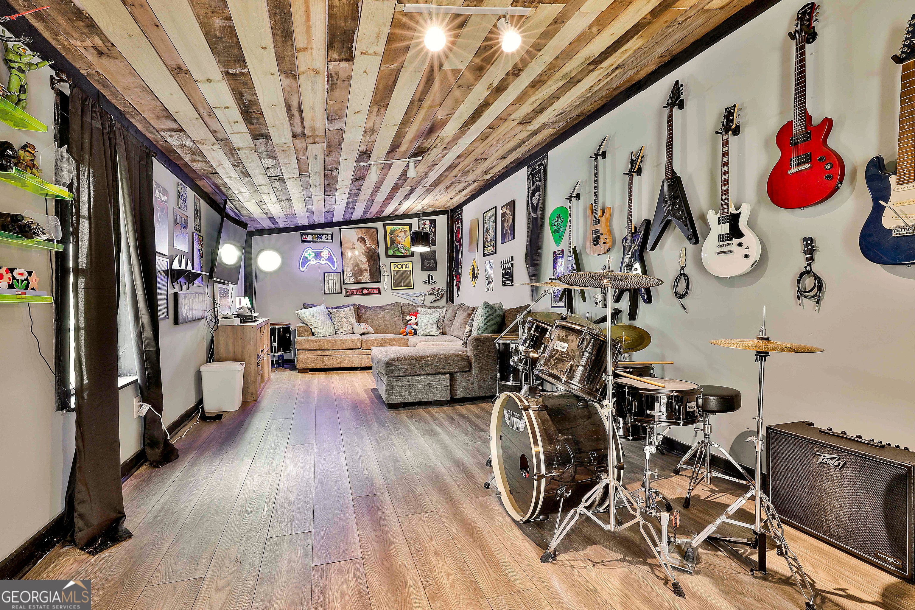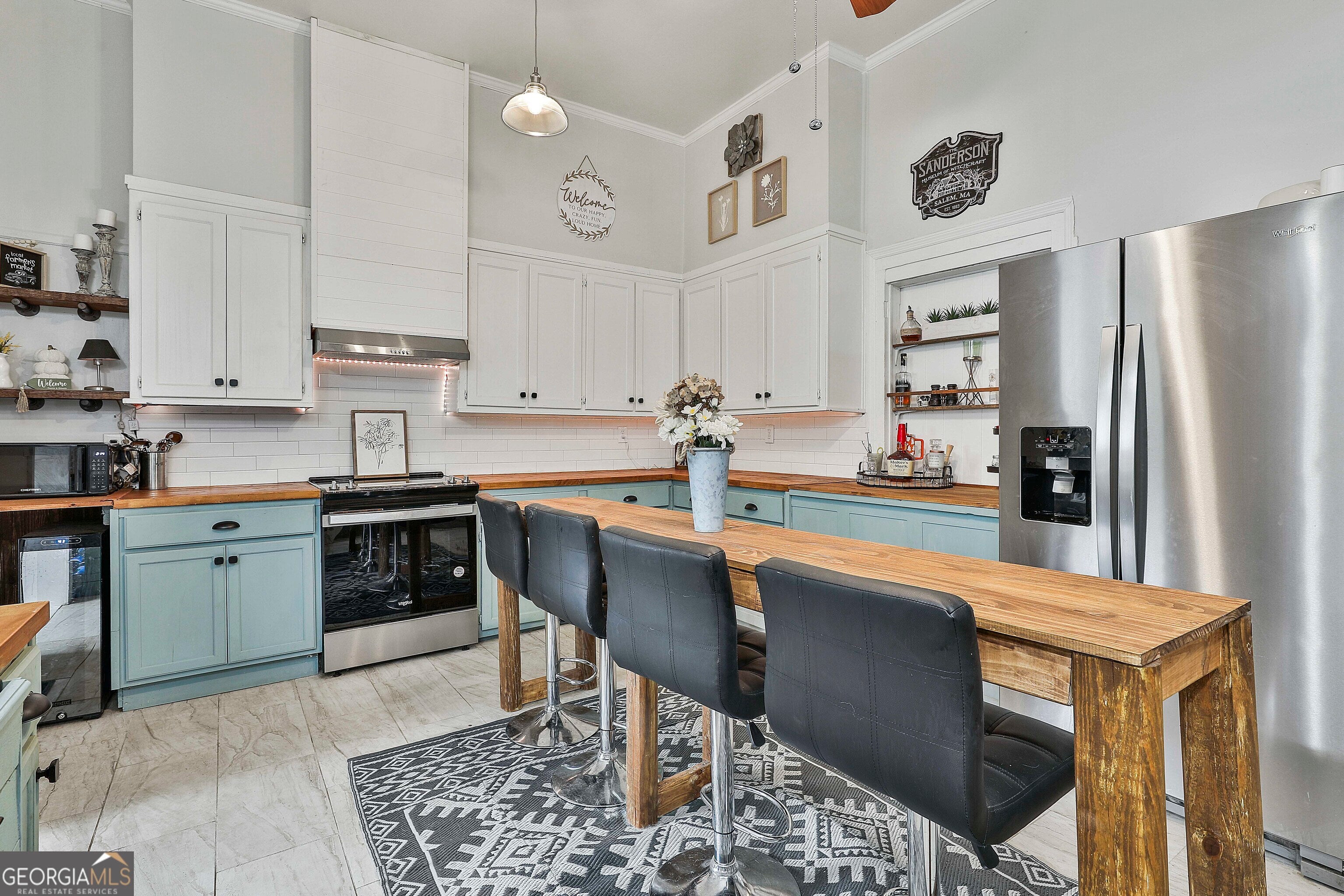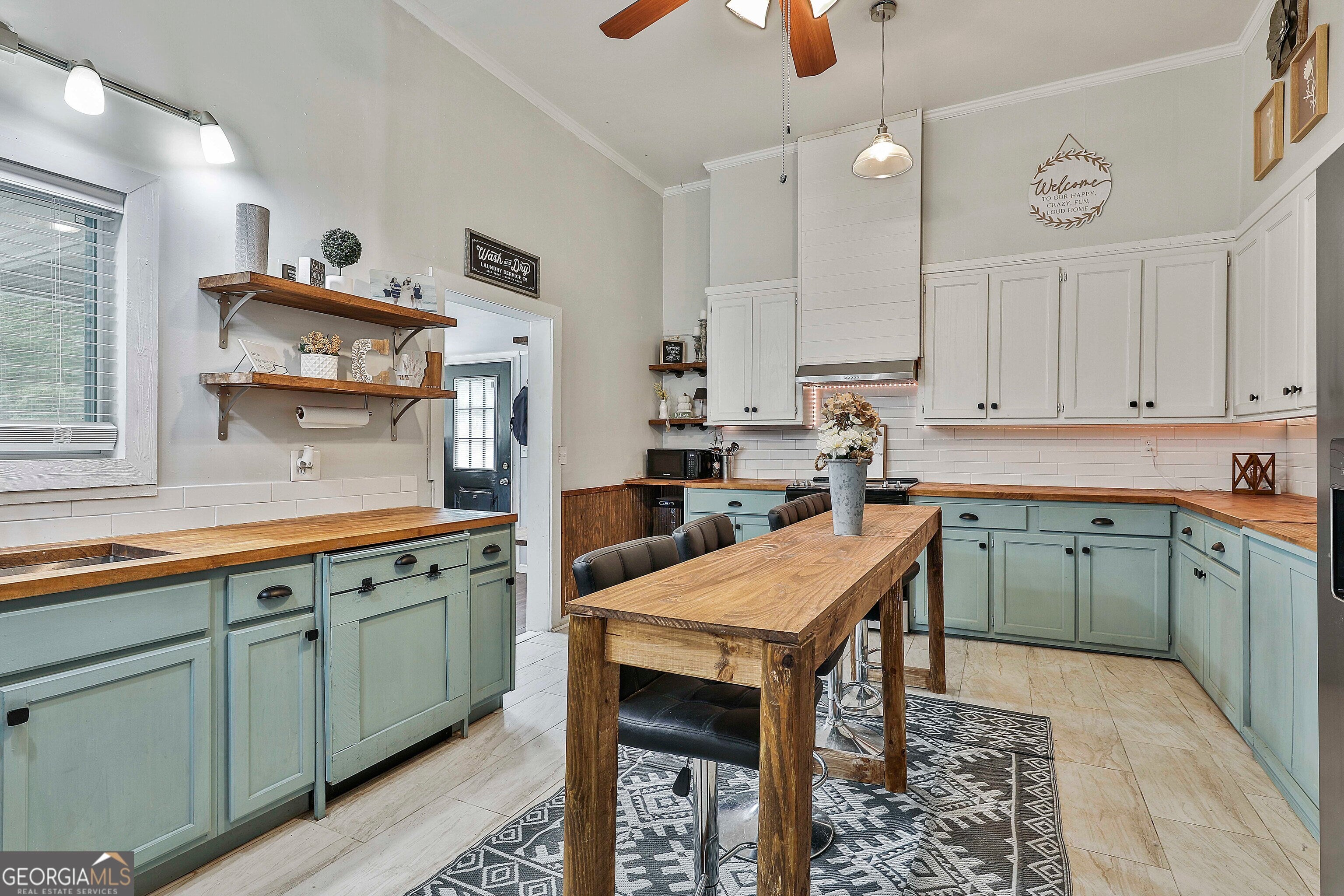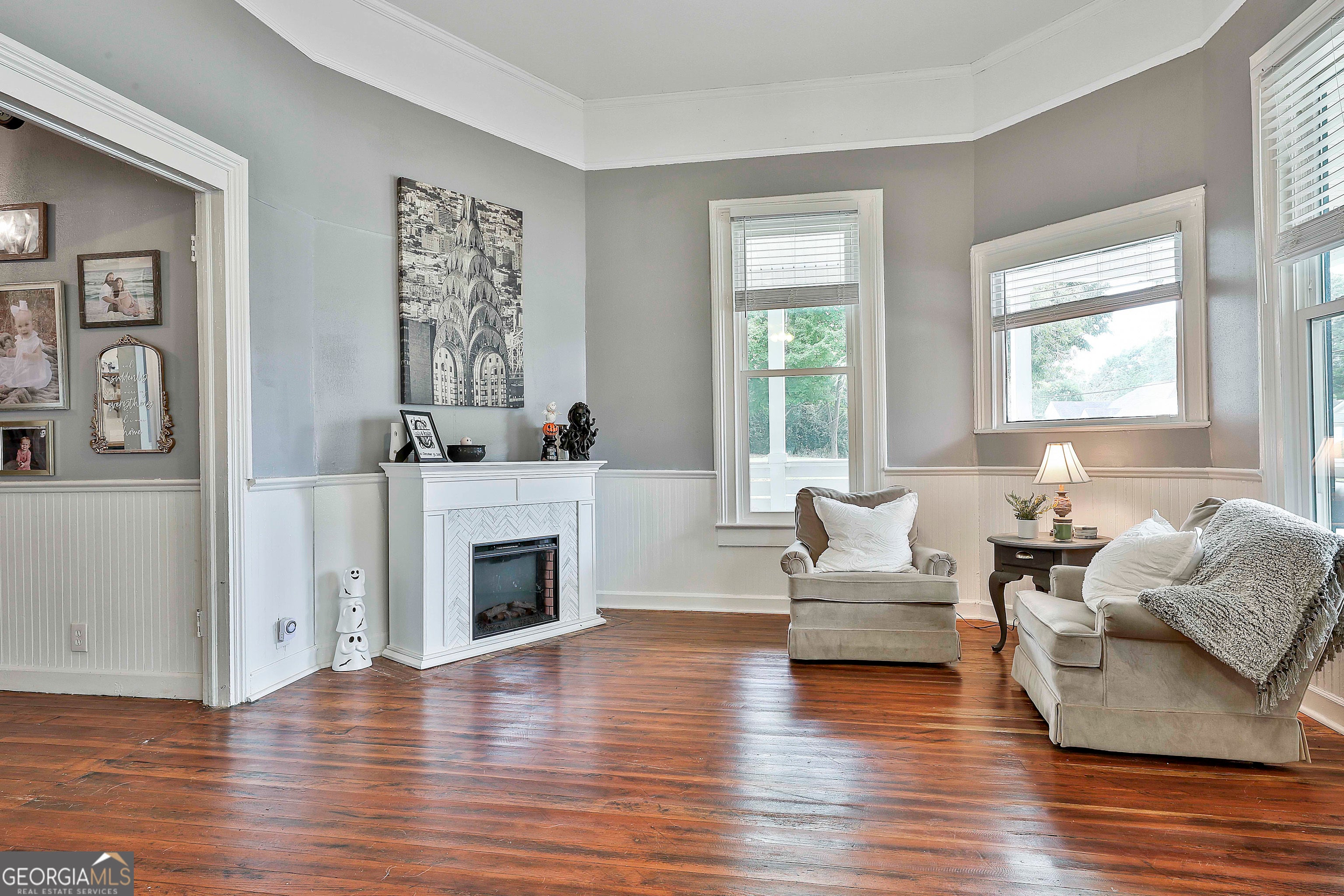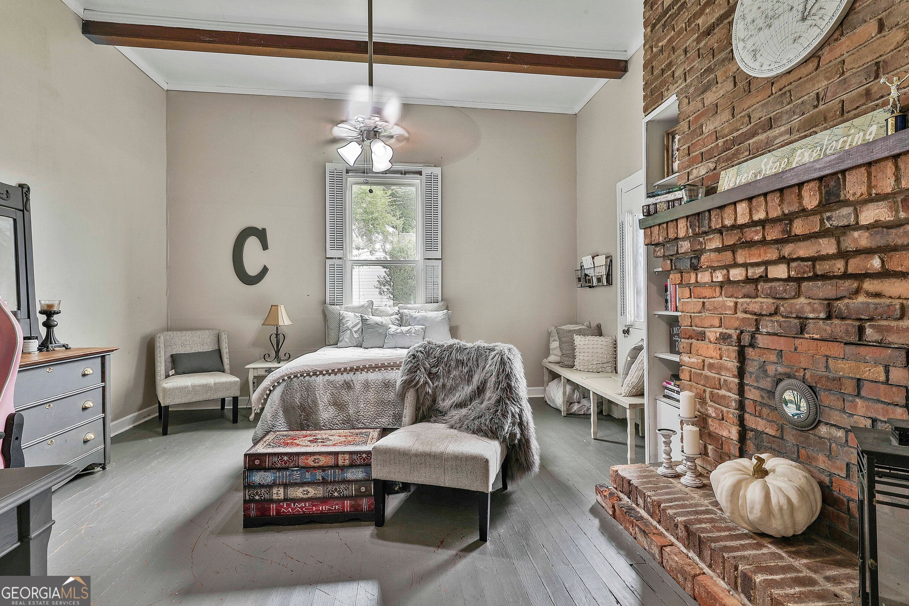 USDA 100% FINANCING TERRITORY + NEW WINDOWS + POPCORN CEILINGS REMOVED = A COMBINATION THAT'S HARD TO FIND!!! Welcome to this beautifully updated 1950s home in the heart of Downtown Hogansville, set on a spacious .6-acre lot on one of the most loved streets in town. You're just a short walk from local favorites like The Royal Theatre, the library, 404 Celsius, Karvelas Pizza, and more - small-town living at its best. The 695 SQ FT wrap-around covered front porch is a showstopper all on its own - plenty of room for rocking chairs, gatherings with friends, or quiet evenings at home. Inside you'll find original hardwood floors, soaring 11+ ft ceilings, beadboard accents, and abundant natural light. The main living area feels warm and welcoming with a brick fireplace, built-in shelving, and an additional sitting area. A spacious secondary bedroom features exposed cedar beams, a brick hearth, and built-in shelving. Separate dining room is ready for entertaining with TWO custom built-ins - one designed as a coffee bar and the other as a mini bar. The kitchen blends classic character with modern updates including subway tile, butcher block countertops, farmhouse sink, updated cabinetry (YES - EVEN A MATCHING DISHWASHER), and a center island perfect for gathering. Large flex space at the heart of the home, ideal for a second living room, office, or playroom. Beyond that, you'll find the freshly painted primary suite with a painted brick fireplace, built-ins, barn door, and private bath with tile shower and a walk-in closet/dressing room. Two additional bedrooms and an updated hall bath with marble vanity and tile tub/shower complete the interior. Out back you'll find a private fenced yard with an oversized deck and above-ground pool, plus a HEATED + COOLED bonus space with outside access - perfect for a studio, office, gym, or hobby space. All just minutes to the interstate and right in the middle of everything Downtown Hogansville has to offer. BONUS OPPORTUNITY: The home next door at 215 Johnson St is also for sale - perfect for friends or family who want to live close together. A rare chance to own side-by-side properties in one of Hogansville's favorite neighborhoods. Schedule your showing today & LETS GET YOU HOME!!!