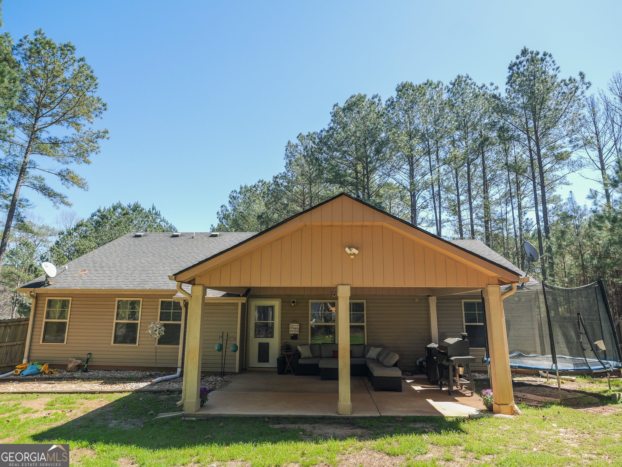 Sweet Senoia Ranch nestled on a quiet cul-de-sac. You will fall in love with the massive covered patio! It is the perfect spot to gather for game day, relaxing nights, or morning coffee. The interior is gleaming with beautiful flooring, an open concept floor plan, huge great-room with vaulted ceiling, and surround sound speakers. The generous kitchen features granite countertops, a walk in pantry, and a breakfast bar! The owner's retreat is spacious and fresh with brand new carpet and padding! It features a nice walk-in closet, too. On the opposite side of the home are two additional bedrooms and a full bath. The backyard is fenced and the outbuilding remains with the home. Minutes to vibrant Senoia where you can enjoy the Farmer's Market on Saturdays, the restaurants and shopping, many festivals throughout the year, and the new Publix. You are close to community ball fields and the library. WELCOME HOME!