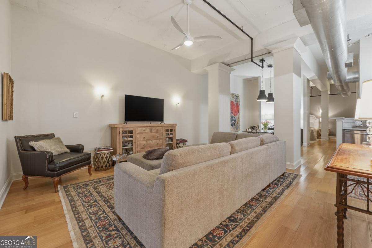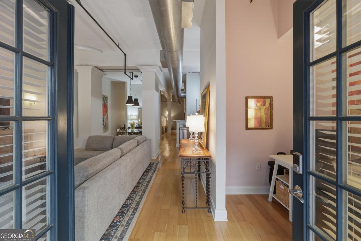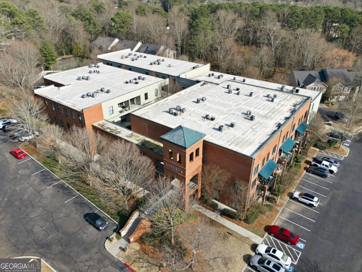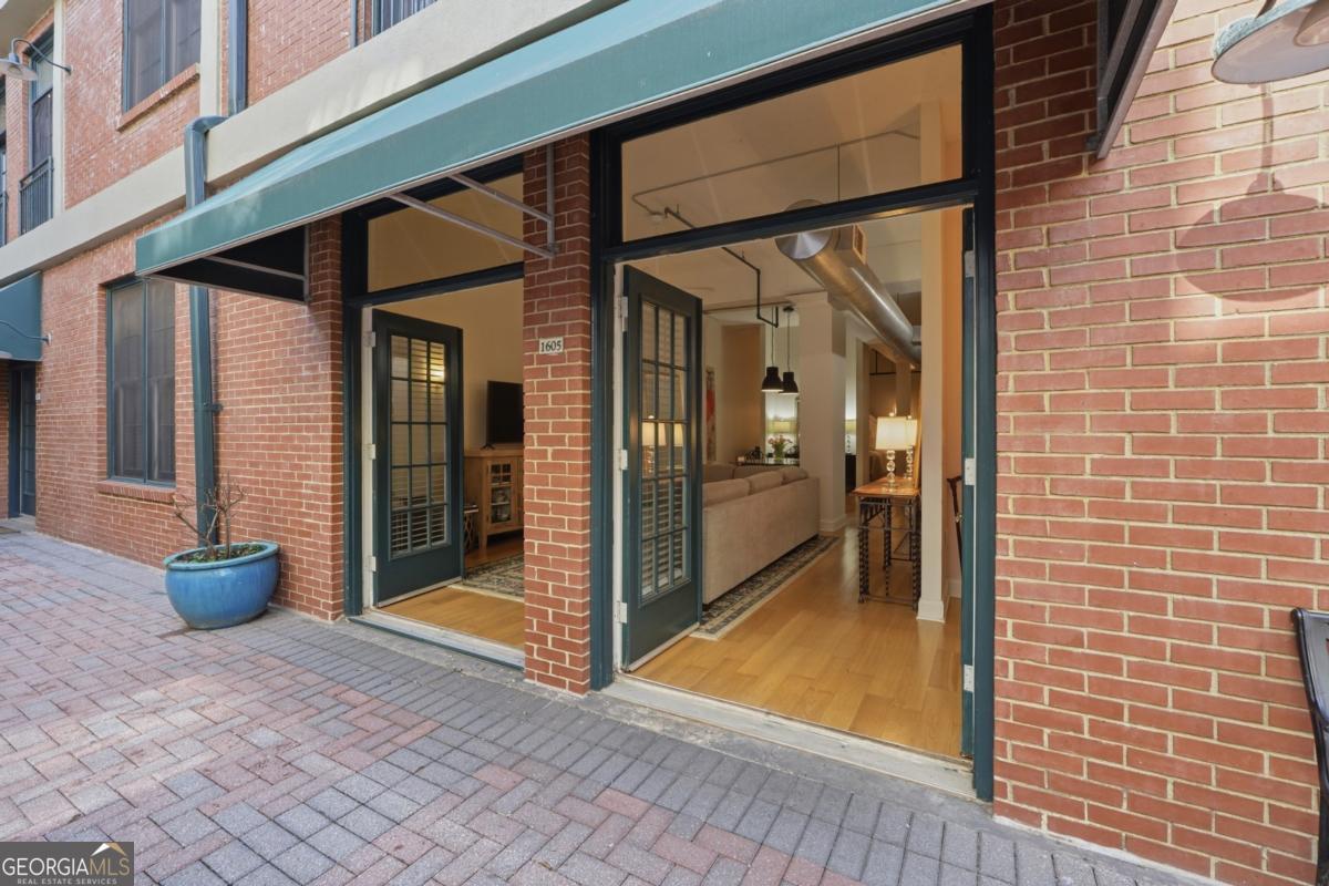 Welcome to the coveted Liberty Lofts, a private, gated community offering an unparalleled lifestyle experience steps from the vibrancy of Canton Street. A striking introduction to sophisticated living begins as you are greeted by two sets of elegant French doors which provide a gracious, step-free private entry directly into the home. This premier courtyard-level location places you in the tranquil heart of the building surrounded by the charming and beautifully maintained central courtyard. Inside the one-bedroom, one-bathroom residence redefines low-maintenance luxury. It soars with 14-foot ceilings creating a vast and open living space bathed in natural light. The newly updated perfectly appointed kitchen flows effortlessly into the family and dining areas, establishing an ideal setting for entertaining. Indulge in the spa-like bathroom, which boasts custom cabinetry and an oversized shower enclosed by a frameless glass door. Beyond your private oasis residents enjoy exclusive access to resort-style amenities, including a pool, fitness center, and tennis court. The sought after location places you just steps from Downtown Roswell's finest offerings including boutique shopping, award winning dining, scenic parks, river trails, the cultural arts center, and the library. Enjoy sophisticated low-maintenance loft living at its finest
