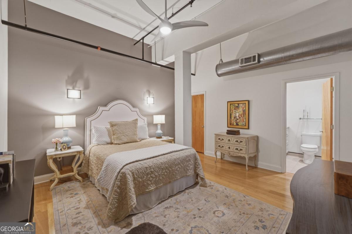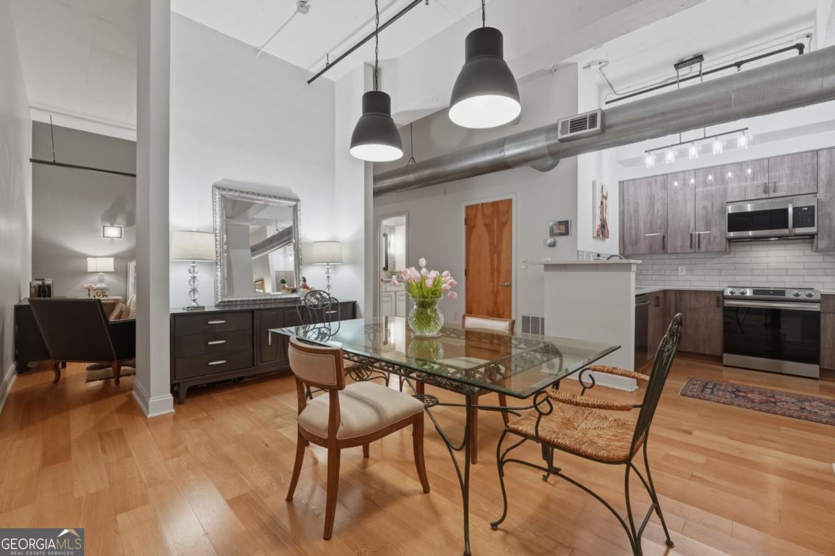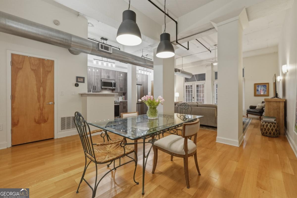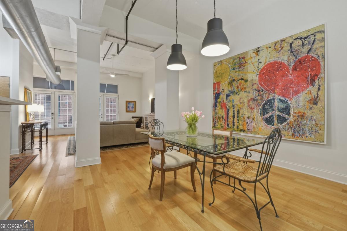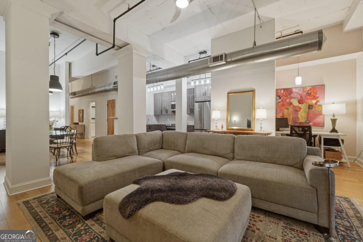 Welcome to the coveted Liberty Lofts, a private, gated community offering an unparalleled lifestyle experience steps from the vibrancy of Canton Street. A striking introduction to sophisticated living begins as you are greeted by two sets of elegant French doors which provide a gracious, step-free private entry directly into the home. This premier courtyard-level location places you in the tranquil heart of the building surrounded by the charming and beautifully maintained central courtyard. Inside the one-bedroom, one-bathroom residence redefines low-maintenance luxury. It soars with 14-foot ceilings creating a vast and open living space bathed in natural light. The newly updated perfectly appointed kitchen flows effortlessly into the family and dining areas, establishing an ideal setting for entertaining. Indulge in the spa-like bathroom, which boasts custom cabinetry and an oversized shower enclosed by a frameless glass door. Beyond your private oasis residents enjoy exclusive access to resort-style amenities, including a pool, fitness center, and tennis court. The sought after location places you just steps from Downtown Roswell's finest offerings including boutique shopping, award winning dining, scenic parks, river trails, the cultural arts center, and the library. Enjoy sophisticated low-maintenance loft living at its finest