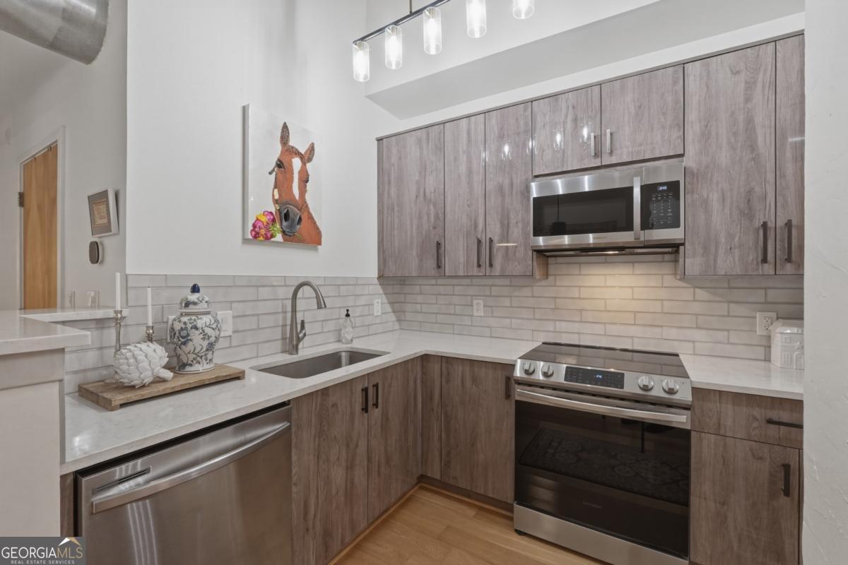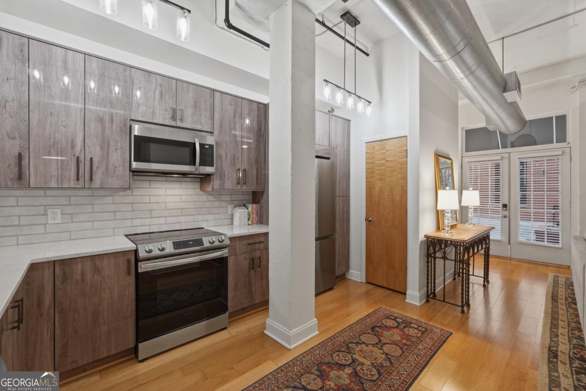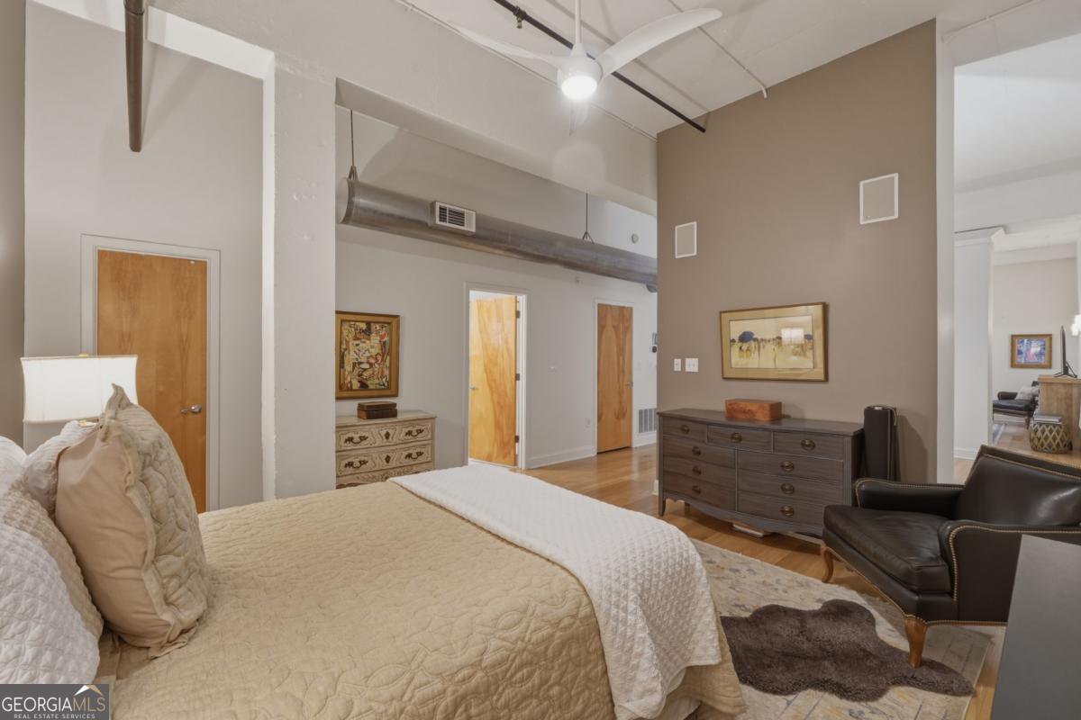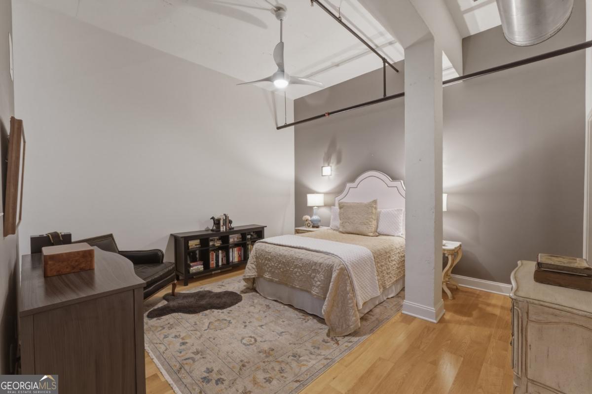 Welcome to the coveted Liberty Lofts, a private, gated community offering an unparalleled lifestyle experience steps from the vibrancy of Canton Street. A striking introduction to sophisticated living begins as you are greeted by two sets of elegant French doors which provide a gracious, step-free private entry directly into the home. This premier courtyard-level location places you in the tranquil heart of the building surrounded by the charming and beautifully maintained central courtyard. Inside the one-bedroom, one-bathroom residence redefines low-maintenance luxury. It soars with 14-foot ceilings creating a vast and open living space bathed in natural light. The newly updated perfectly appointed kitchen flows effortlessly into the family and dining areas, establishing an ideal setting for entertaining. Indulge in the spa-like bathroom, which boasts custom cabinetry and an oversized shower enclosed by a frameless glass door. Beyond your private oasis residents enjoy exclusive access to resort-style amenities, including a pool, fitness center, and tennis court. The sought after location places you just steps from Downtown Roswell's finest offerings including boutique shopping, award winning dining, scenic parks, river trails, the cultural arts center, and the library. Enjoy sophisticated low-maintenance loft living at its finest