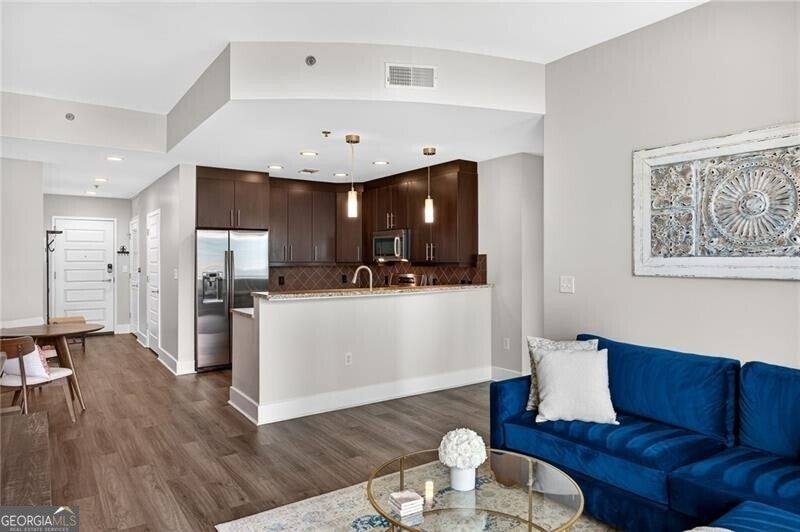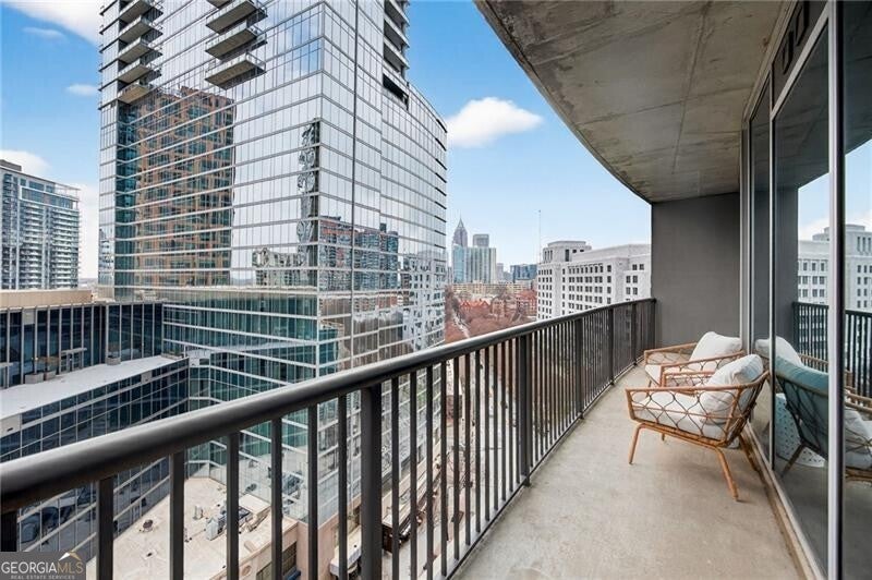 Perched on the 12th floor of 1010 Midtown, this exceptional residence captures sweeping views straight down iconic Peachtree Street from its expansive, full-length balcony. Floor-to-ceiling windows frame the skyline while flooding the home with natural light, enhanced by motorized shades for effortless comfort and privacy.The thoughtfully designed kitchen features granite countertops, premium stainless steel appliances, generous cabinetry, and a seamless breakfast bar ideal for both casual mornings and effortless entertaining. Rich hardwood floors run throughout, enhancing the home's modern elegance and cohesive flow. The spacious primary suite offers a serene retreat, complete with a spa-inspired bath featuring dual vanities and granite countertops. Step outside to the oversized balcony spanning the entire unit, a rare outdoor extension perfect for morning coffee, sunset cocktails, or simply taking in the vibrant Midtown skyline. Meticulously maintained and updated with a new water heater, this residence offers peace of mind while preserving its timeless appeal. Residents of 1010 Midtown enjoy resort-style amenities including a rooftop pool with skyline views, state-of-the-art fitness center, club room, grilling stations, and 24-hour concierge service. Located just steps from Piedmont Park, premier dining, shopping, and the very best of Midtown Atlanta, this residence offers a refined lock-and-leave lifestyle in one of the city's most sought-after addresses. A rare opportunity to own on the curve of Midtown, where skyline views and city living meet effortlessly.