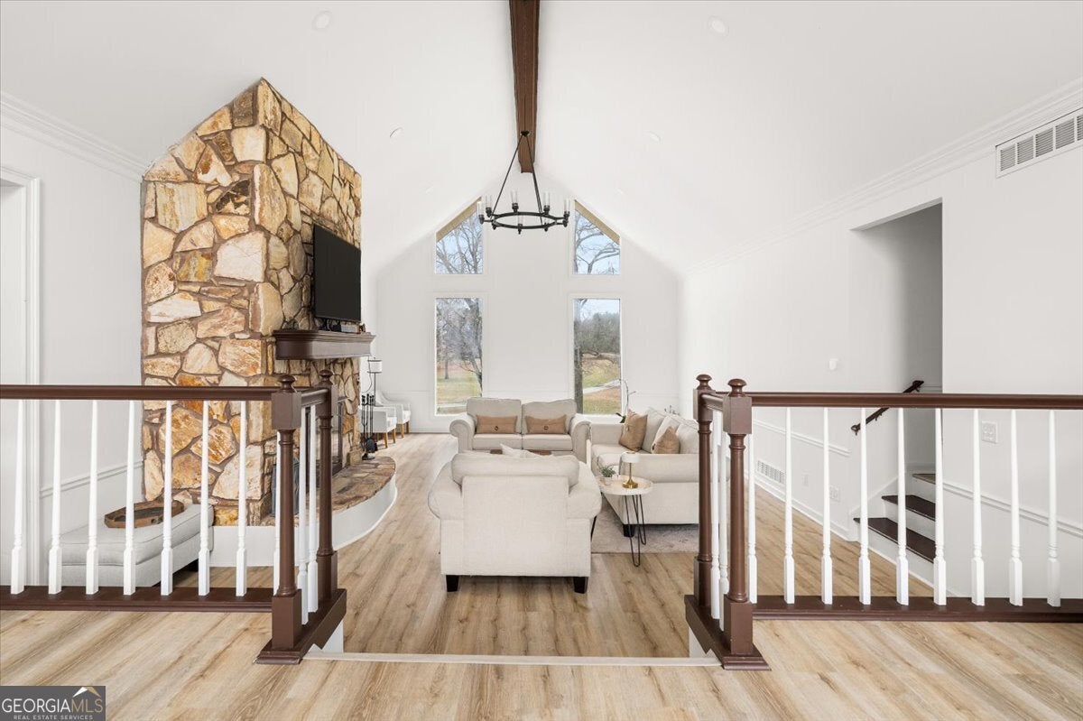 - Interior FeaturesBeamed Ceilings, Central Vacuum, Double Vanity, High Ceilings, Master On Main Level, Pulldown Attic Stairs, Rear Stairs, Split Foyer, Tile Bath, Walk-In Closet(s)