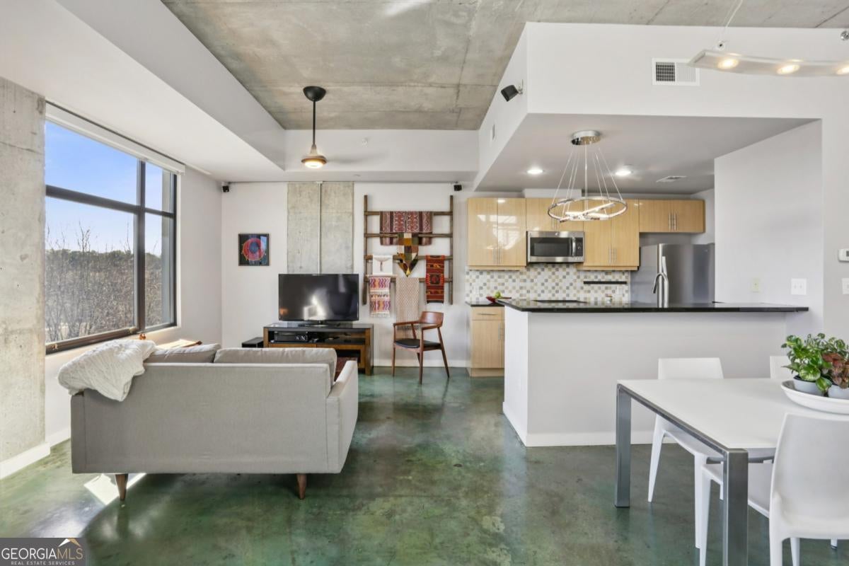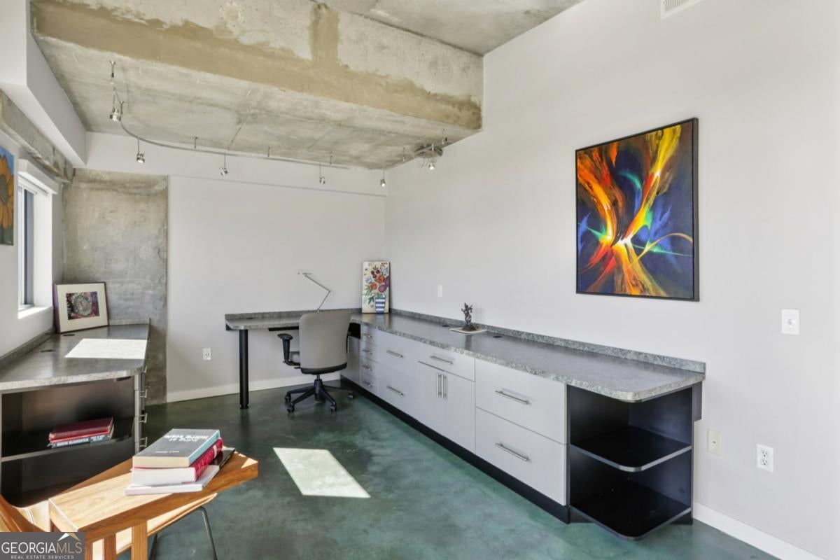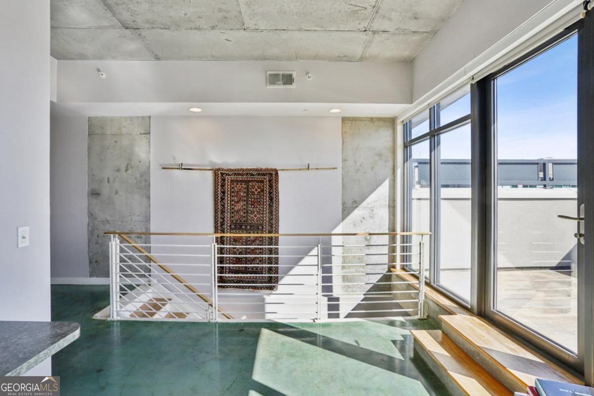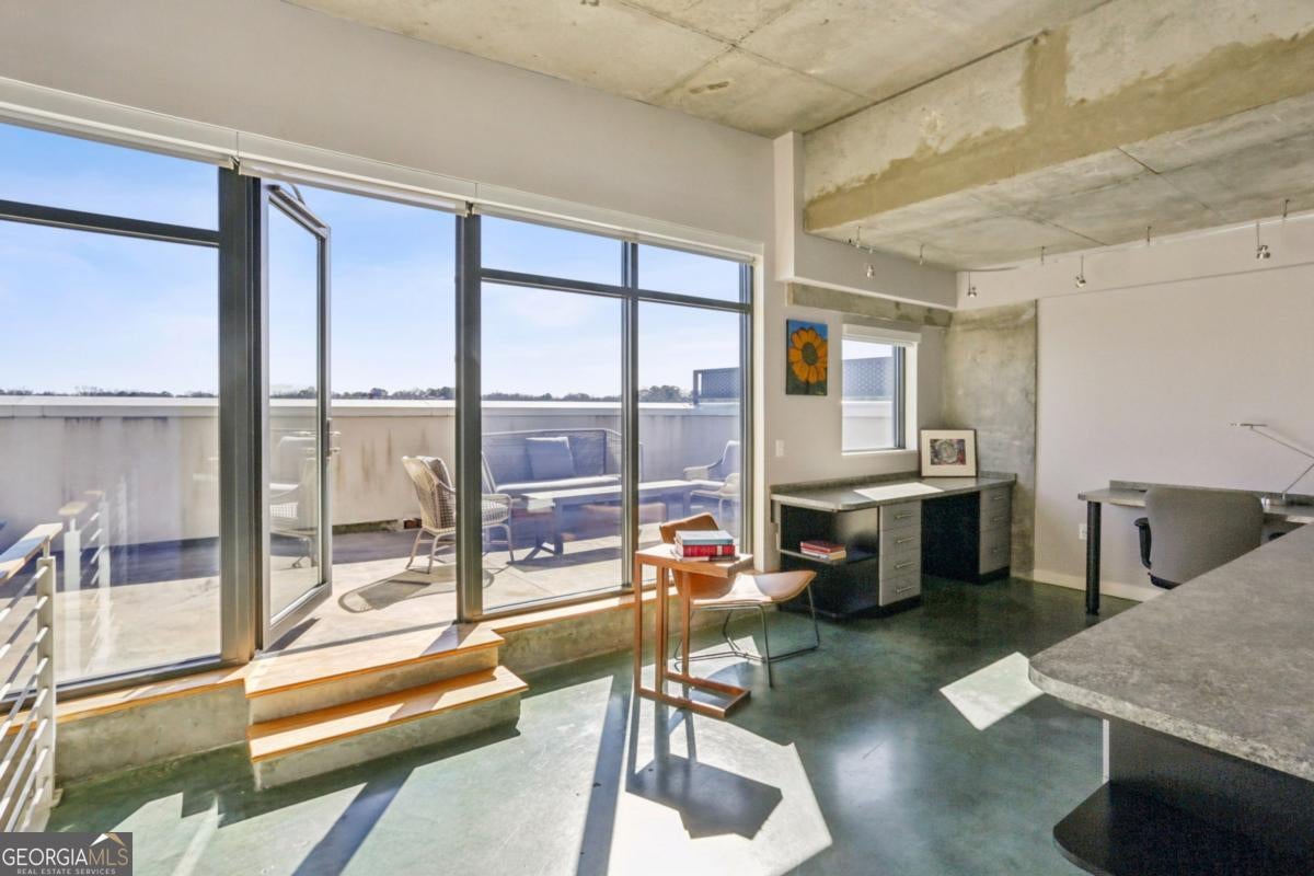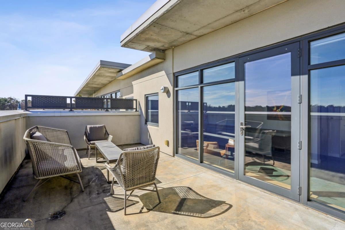 Live elevated in this striking penthouse contemporary loft in the heart of Downtown Decatur. Spanning two levels with a private rooftop deck, architectural drama meets effortless, lock-and-leave living. From the moment you enter, the design makes a statement - soaring concrete ceilings and floors, a sweeping entry, floating staircase, curated modern lighting, and impressive built-ins that blend form and function. The industrial elements are balanced with high-end finishes throughout, creating a space that feels both bold and refined. The main living area opens to a covered balcony with Downtown Decatur views - the perfect shaded perch for morning coffee or a quiet reset between meetings. Upstairs, your private rooftop patio offers a completely different perspective: open sky, warm sun, and front-row seats to sunset gatherings with friends and thoughtfully crafted cocktails. The open-concept kitchen anchors the space with stainless steel appliances, induction cooktop, a granite breakfast bar, and seamless flow into the living and dining areas - ideal for entertaining. Two bedrooms feature lofted ceilings that amplify the sense of volume, while wide-vanity bathrooms make getting ready for an evening on the Square effortless. A bonus flex space provides the perfect office or creative studio, and custom closets throughout ensure storage is never an afterthought. Take full enjoyment the community's rooftop pool and well-equipped fitness center have to offer. Located just blocks from Decatur Square, the Decatur MARTA Station, shops, and award-winning restaurants, this home offers a Walk Score of 94 - truly a walker's paradise. Two well-lit, secured parking spaces in the gated deck make coming and going seamless. With easy access to Emory University, the CDC, VA Hospital, Druid Hills, Midtown, and Virginia Highlands, this contemporary live-work-play community offers the ultimate blend of convenience, security, and style. This isn't just a condo - it's a front-row seat to the best of Decatur living.