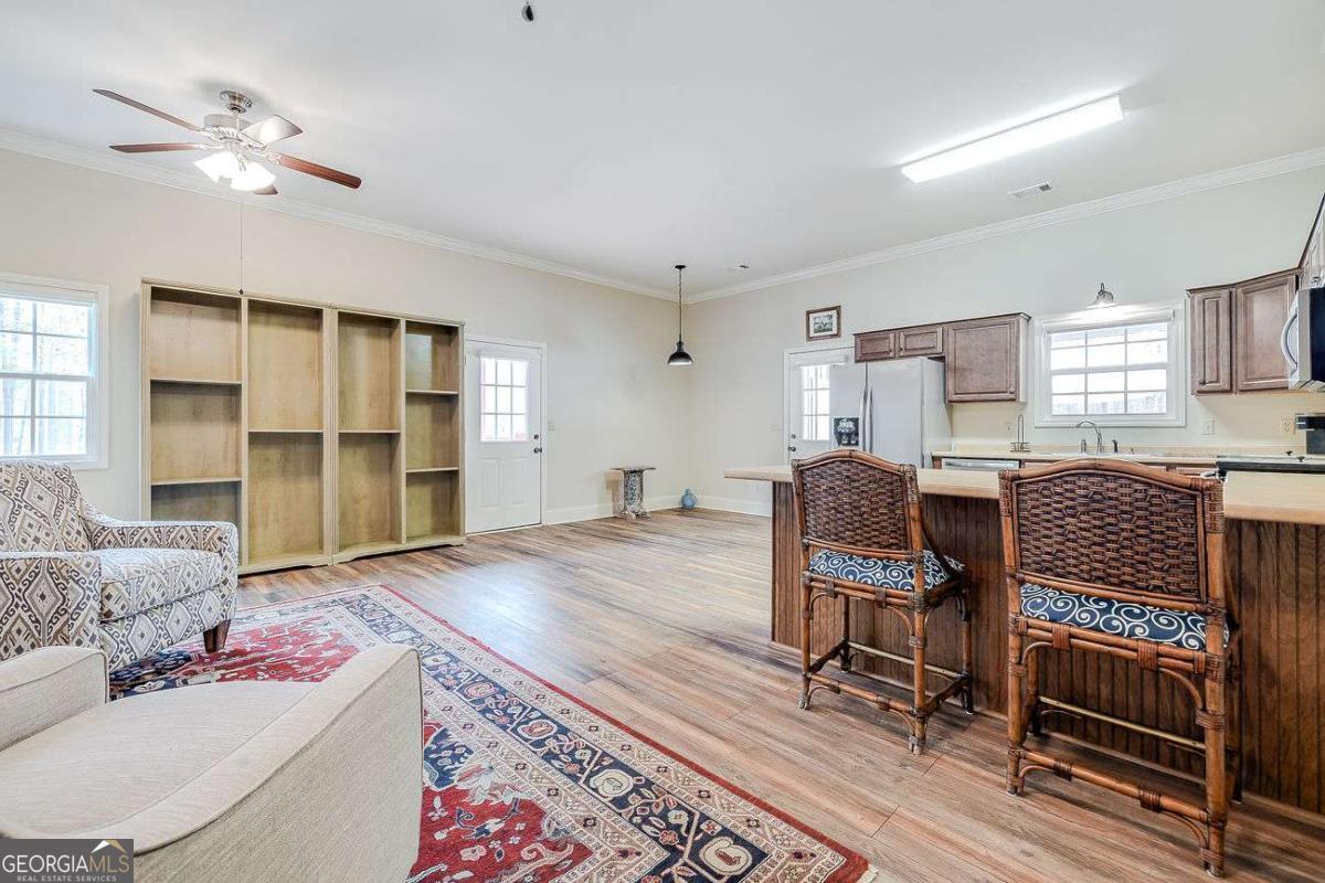 Your new home is set behind an ornamental estate gate, this private 9.58-acre property offers a rare blend of quality construction, usable land, and flexibility. The 1,872 sq ft main residence features 2 bedrooms and 3 full baths, hardwood flooring throughout, 9-foot ceilings, insulated 6-inch walls, and a metal roof with insulation above the ceiling and below roof. Interior highlights include a propane fireplace, accent lighting in the kitchen and dining area, handicap-accessible bathrooms, window shutters, and an exterior repaint completed April 2025. A major asset is the 40 x 72 barn with covered overhangs and an 880 sq ft apartment offering a kitchen, 1 bedroom, 1 bath, walk-in closet, laminate flooring, and washer/dryer connections. Additional features include a 750-ft milled asphalt driveway, landscaped islands, underground utilities, irrigation system, fenced half-acre garden, city water, septic system, established ATV/UTV trails, and multiple outdoor living areas. Ideal for country living.