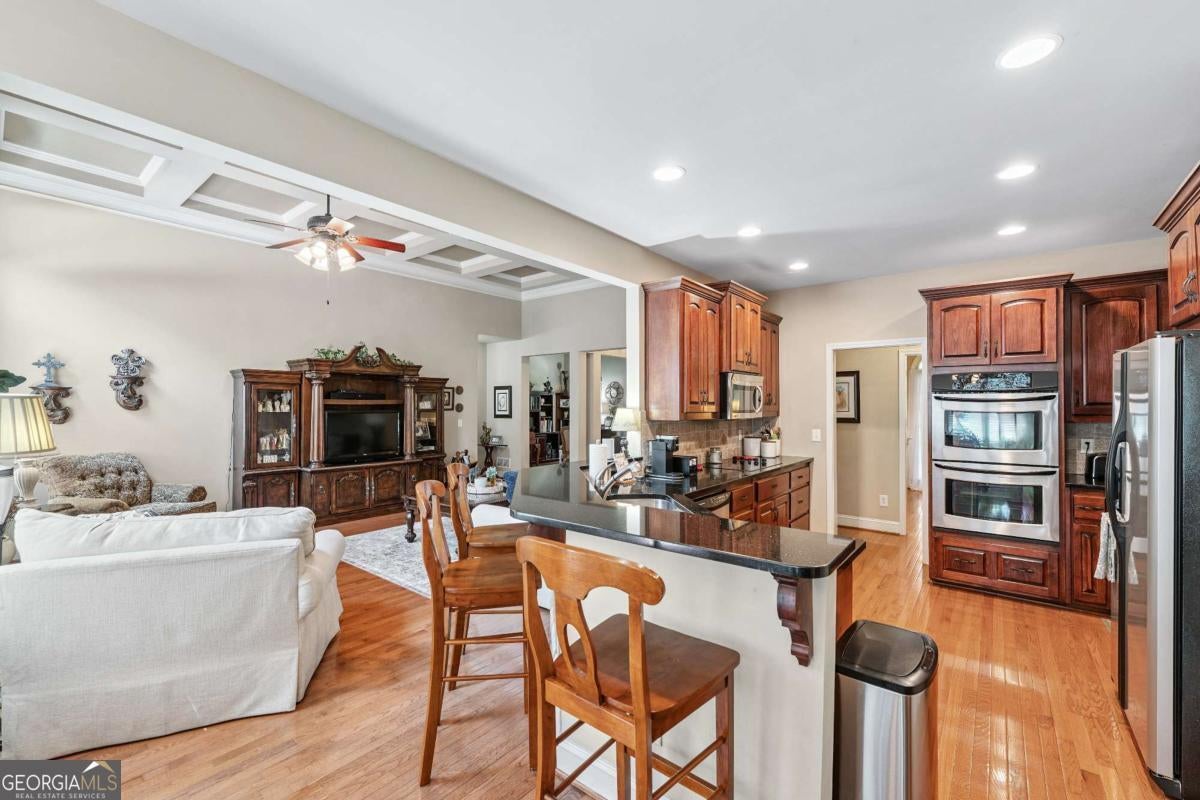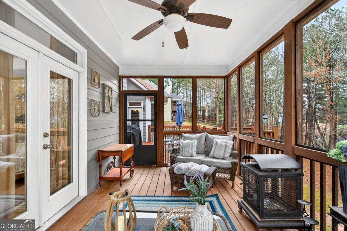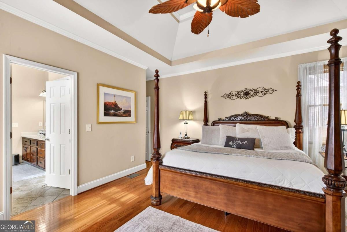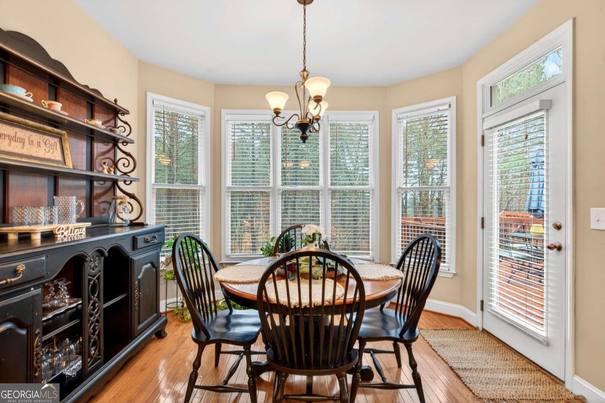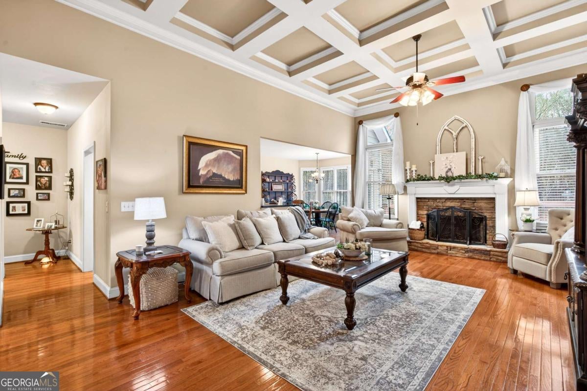This custom-built, one-owner 4-bedroom, 3.5-bath ranch on a full daylight basement sits on a generous estate lot backing directly to Lake Allatoona, where you can literally walk to the water, and in the car you'll be less than one mile from beach and boat access. Privacy, space, and everyday adventure - all in one address. Inside, soaring coffered ceilings and a striking stone fireplace anchor the family room, flowing effortlessly into the breakfast area and a beautifully appointed kitchen with granite countertops, stainless steel appliances, and abundant storage. A separate dining room and dedicated office/formal living space offer flexibility for entertaining or working from home. The primary suite on the main level is a true retreat, featuring a vaulted tray ceiling and a thoughtfully updated spa bath with double vanities, a whirlpool tub, glass shower, and generous closet space. Step directly from this suite onto the screened porch and sundeck - your own quiet escape overlooking the backyard. Two additional bedrooms and a full bath complete the main floor. Upstairs, a private fourth bedroom and full bath with its own staircase create a flexible space that works effortlessly as a true fourth bedroom, guest retreat, tucked-away office, or bonus living area - plus easy attic storage access. The unfinished daylight basement is expansive, already stubbed for a bath, and ready for your vision. With two sets of French doors, two breaker boxes, and an ideal layout for finishing, it's an opportunity to instantly expand your living space (nearly double it!) and add value. Hardwood floors, crown molding, a large side-entry two-car garage, built-in laundry cabinetry, and a welcoming rocking chair front porch add charm and functionality throughout. Don't miss this one-of-a-kind opportunity - a ranch with an expansive daylight basement with tall ceilings like this is rare and a home of this scale and quality - with soaring ceilings and premium finishes - would cost significantly more to build today! Tucked among mature trees on a manicured lot, yet just minutes from Sweetwater Creek State Park, Big Door Vineyards, and all the conveniences of Cherokee County, this home is peaceful living in a location that's hard to beat!!
