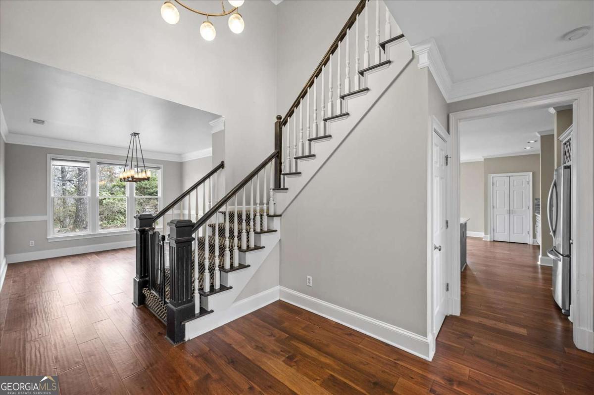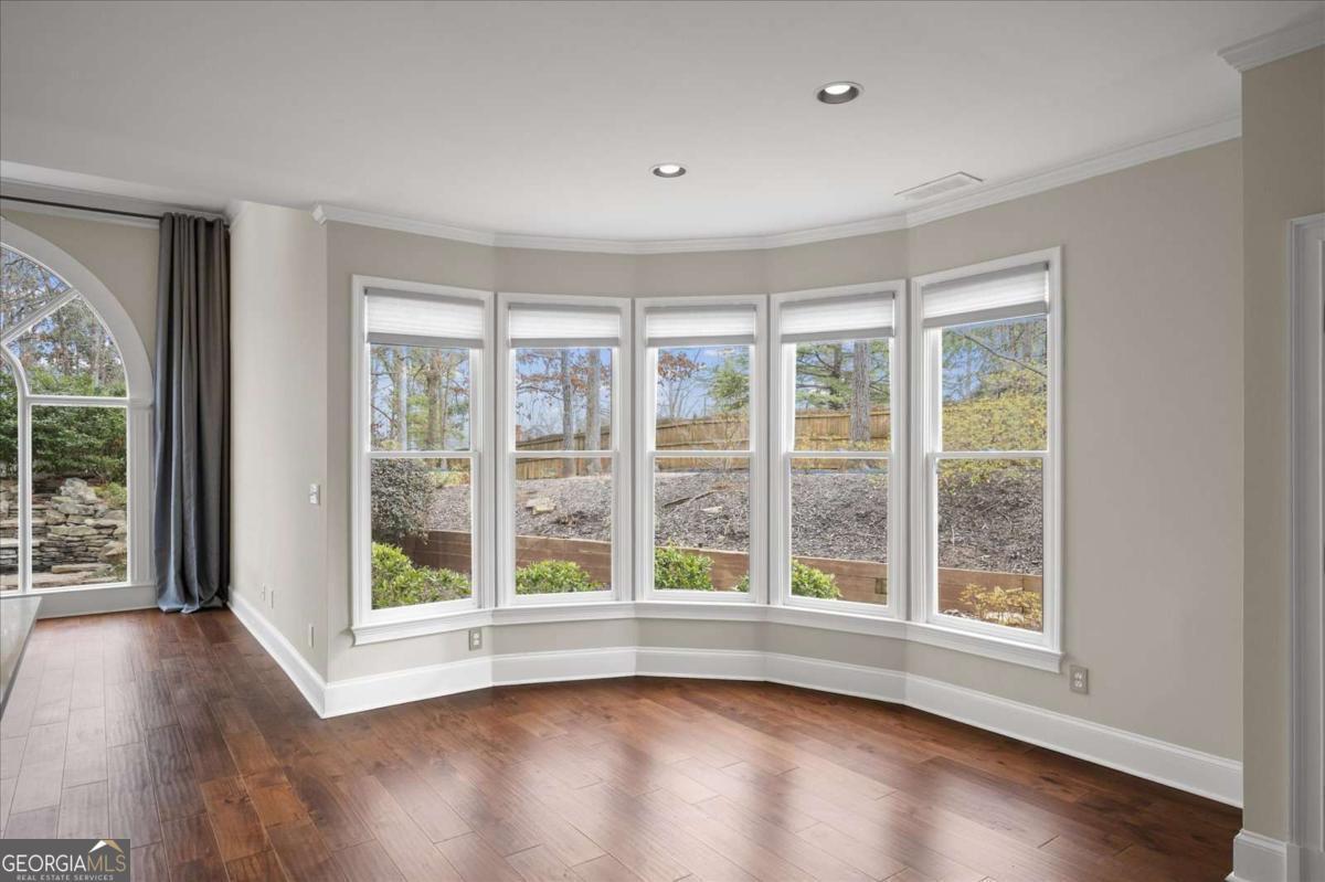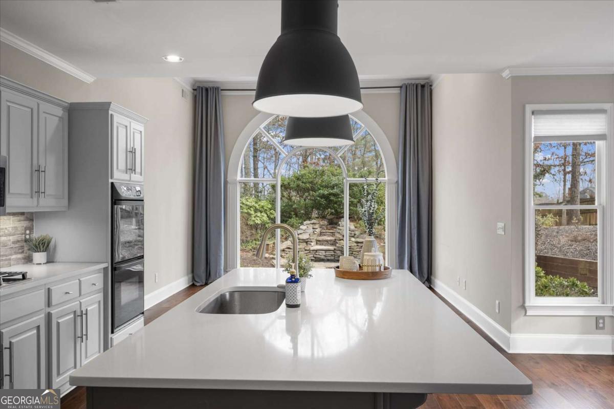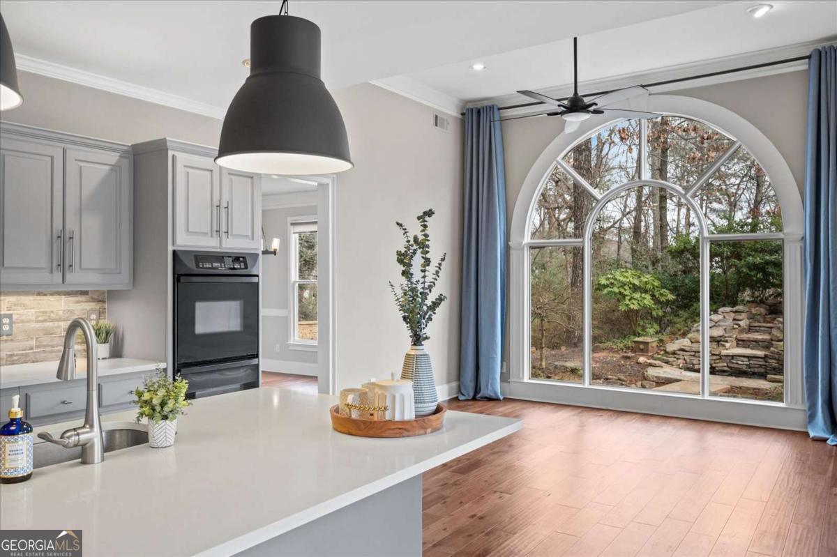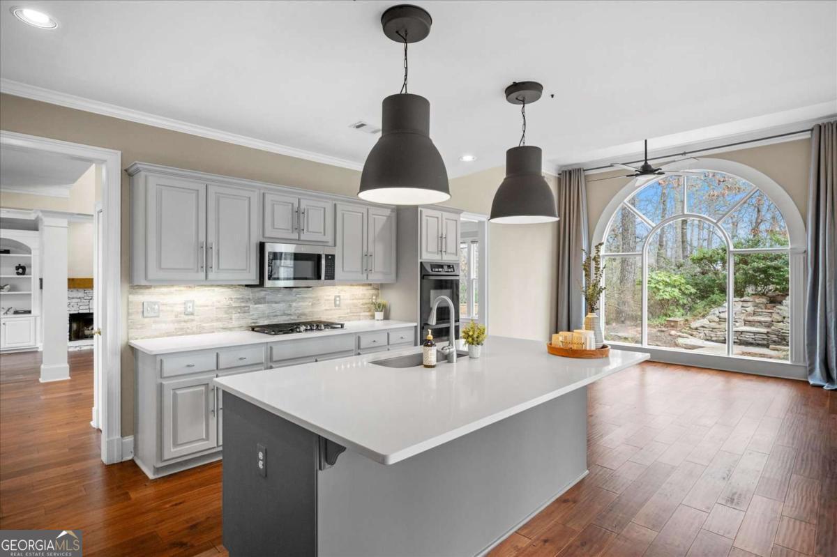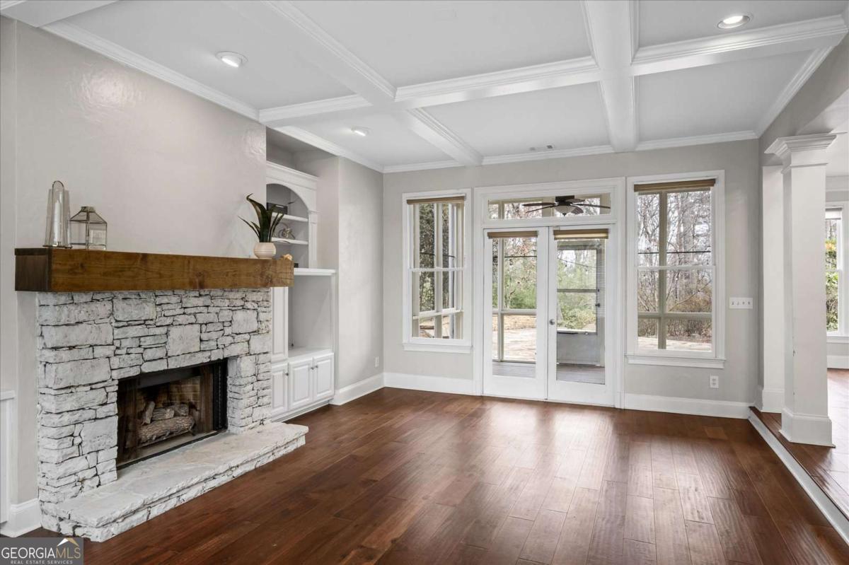 Nestled on a serene cul-de-sac in the sought-after Spalding Heights neighborhood, this beautifully renovated home sits on a lush, private 0.8-acre lot that feels like a tranquil retreat! Upon entering, you're greeted by soaring high ceilings and gleaming wide-plank hardwood floors. Fresh paint and modern lighting add a crisp, inviting ambiance throughout. The heart of the home, the kitchen, includes a spacious island, breakfast bar, pantry, and a sunny breakfast nook adjacent to a cozy keeping room-perfect for casual gatherings or morning coffee. The two-story foyer leads into a grand great room with a coffered ceiling, where large windows offer scenic views and abundant natural light. Step through sliding doors to the screened porch and flagstone patio-ideal for entertaining or quiet relaxation. A charming terraced waterfall flows into a koi pond, adding a touch of serenity to the backyard oasis. A versatile bedroom/office with an adjacent full bath on the main level offers both flexibility & comfort-perfect for guests! Upstairs, the Primary Suite is a private sanctuary, featuring a tray ceiling, sitting area, spa-like bath with dual quartz vanities, a soaking tub, roomy shower, and an expansive walk-in closet. Three additional bedrooms and two upgraded baths complete the upper level. Outside, the fully fenced backyard features a Japanese garden, mature landscaping, and a generous level area perfect for a fire pit, play set, or simply enjoying time outdoors. This home's prime Sandy Springs location offers both tranquility and convenience. It's just minutes from Dunwoody Country Club and nearby shopping and dining options, providing the perfect blend of suburban peace and city-side amenities. This gem offers an exceptional opportunity to own a captivating and thoughtfully updated residence that perfectly balances indoor elegance with outdoor charm. Ideal for entertainers or anyone seeking a serene sanctuary with modern comforts and effortless access to the best of Sandy Springs!