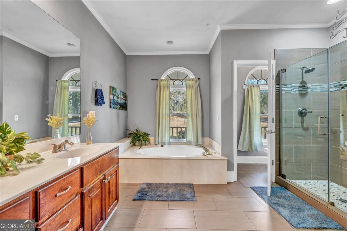 - Interior FeaturesBookcases, Double Vanity, High Ceilings, Master On Main Level, Separate Shower, Split Bedroom Plan, Tile Bath, Tray Ceiling(s), Vaulted Ceiling(s), Walk-In Closet(s), Whirlpool Bath