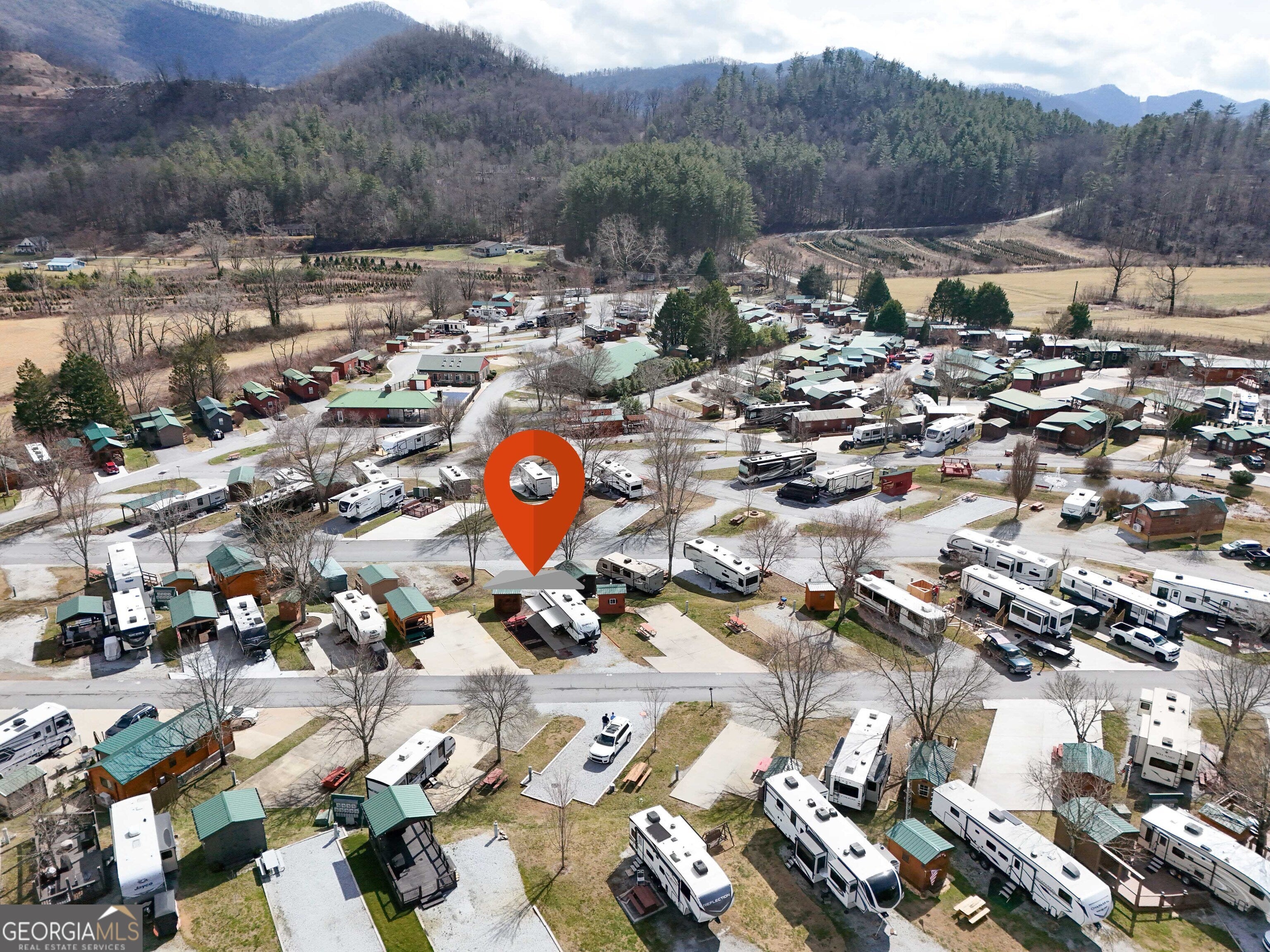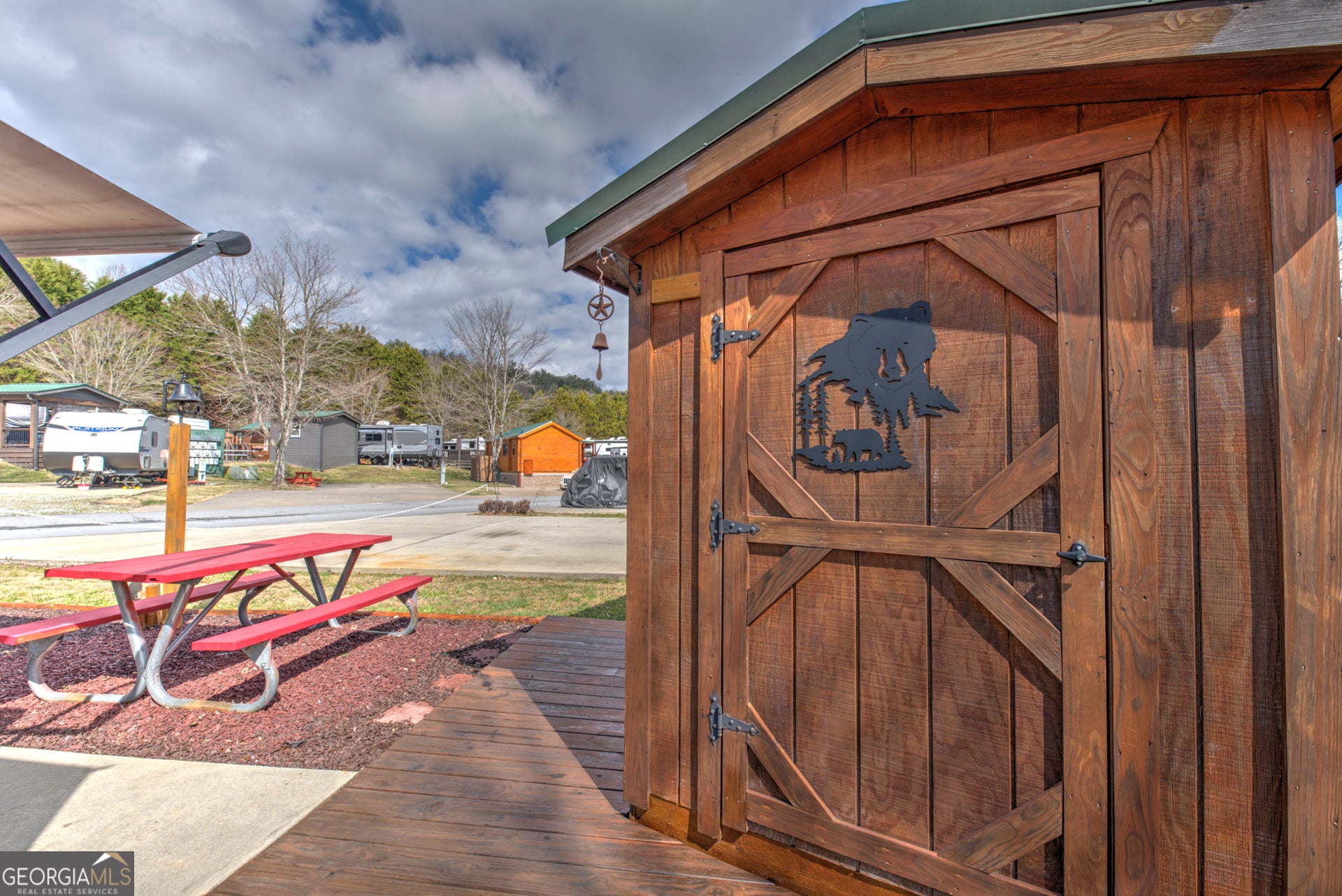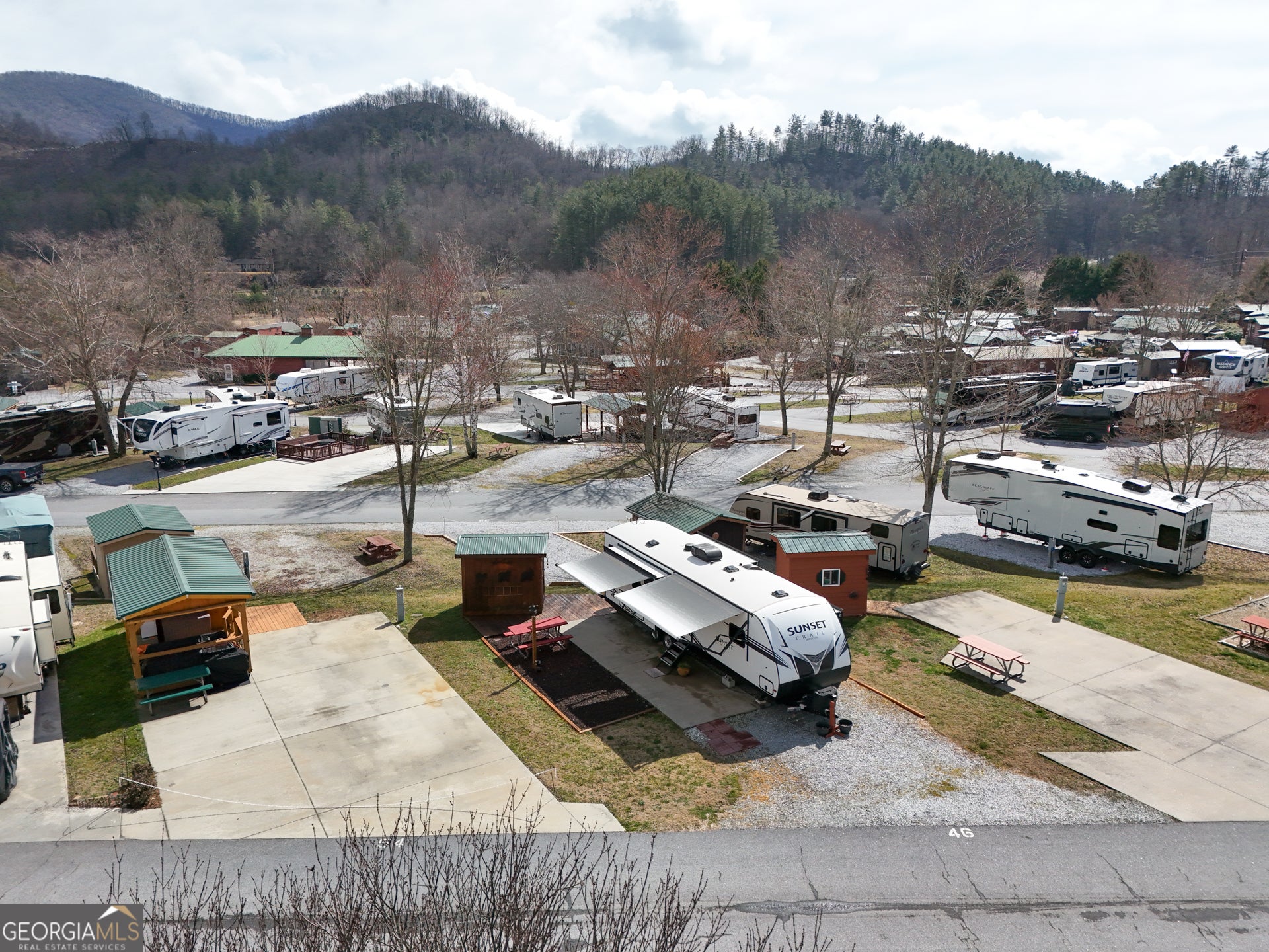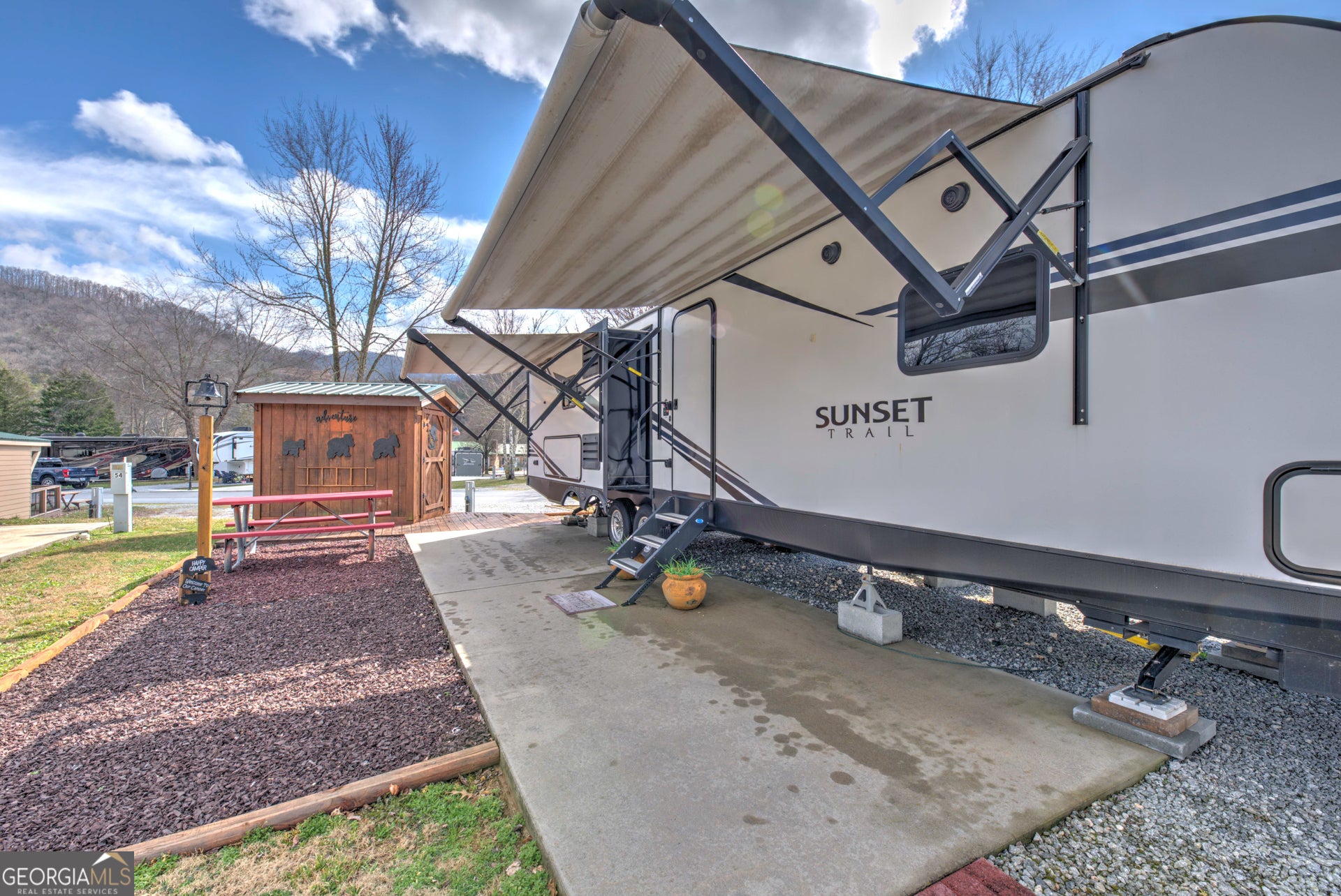 Discover Lot 46 on Holiday Rambler Lane, a private RV lot in River Vista RV Resort, Dillard, GA. This lot features a partial concrete pad, picnic table, wooden deck, and shed-perfect for your mountain getaway in scenic Rabun County. Take advantage of resort amenities, including an outdoor pool, fitness center, Sauna, Wifi, and more. Ideally located just minutes from Dillard and only 20-25 minutes from Highlands, NC, you'll enjoy easy access to hiking, waterfalls, golf, lakes, and all the best mountain attractions. The camper shown in the photo is optional and available for separate purchase. The lot is also available for independent purchase.