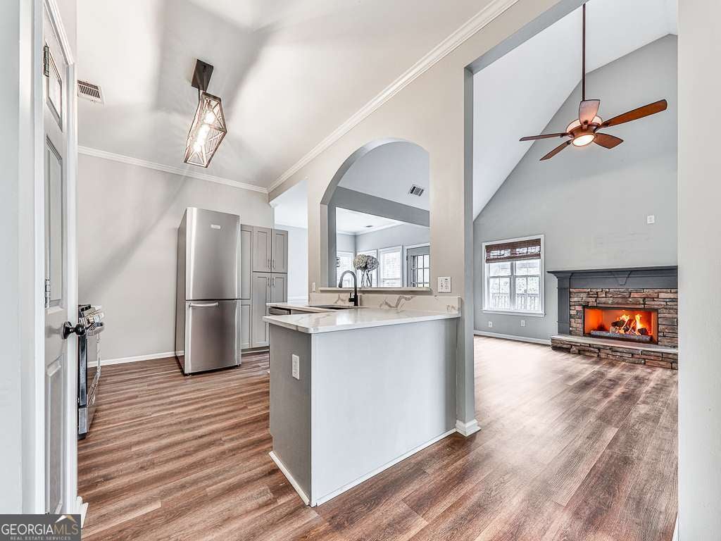 Welcome home to this adorable 3-bedroom, 2-bath ranch located in the highly desirable Bridgemill community. Offering true move-in convenience, this home features an open-concept floor plan with the kitchen overlooking the cozy fireplace and spacious living area - perfect for everyday living and entertaining. The beautifully updated kitchen showcases designer cabinetry, quartz countertops, and modern finishes. Luxury vinyl plank flooring flows throughout the home, adding both style and durability. The guest bath has been updated with a new vanity, and additional improvements include new garage doors. Step outside to enjoy your private backyard - ideal for relaxing, gardening, or hosting friends and family. Beyond the home, the community offers exceptional amenities including golf, swim, tennis, pickleball, a fitness center, and a fantastic on-site restaurant - creating the perfect blend of recreation, convenience, and connection. This home offers not just a place to live, but a lifestyle to love. With its thoughtful updates, inviting layout, and prime location, this home is ready for its next owner to move right in and start making memories.