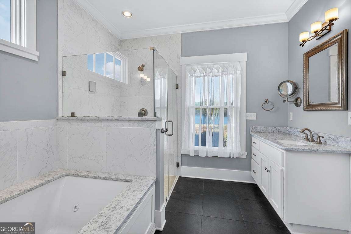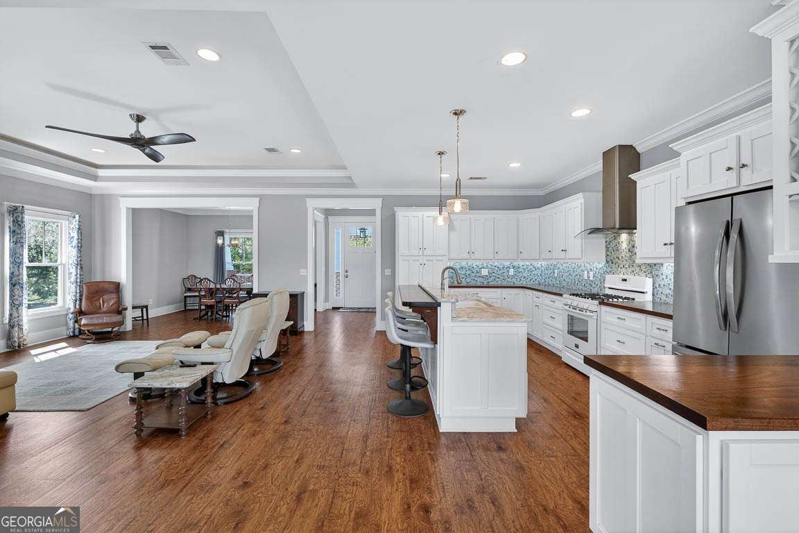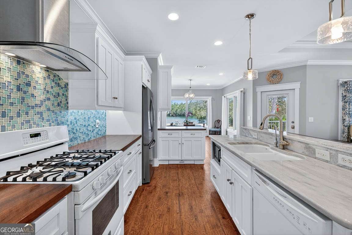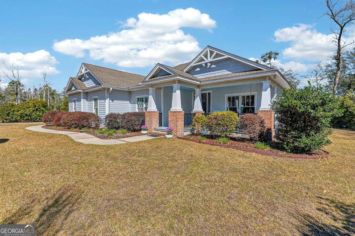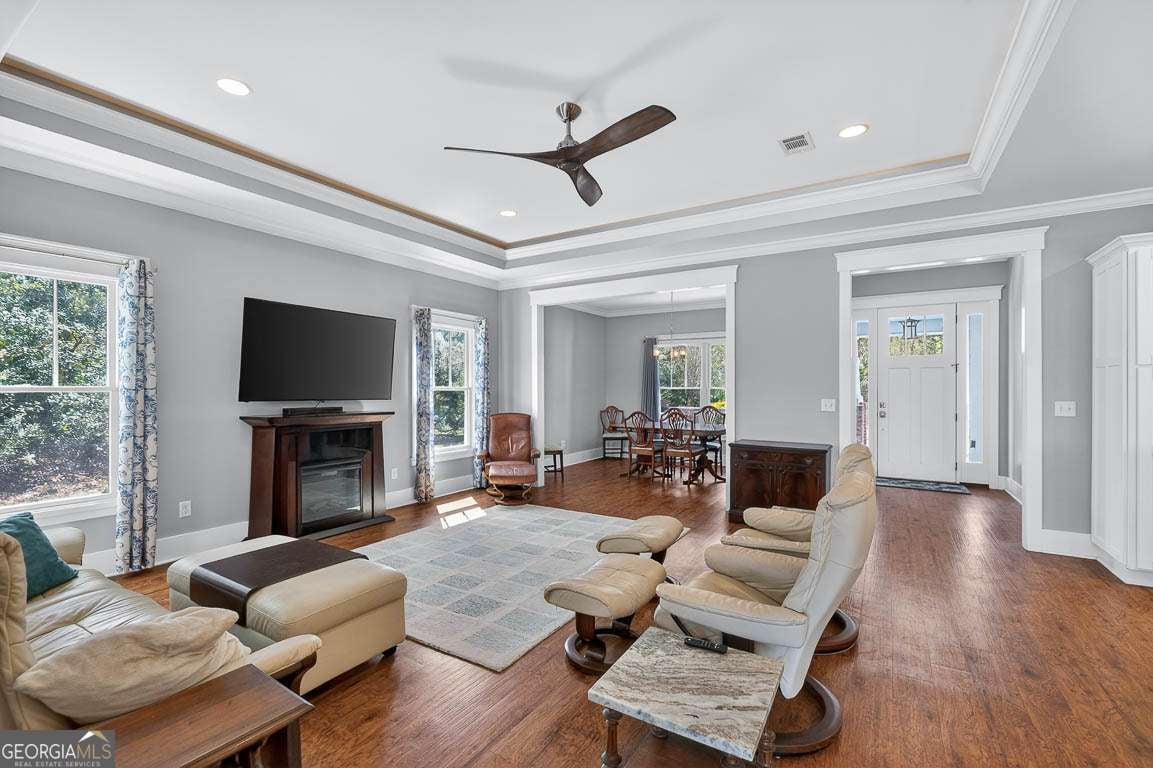 Welcome to private lakefront living in the gated waterfront community of Maiden Creek. This custom built residence is positioned on just over half an acre. Beautifully designed 3-bedroom, 2-bath home offers peaceful water views from nearly every main living space and exceptional privacy. The coastal craftsman exterior welcomes you with classic front porch charm and manicured landscaping. Inside, soaring tray ceilings with cove lighting, extensive crown molding, and wide plank luxury vinyl flooring create a refined yet comfortable atmosphere throughout the open-concept design. The living area features an electric fireplace and is framed by oversized windows that capture stunning lake views. The kitchen is both functional and stylish, offering a gas range, stainless appliances, custom cabinetry, pantry, solid surface countertops, wood-topped island with bar seating, decorative mosaic tile backsplash, and built-in wine storage. The primary suite overlooks the water and features a dramatic tray ceiling and direct access to the laundry room for added convenience. The spa-inspired bath includes a soaking tub with jets, walk-in tiled shower with glass enclosure, marble finishes, and elegant detailing. Step outside to your covered rear porch overlooking the lake - perfect for morning coffee or evening sunsets. The backyard offers direct lake access and a dedicated fire pit area by the water, creating an inviting space for gathering under the stars. Additional upgrades include reverse osmosis water filtration, a separate irrigation well, 50-amp RV hookup, gas appliances, and an attached garage. Maiden Creek residents enjoy gated entry, community pool, clubhouse, fitness center, boat dock, boat lift, and deep water access - offering a true coastal lifestyle experience.