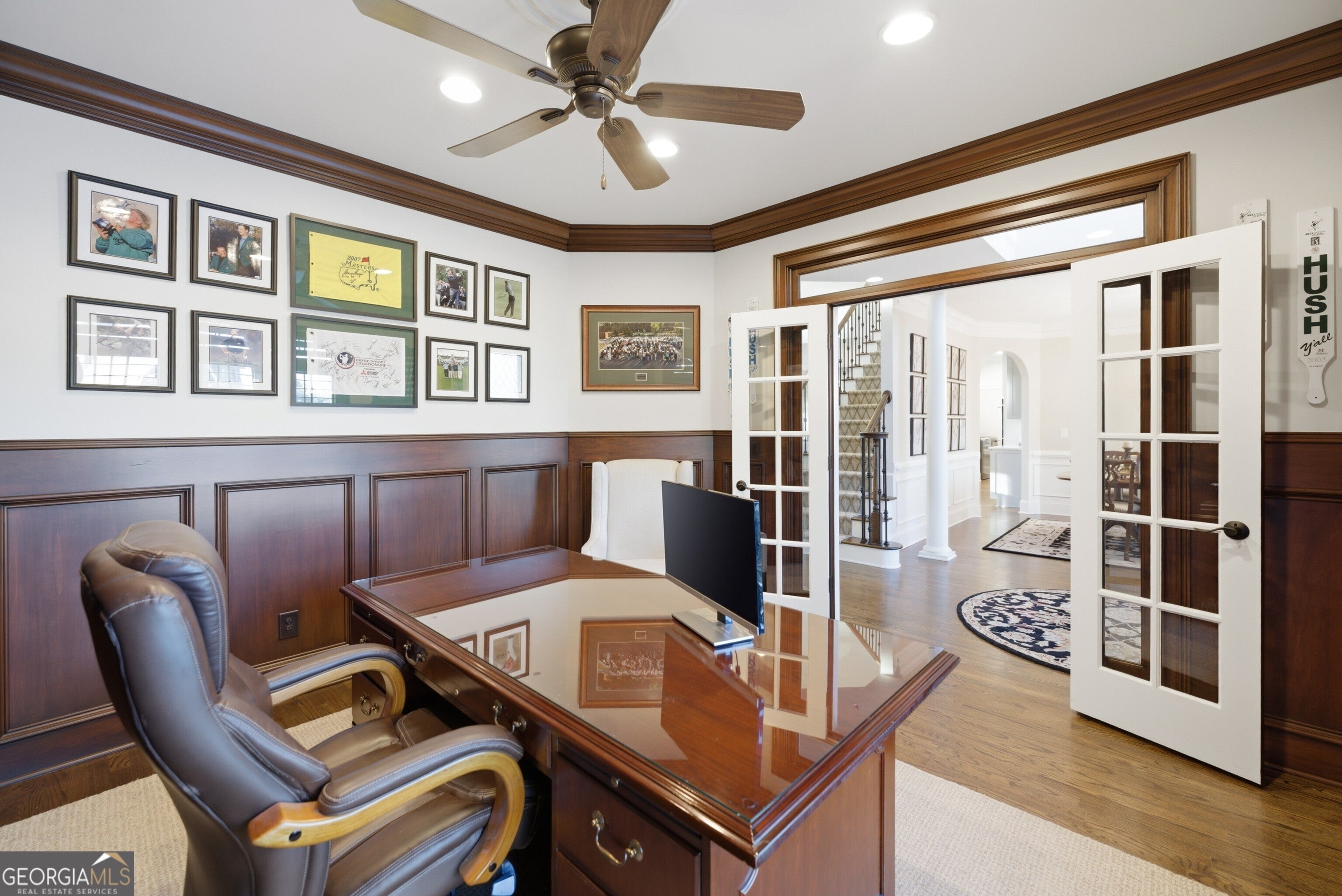 Welcome to an extraordinary golf course retreat offering breathtaking long views of the 12th green and resort-style outdoor living at its finest. Enter through the stunning MaxCraft doors into a home that has been beautifully renovated with impeccable attention to detail. The amazing fully renovated Chef's Kitchen is truly the heart of the home featuring double ovens, microwave drawer, gas cooktop, quartz countertops, elegant gray custom cabinetry, and a built-in pantry designed for both beauty and function. The spacious laundry mud room includes built-in cabinetry for organization and convenience. The family room impresses with a stacked stone fireplace soaring to the ceiling and is complemented by Hunter Douglas remote-powered shades for effortless light control. A handsome Gentleman's Office with custom built-ins offers a refined workspace, while a wall of windows frames spectacular views of the resort-style backyard complete with a heated pool, spill-over hot tub, water fountain features, slide, and sweeping golf course vistas. Hardwood floors flow throughout the main level, adding warmth and sophistication. Upstairs, the luxurious Master Suite features a trey ceiling, paddle fan, and a custom "Space maker" closet system including a dedicated shoe closet. The renovated Master Bath is a private spa retreat showcasing a large walk-in marble shower with seat, free-standing soaking tub, marble floors, and granite countertops Three additional bedrooms complete the upper level including one private bath and a Jack & Jill bath for convenience. The finished terrace level is designed for entertaining and relaxation, offering gaming room, spacious recreation room, media room, guest bedroom and full bath. Beverage bar with ice maker and mirrored seating area. This exceptional home combines luxury, comfort, and unbeatable golf course views truly a rare opportunity in Hamilton Mill.