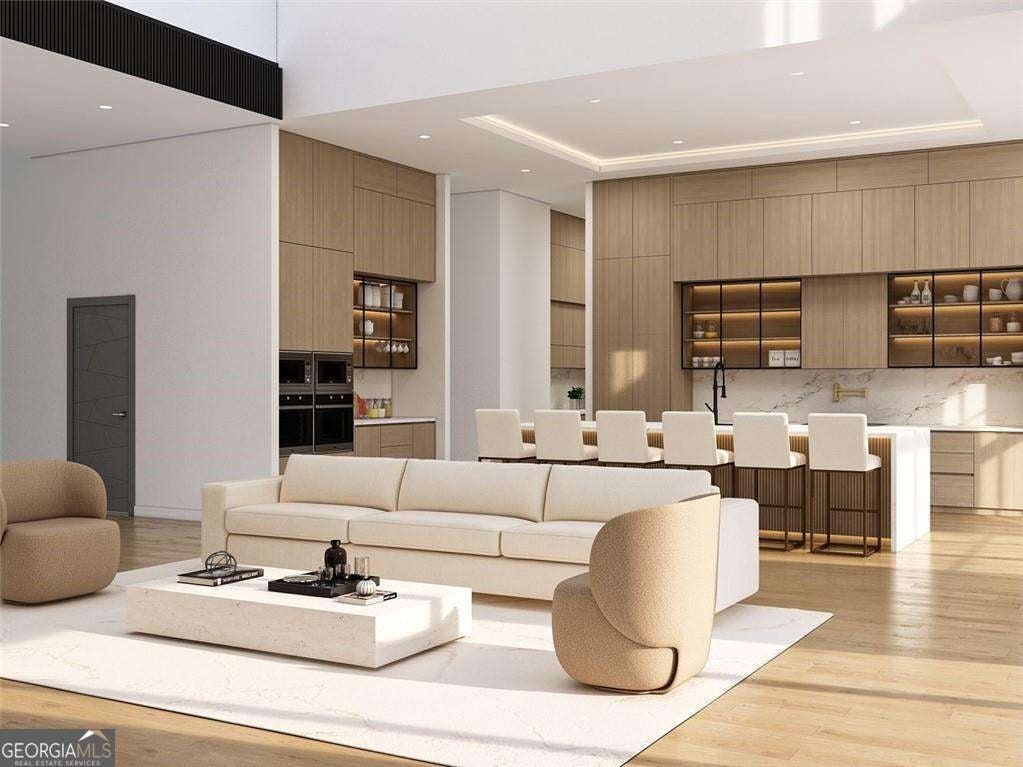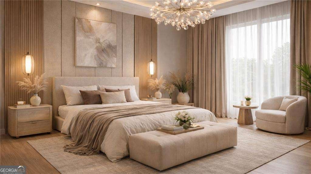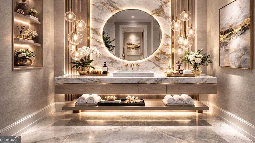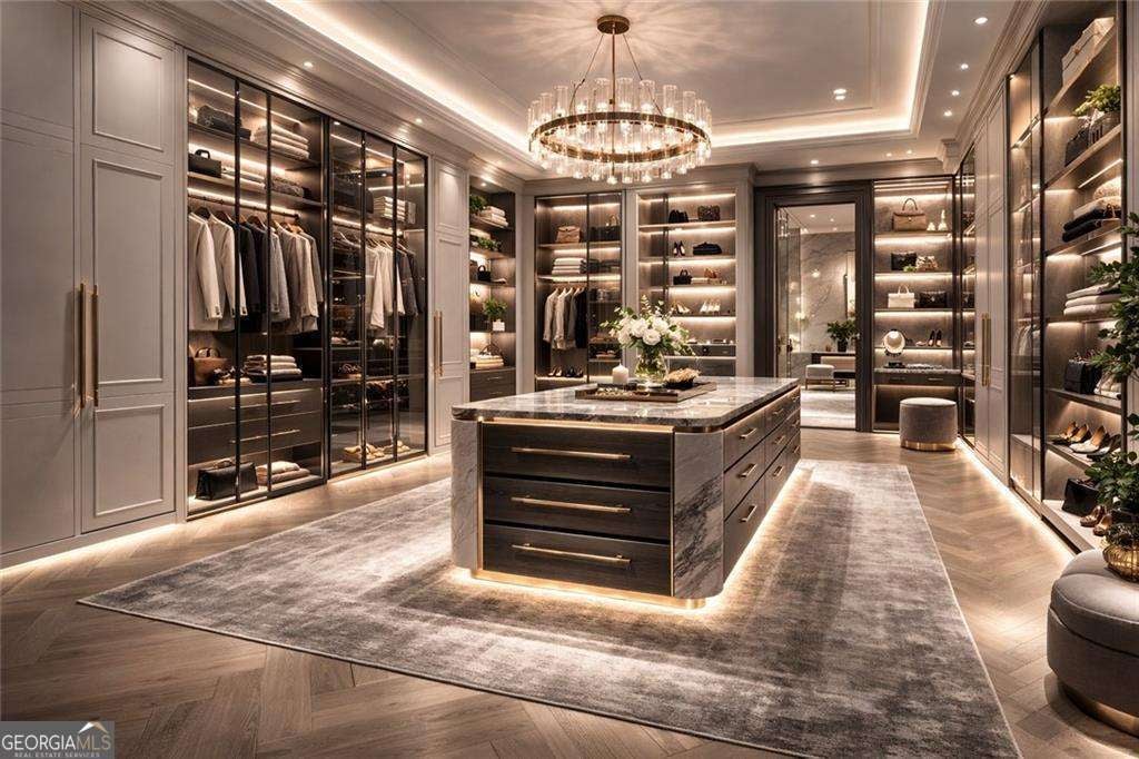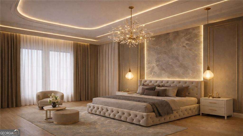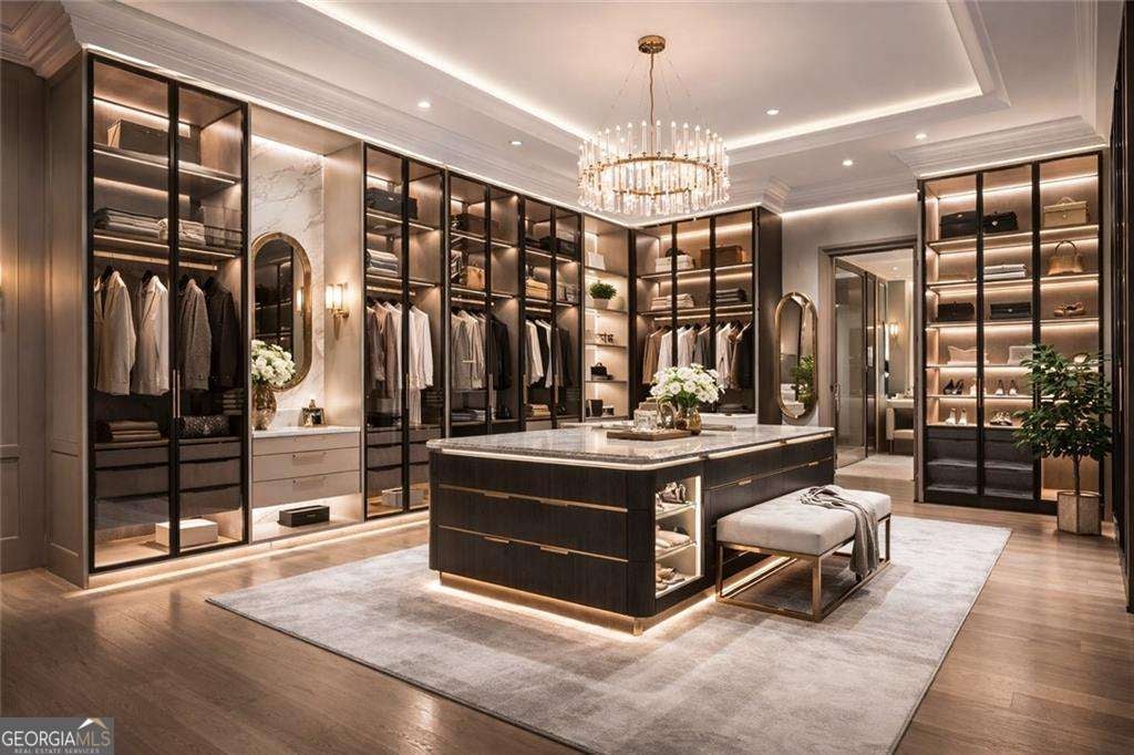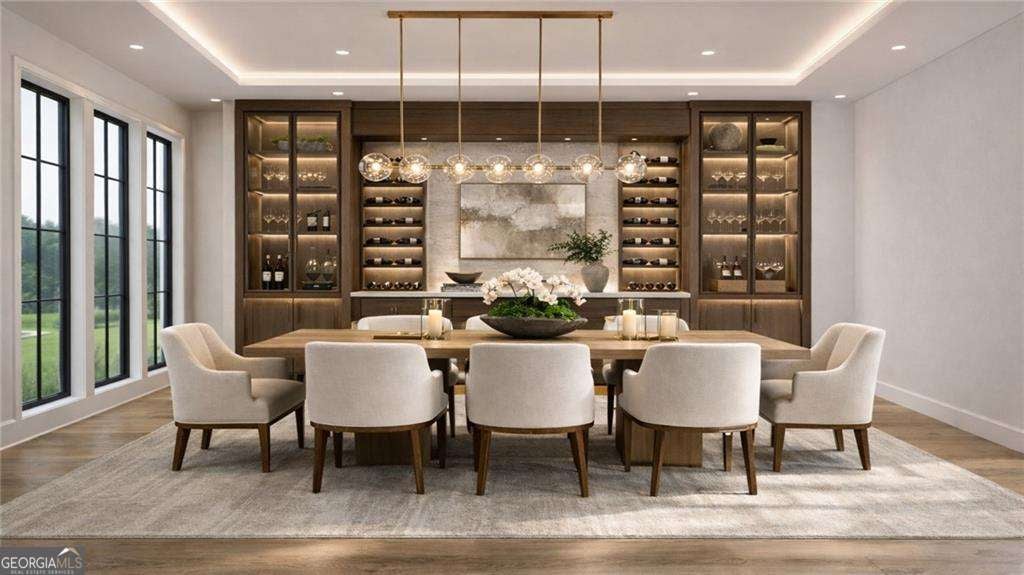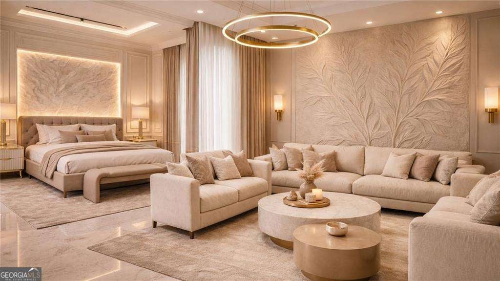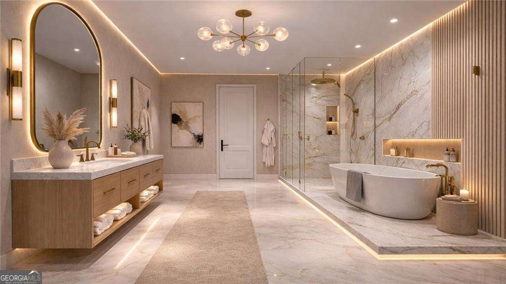Introducing a rare opportunity to build a fully customized luxury estate on a private 1.49-acre wooded, level lot within an elite gated golf community featuring a celebrated Rees Jones-designed 18-hole championship course known for its legendary back nine. With only 110 architecturally distinctive residences, this enclave is defined by privacy, artisan craftsmanship, and estate-level living - all while benefiting from low Cherokee County property taxes and reasonably low HOA dues for a prestigious golf course community. As you enter, a dramatic 24-foot grand foyer unfolds into an equally impressive 24-foot great room, immediately establishing scale and sophistication. A striking porcelain slab feature wall with a 60-inch linear gas fireplace sets the tone for the space. Expansive walls of glass and aluminum accordion-style doors open seamlessly to a covered loggia with fireplace and optional surround sound, creating a true indoor-outdoor luxury lifestyle. The expansive, private backyard offers ideal conditions for a future resort-style pool and outdoor kitchen, allowing the next owner to design a customized outdoor retreat. Wide-plank white oak engineered hardwood flooring flows throughout the main level, enhancing warmth and continuity. The chef's kitchen is a true showpiece, featuring custom European cabinetry, fully paneled appliances for a seamless integrated design, a dramatic 12-foot by 5-foot island, and a professional-grade 48-inch gas range with integrated pot filler. Quartzite countertop allowances elevate the finish level. The adjacent breakfast room showcases 15-foot vaulted ceilings and a built-in wet bar, creating a natural gathering space. A discreet hidden door leads from the mudroom into a fully equipped prep kitchen with its own 8-foot island and 36-inch gas range for seamless entertaining. The formal dining room includes a built-in dry bar, while the main-level powder room features a floating vanity, cabinet lighting, and a bidet toilet, reflecting elevated attention to detail. The main-level owner's suite is a private sanctuary highlighted by 17-foot vaulted ceilings, a linear fireplace, and access to a covered balcony overlooking the backyard. The spa-inspired bath offers a seven-foot walk-in shower with full tile surround and frameless glass enclosure, plus the option for a dramatic seven-foot freestanding soaking tub. Dual water closets, dual vanities, and an expansive walk-in closet with center island complete the suite, with laundry access on both floors. Every secondary bedroom is designed as a private en suite with oversized custom walk-in closets. Above the garage, an attached private guest residence with its own separate entrance functions as an in-law suite, au pair quarters, or executive retreat - essentially a private wing within the estate. The unfinished terrace level allows for a bespoke lower level design, whether a home theater, golf simulator, wellness spa, or wine lounge. An elevator shaft is pre-planned for future installation. This energy-efficient estate includes two tankless gas water heaters and EV charging capability in all four garage bays. Residents enjoy championship golf and secure gated entry, all just minutes from Avalon and Halcyon with convenient access to GA-400. With plans approved and ground breaking imminent, this is the ideal time to personalize structural selections and luxury finishes creating a custom legacy estate within one of Alpharetta's most prestigious golf communities.
