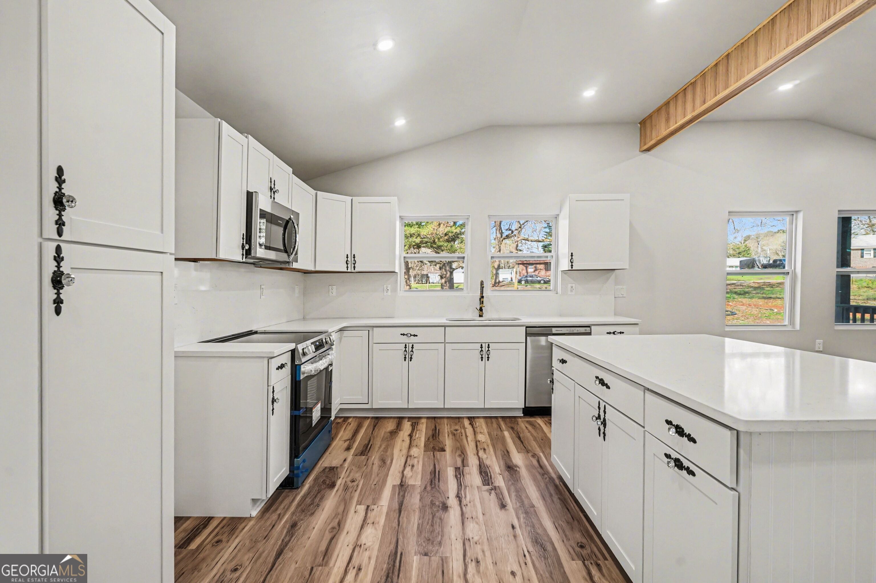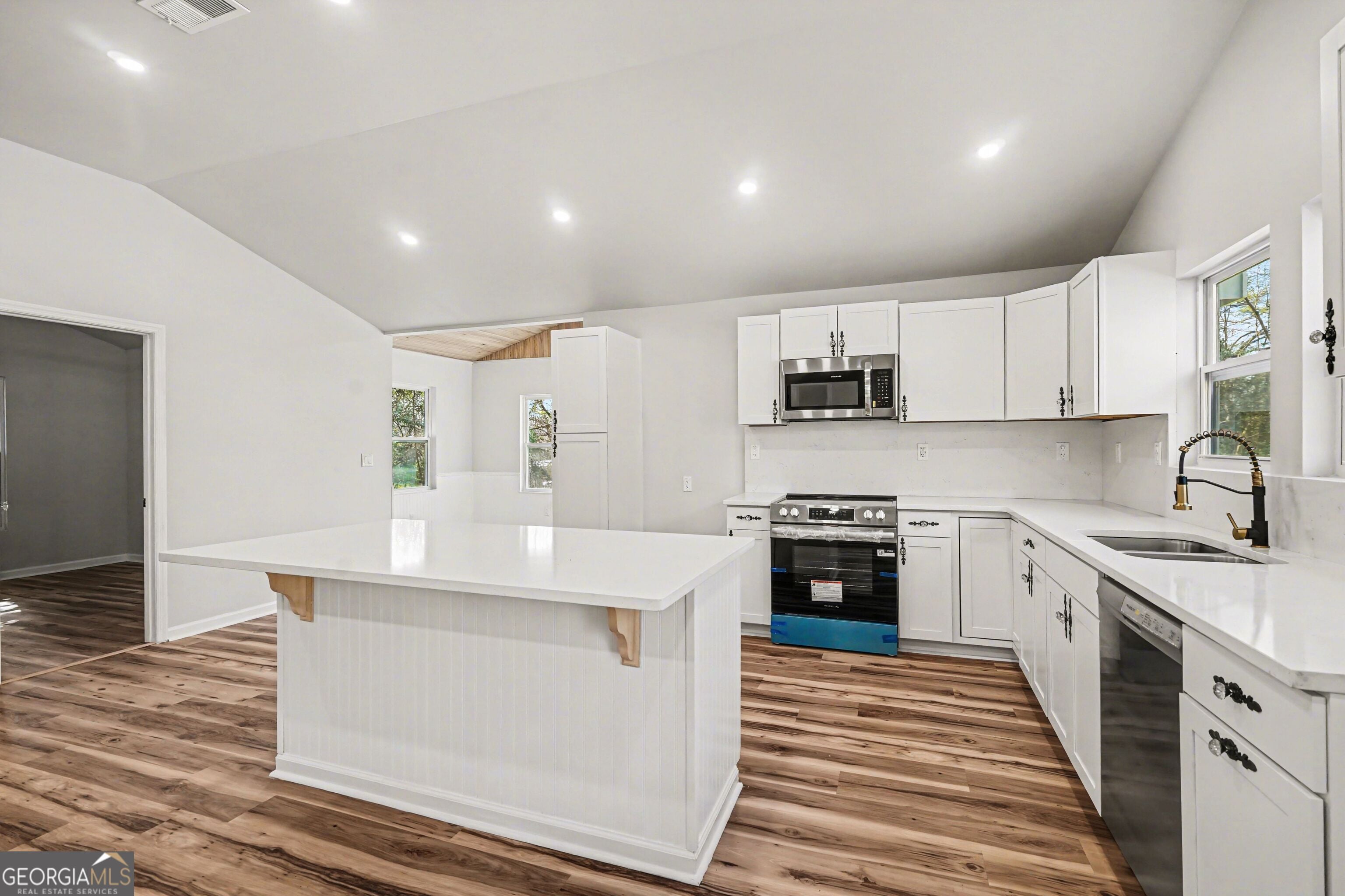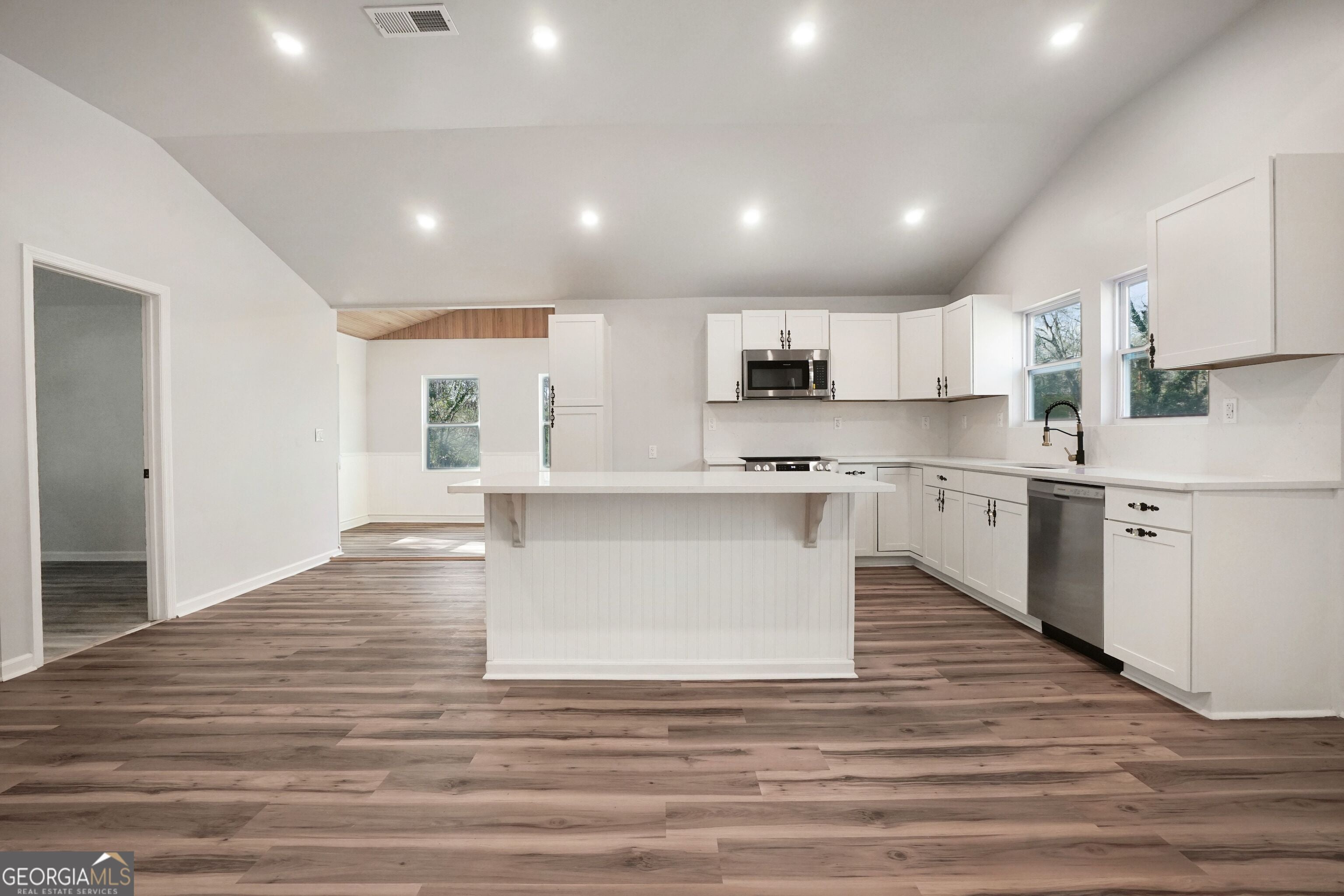 Step into this stunning, fully renovated home where everything is brand new from top to bottom. The open-concept layout is highlighted by cathedral and high ceilings, creating an airy, spacious feel throughout. The gorgeous chef's kitchen features brand-new cabinets, quartz countertops, stainless steel appliances, and a large center island with seating, perfect for entertaining or everyday living. A dedicated formal dining area/4-season room offers flexible space for gatherings year-round. Beautiful LVP flooring flows throughout the home, adding both style and durability. Thoughtful accents provide custom touches throughout, with shiplap and bead board. Step outside to a private back deck, ideal for relaxing or hosting guests.