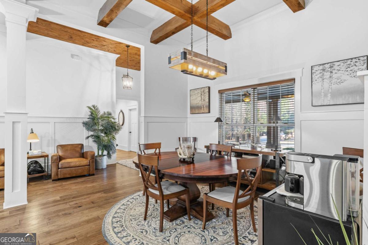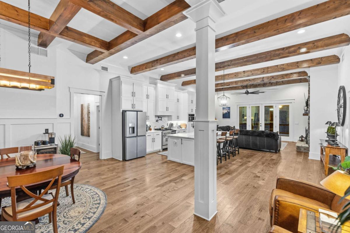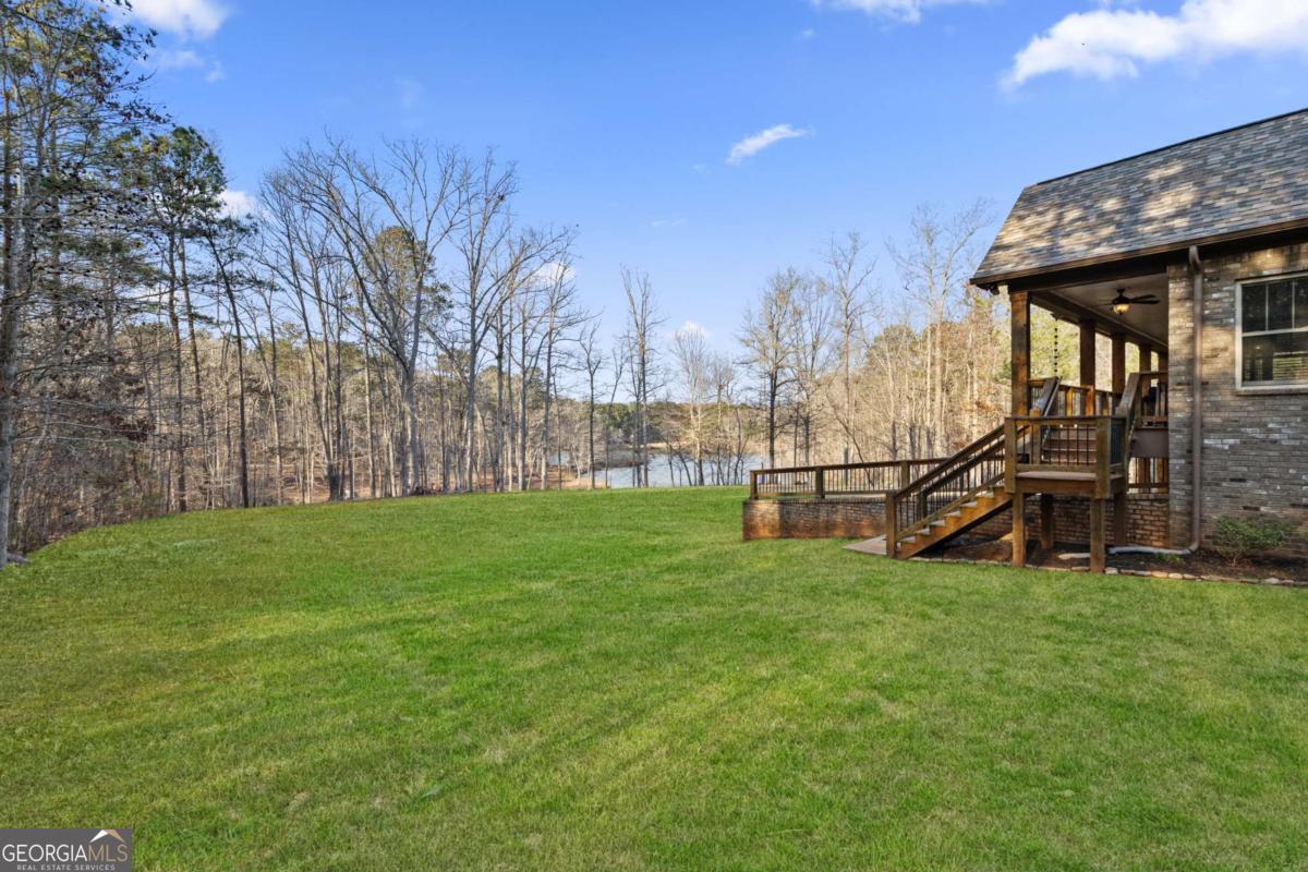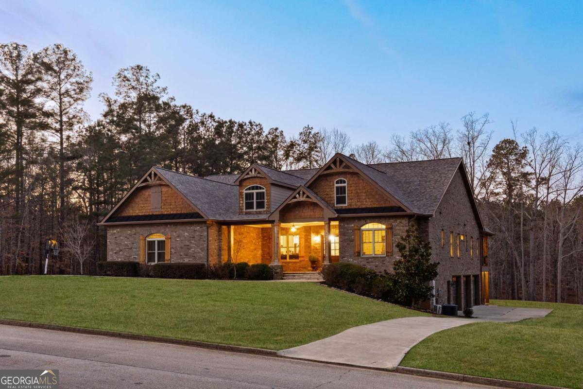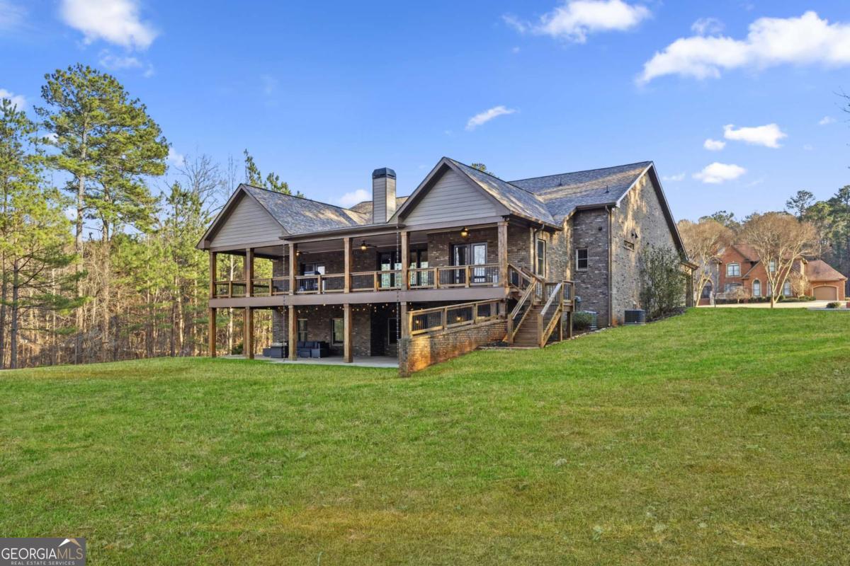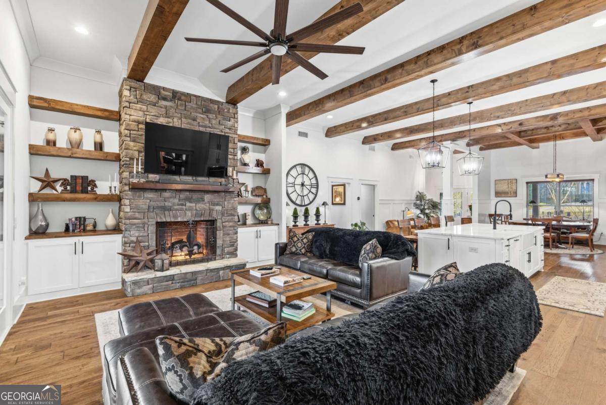 Welcome to The Saint Regis. - Nestled on approximately 3 private acres with direct access to Shepard's Lake, 407 Saint Regis Drive is a rare country-rustic retreat. This four-sided brick estate features an oversized front porch and an expansive rear deck designed for lakeside relaxation. Car enthusiasts will prize the incredible six-car garage capacity, including a three-car main-level garage and a climate-controlled three-car lower-level garage; a dream for collectors. The foyer welcomes you with a wood tongue-and-groove ceiling, leading to an interior rich with crown molding and board and batten wainscoting. The main level showcases quartz countertops, bespoke cabinetry, and a dining room with elegant exposed beam coffered ceilings. The living area is anchored by a stately brick fireplace flanked by custom built-in bookshelves with floating wood shelves. The primary suite is a true sanctuary, boasting dramatic 25-foot vaulted ceilings with exposed wood beams and direct deck access for panoramic water views. The fully finished terrace level operates as a high-performing Airbnb generating approximately $3,000 per month. This independent apartment includes a separate entrance, private driveway, full kitchen, laundry, and dedicated HVAC. Perfectly located, this home offers easy access to local favorites like George Street Park and the historic Oxford College of Emory University trail system. Nearby Covington Square provides premier dining and entertainment at The Social Goat and City Center Park. Families will appreciate proximity to top-rated schools like Walnut Grove Elementary and High School. While enjoying complete privacy, you remain just minutes from everyday conveniences and a quick 45-minute drive to the vibrant city of Atlanta. This property offers a lifestyle that is both refined and relaxed-a personal lakeside sanctuary and a savvy investment.