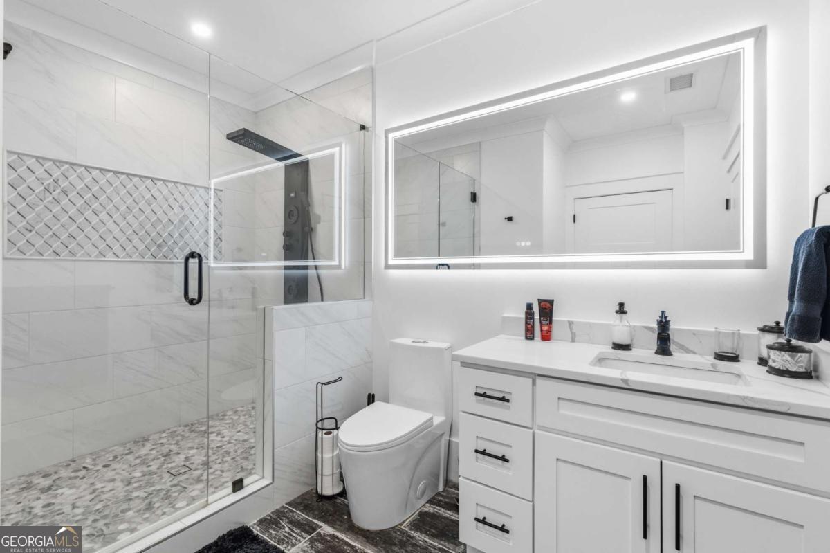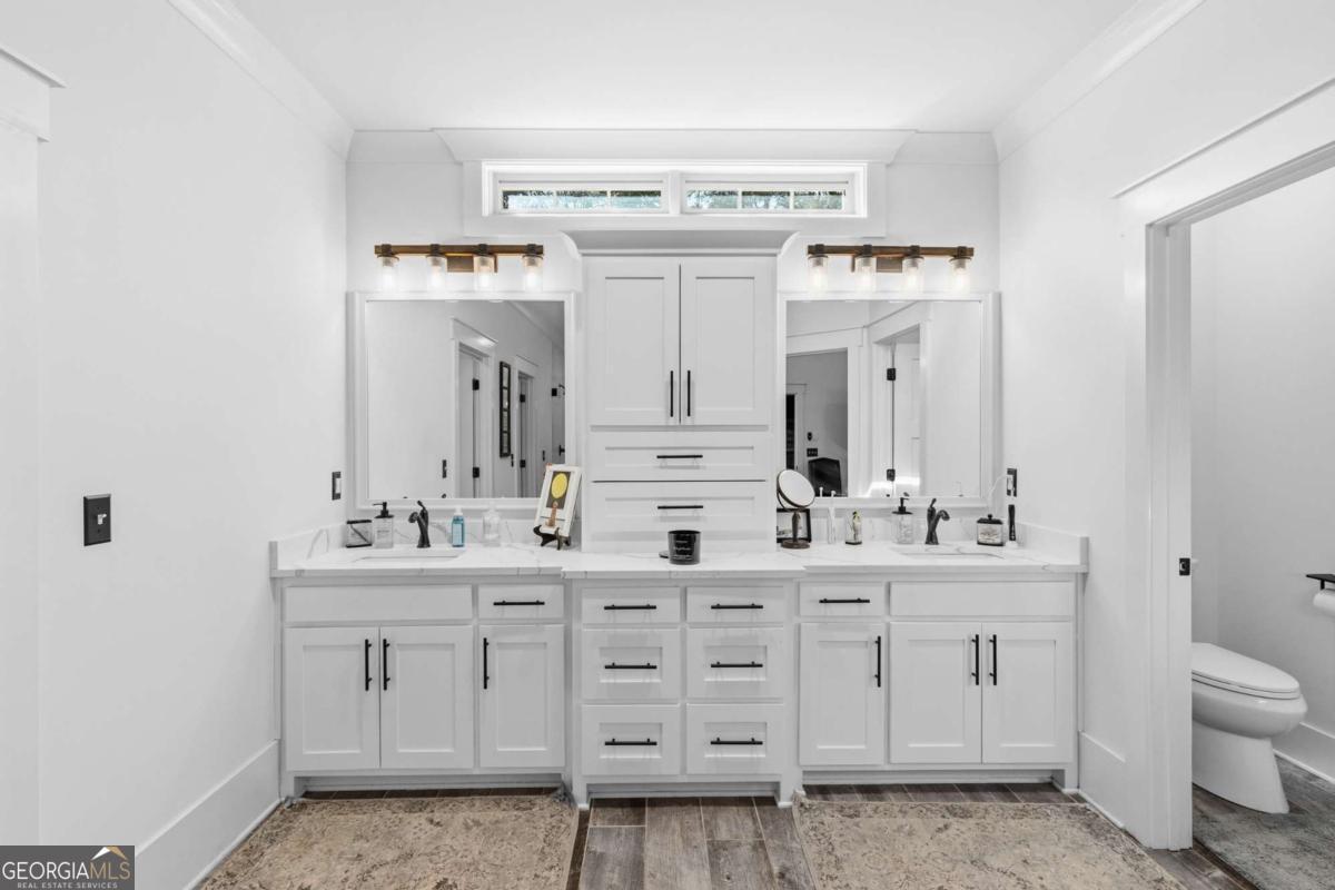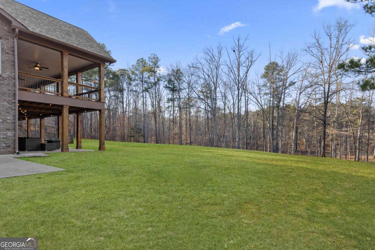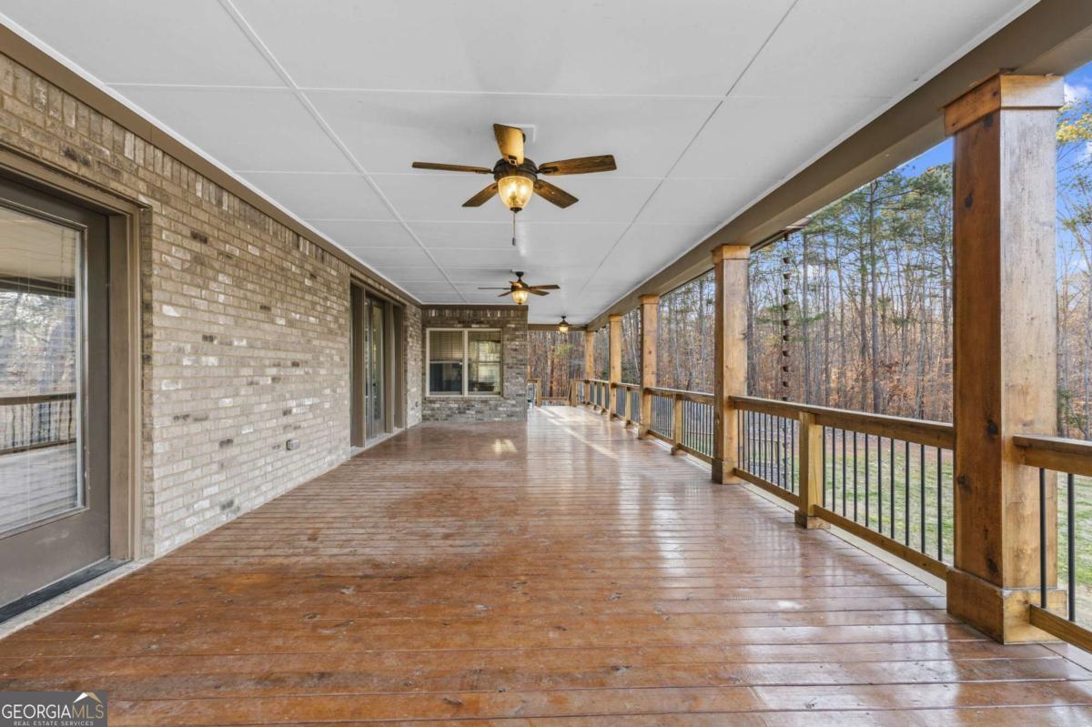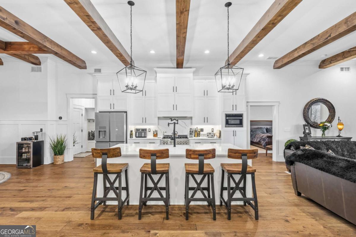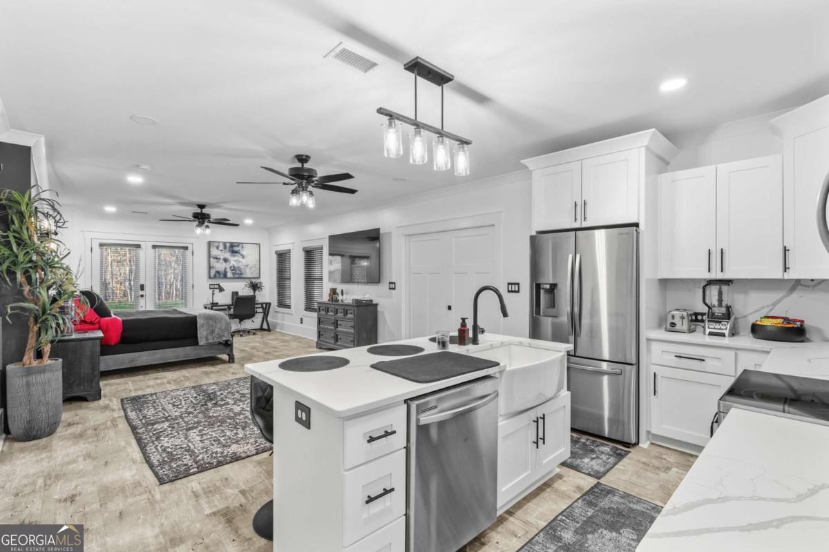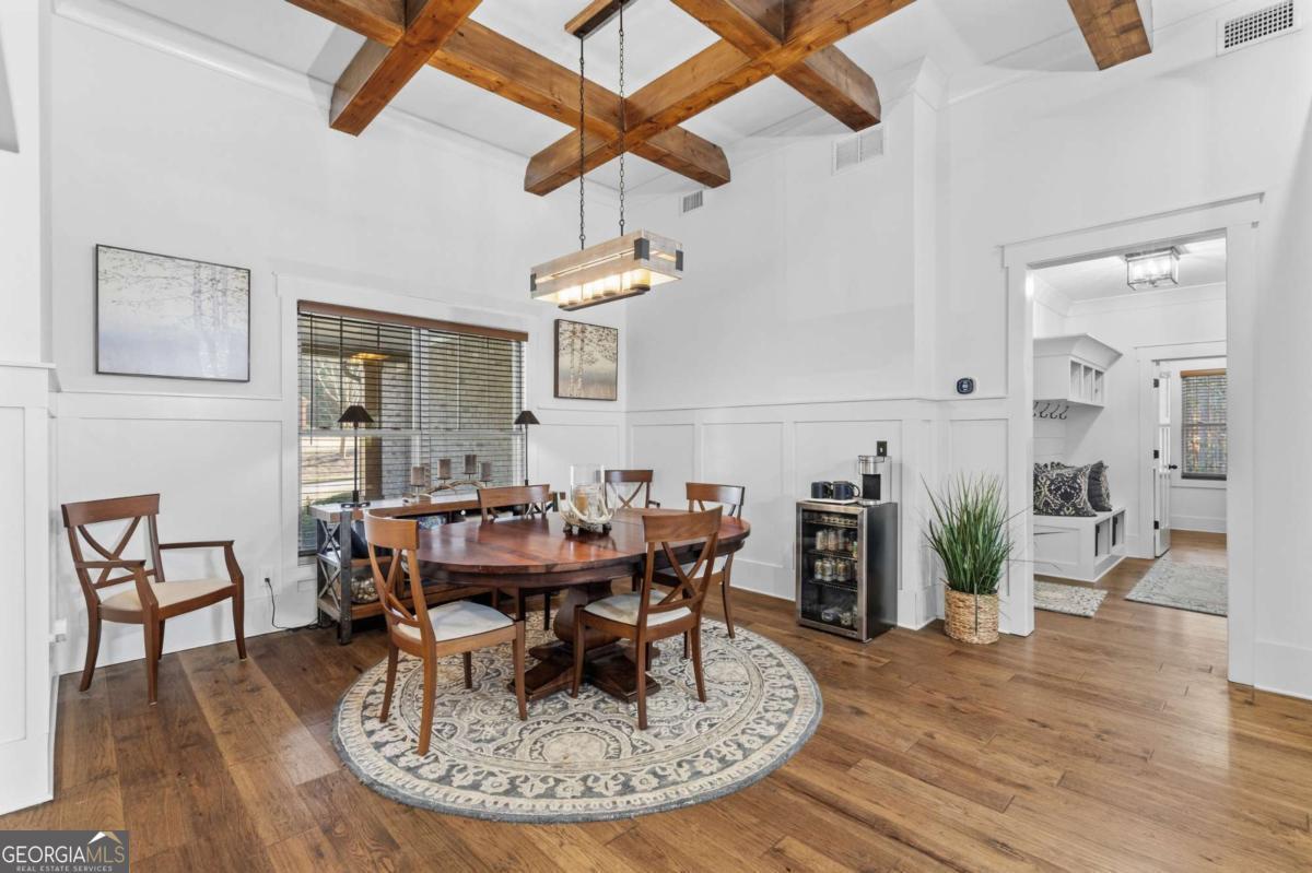 Welcome to The Saint Regis. - Nestled on approximately 3 private acres with direct access to Shepard's Lake, 407 Saint Regis Drive is a rare country-rustic retreat. This four-sided brick estate features an oversized front porch and an expansive rear deck designed for lakeside relaxation. Car enthusiasts will prize the incredible six-car garage capacity, including a three-car main-level garage and a climate-controlled three-car lower-level garage; a dream for collectors. The foyer welcomes you with a wood tongue-and-groove ceiling, leading to an interior rich with crown molding and board and batten wainscoting. The main level showcases quartz countertops, bespoke cabinetry, and a dining room with elegant exposed beam coffered ceilings. The living area is anchored by a stately brick fireplace flanked by custom built-in bookshelves with floating wood shelves. The primary suite is a true sanctuary, boasting dramatic 25-foot vaulted ceilings with exposed wood beams and direct deck access for panoramic water views. The fully finished terrace level operates as a high-performing Airbnb generating approximately $3,000 per month. This independent apartment includes a separate entrance, private driveway, full kitchen, laundry, and dedicated HVAC. Perfectly located, this home offers easy access to local favorites like George Street Park and the historic Oxford College of Emory University trail system. Nearby Covington Square provides premier dining and entertainment at The Social Goat and City Center Park. Families will appreciate proximity to top-rated schools like Walnut Grove Elementary and High School. While enjoying complete privacy, you remain just minutes from everyday conveniences and a quick 45-minute drive to the vibrant city of Atlanta. This property offers a lifestyle that is both refined and relaxed-a personal lakeside sanctuary and a savvy investment.