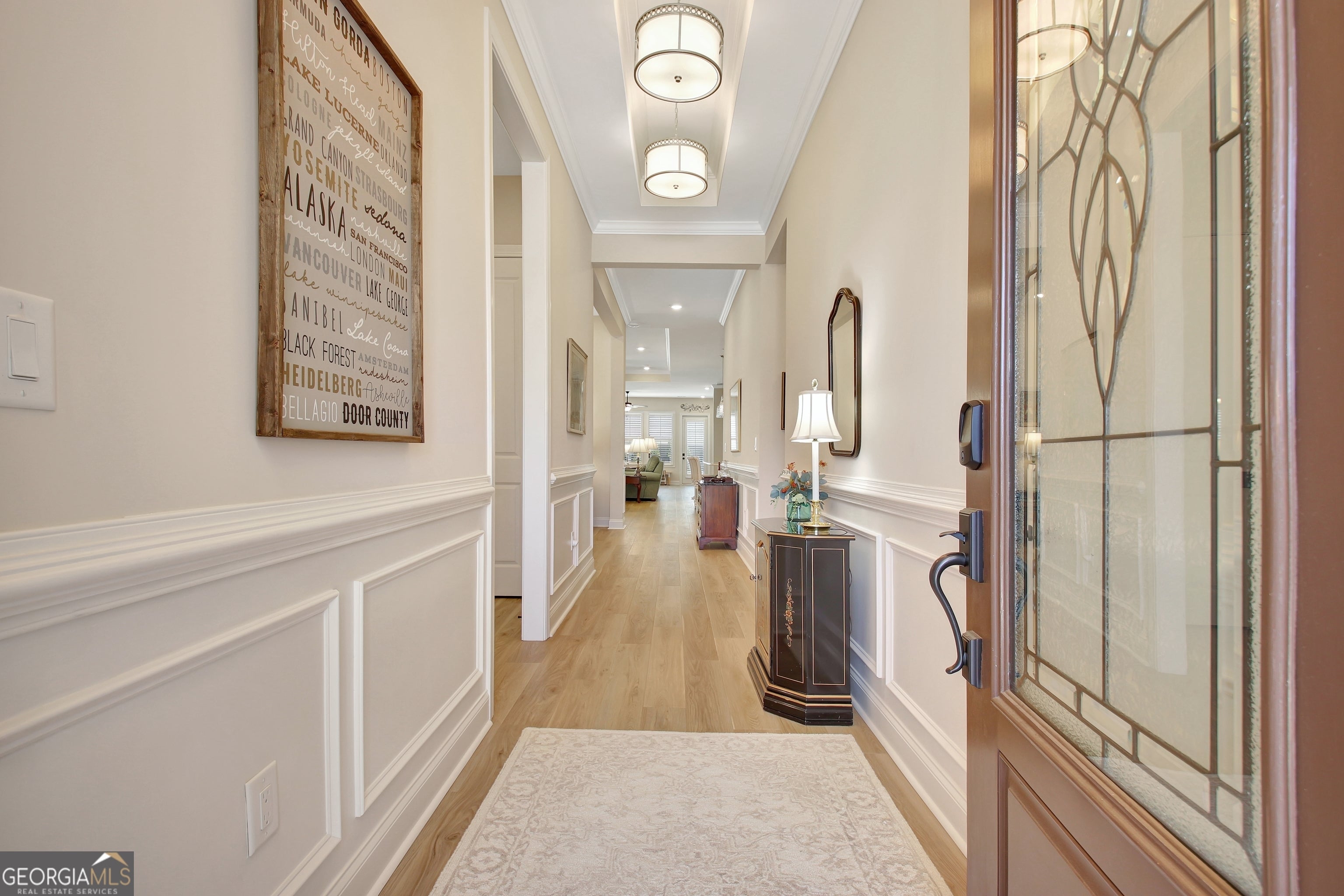 This nearly new, MOVE-IN READY, expanded Madison is perfectly positioned on a flat corner lot in Newnan's premier 55+ active adult community, Cresswind at Spring Haven. Thoughtfully upgraded throughout, this home blends refined elegance with everyday comfort in a beautifully designed one-level floor plan ideal for both daily living and entertaining. A manicured lawn and covered front porch create a warm welcome. Inside, the foyer showcases custom wainscoting and designer lighting, opening to a versatile flex room - perfect for a home office or hobby space. A front guest suite sits adjacent to a full bath featuring a tiled walk-in shower with glass enclosure. Privately situated, a third en-suite bedroom offers a relaxing tub with fully tiled surround. At the heart of the home, the stunning chef's kitchen impresses with a subway tile backsplash, soft-close cabinetry with roll-out shelves and glass-paneled doors, a large island with farmhouse sink and built-in trash/recycle drawer, and a walk-in pantry with frosted glass door. The stainless steel GE Cafe appliance package includes a 36" gas cooktop, microwave, wall oven, dishwasher, and GE Profile counter-depth French door refrigerator with water and ice dispenser. The open-concept layout seamlessly connects the kitchen, dining area, great room, and sunroom - creating an ideal space for gathering. The great room features a remote-start fireplace with granite hearth and surround and overlooks the sunroom filled with abundant natural light. The generously extended primary suite, enhanced with a tray ceiling, offers a peaceful retreat. The spa-like bath includes dual vanities, a zero-entry tiled shower with niche, handheld wand, frameless glass enclosure, and private water closet. Custom-designed closets maximize storage and organization. Outdoor living is equally impressive with an extended concrete patio overlooking professionally designed landscaping by Pike's Landscaping - perfect for enjoying peaceful afternoons in the shade. Resort-style amenities elevate the lifestyle at Cresswind at Spring Haven. The resident-exclusive clubhouse, scheduled for completion Summer 2026, will feature a state-of-the-art fitness center, yoga, aerobics and dance studios, ballroom, lounge, pickleball complex, tennis courts, resort-style pool with lap lanes, event lawn, band shell, and a full-time lifestyle director curating a vibrant social calendar. Every upgrade has been intentionally selected, creating a home where thoughtful design and elevated comfort are evident at every turn. Don't miss this rare opportunity to enjoy a beautifully upgraded, move-in ready home - without the wait or uncertainty of new construction. Plantation blinds throughout | Upgraded EVP flooring | Custom closet systems (Primary Suite & Laundry Room) | Laundry room with cabinetry and sink | 4' owner's suite extension with added sunroom | Designer Light Fixtures | Sherwin-Williams upgraded paint | Keyless front entry & lever-style door handles | Corner lot with enhanced landscaping | Stone and Hardie plank siding | Rinnai tankless water heater | Epoxied garage floor & attic storage | Radiant Barrier Tech Shield | Irrigation system | Home security system with monitoring | High-speed internet included | Lawn maintenance included | Close proximity to I85, Downtown Newnan, Ashley Park, Piedmont Newnan, Shopping and Dining