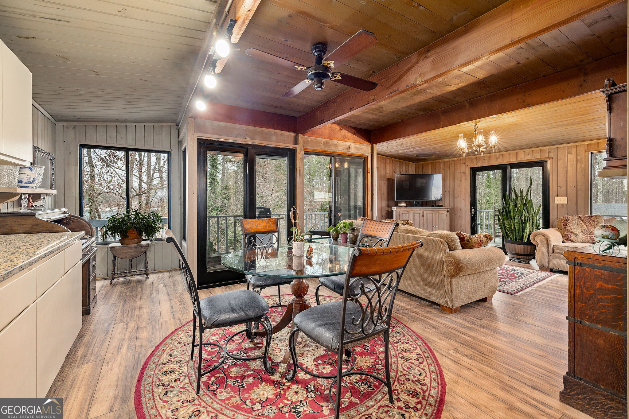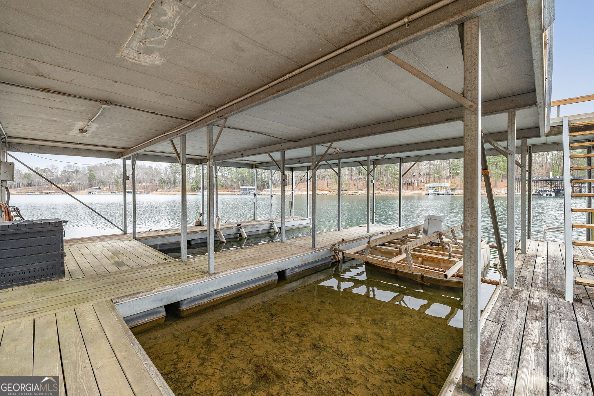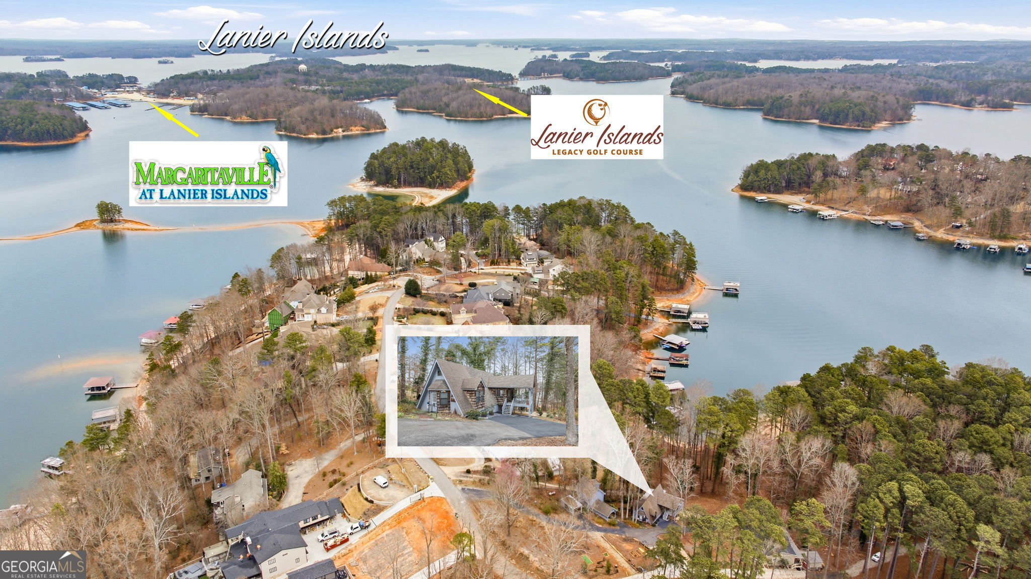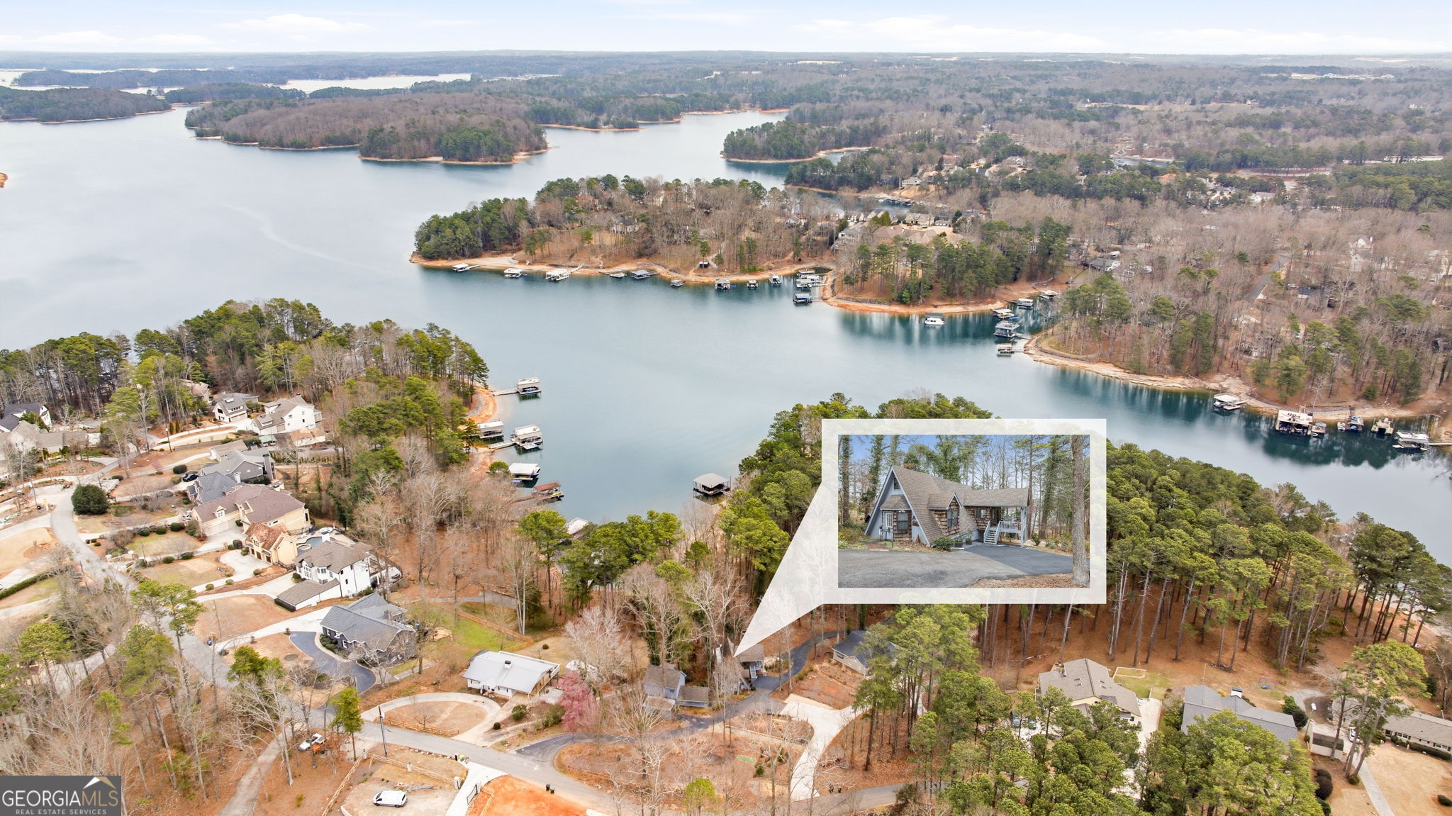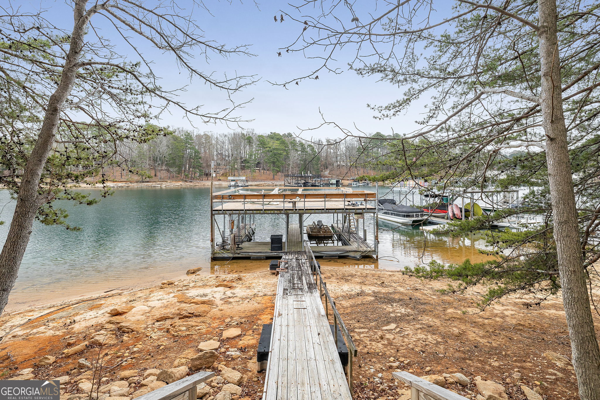 Tucked away in one of the most desirable areas of Lake Lanier's south end, this charming 1968 lake cottage offers the perfect blend of character, lake views, and true waterfront living. Surrounded by mature trees and overlooking deep water, the home captures the relaxed charm that made Lake Lanier famous. Inside, warm wood tones and natural light create an inviting atmosphere throughout the open main living area. The kitchen flows easily into the living space and dining area, while large sliding glass doors lead out to a wraparound porch where you can enjoy peaceful lake views and fresh mountain air. The main level features a comfortable bedroom and full bath, along with a fun sleeping loft above that adds additional sleeping space and storage - perfect for hosting family and friends on weekends at the lake. The walk-out terrace level brings you even closer to the water and includes an updated bedroom and full bath, offering guests privacy and easy access to the shoreline. Just a short stroll from the home sits the covered double-slip dock with an active permit, located in deep water, making boating and lake days effortless year-round. Adding even more flexibility to the property is a separate Accessory Dwelling Unit (ADU). The structure includes a studio space on the lower level and a full apartment above with kitchen and bath, along with a carport. The apartment is currently occupied by a long-term tenant who would love to stay, providing an immediate income opportunity for the next owner. Located in a highly sought-after area of the south end of Lake Lanier, the property offers convenient access to Lanier Islands, Margaritaville, and Legacy Golf Course, along with easy commuting to Atlanta. With no HOA, possible short-term rental potential, and the timeless appeal of a classic lake cottage, this property offers a rare opportunity to enjoy lake life, generate income, or create the ultimate family retreat. Whether you're looking for a weekend escape or a full-time waterfront lifestyle, this special Lake Lanier cottage captures everything people love about life on the lake.