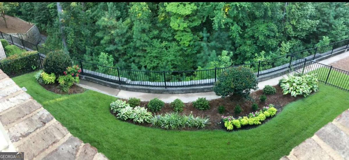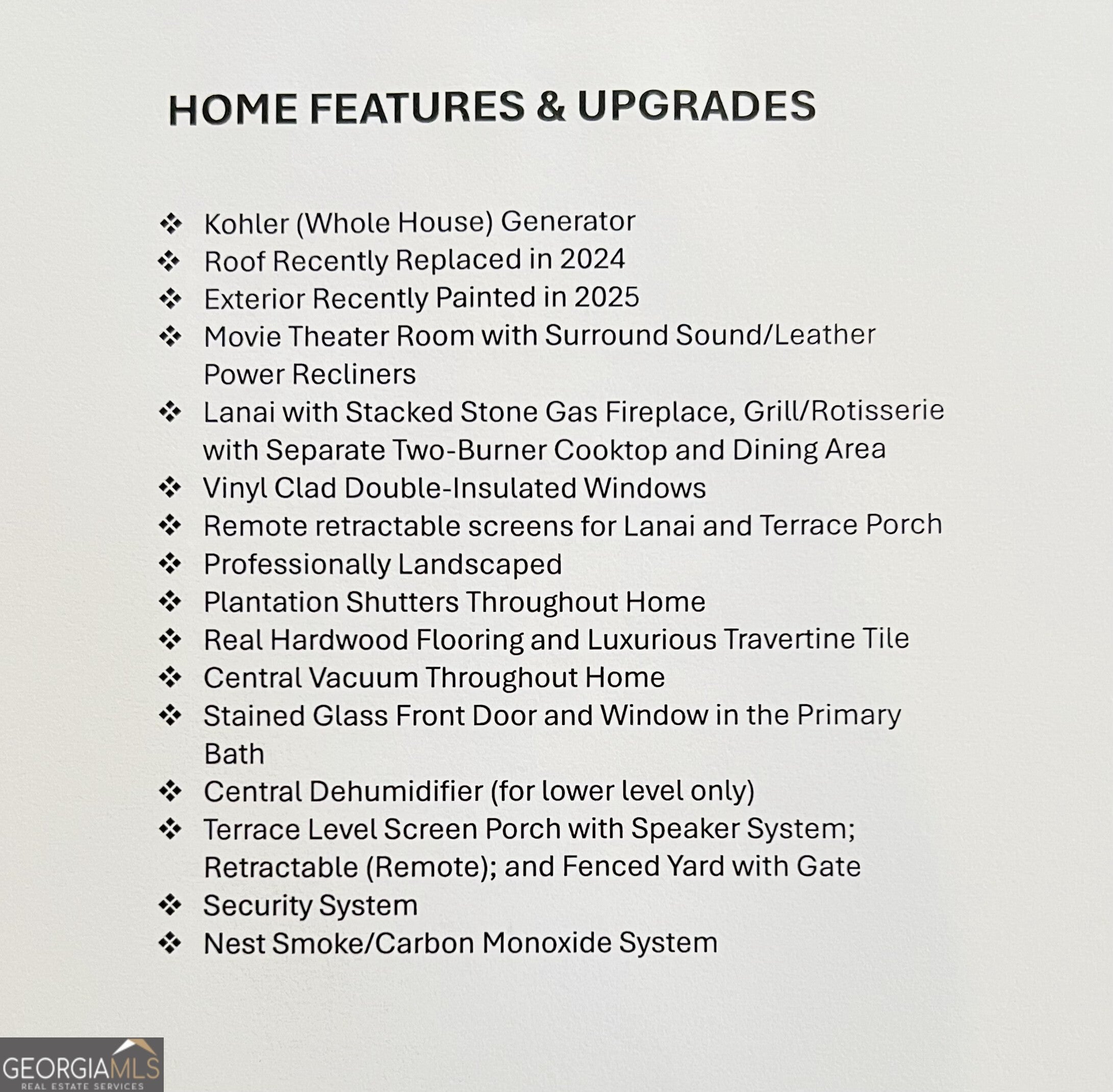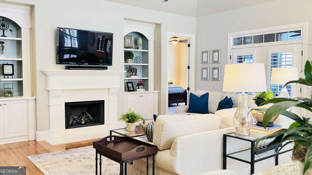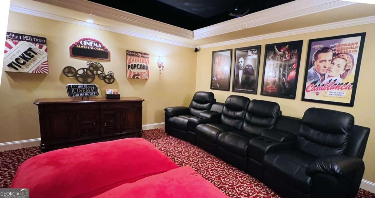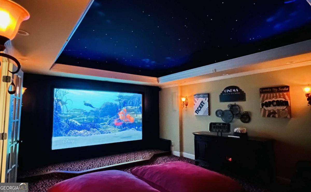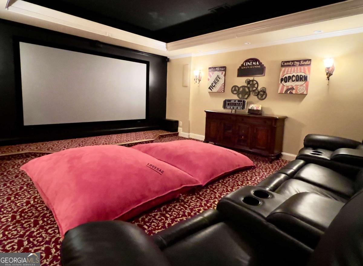 Experience a refined lifestyle in the prestigious 55+ gated community of Johns Creek, designed specifically for active adults seeking comfort and elegance. This exquisite home showcases masterful craftsmanship with many upgrades throughout its open-concept floor plan, creating a seamless blend of timeless design and modern convenience. Step through the stunning stained glass front door into a welcoming foyer adorned with travertine flooring. The private OFFICE/STUDY encompasses plenty of natural light with a view of the front porch. The FAMILY ROOM is highlighted by an inviting gas log fireplace, built-in bookcases, tray ceiling, recessed lights and stunning hardwood floors throughout the common areas. At the heart of the home lies a spacious KITCHEN that is appointed with granite counter-tops, stained cabinetry with an abundance of storage, under-cabinet lighting, stainless steel appliances, gas range, double ovens, and a large island designed for entertaining guests. The DINING area features plenty of space for seating 8 or more guests. The double french doors flow to a private and tranquil wooded view from the LANAI with insulated casement windows with remote retractable screens. This versatile space features a built-in gas grill with hood and side burners for year-round pleasure, dining area, comfortable sitting area, stacked-stone gas log fireplace and surround sound making it perfect for gatherings with friends and family. The main-level PRIMARY SUITE features a vaulted tray ceiling, abundant natural light, and a remote retractable transom shade for sleeping in late, which creates a private sanctuary for relaxation. The spa-inspired ensuite bathroom has elegant travertine tile, a vaulted ceiling, double vanity, large walk-in shower with dual shower heads, a beautiful stained-glass window above the jetted garden tub, and a walk-in dressing room. The SECOND LEVEL offers two well-appointed rooms: An oversized second primary guest suite that allows for privacy and includes plenty of space for a sitting area and office space, and a full bathroom. An additional heated and cooled Flex room can serve as a bunk room, office, exercise area or just used for additional storage. The TERRACE LEVEL features a spacious family living space area with a cozy fireplace, custom shelving, and hardwood floors and storage. This room is impressive with its surround sound for everyday listening and entertaining. The third bedroom suite features a walk-in closet and full bathroom for additional accommodation. As you flow through the family room you will find a dedicated THEATER ROOM, featuring crown molding, a 3D projector designed for an impressive 144" screen, recessed lighting, sconces, custom star ceiling, leather recliners and surround sound. Enjoy the fenced backyard with a wooded view from the private porch with surround sound - complete with remote retractable screens. The lawn maintenance and trash pickup incl in HOA fees. New roof was installed in 2024, and this home has a WHOLE HOUSE GENERATOR. Ample storage can be found in the utility that also encompasses an independent ducted dehumidifier zoned for the terrace level for continual comfort. Beyond the residence, residents enjoy manicured walking trails, community garden, bocce ball, pickleball courts, and the social elegance of a well-appointed clubhouse. The CLUBHOUSE features a billiard room, pool, fitness room, library, meeting rooms, and two kitchens that offer ample opportunities for recreation and connection. This home is conveniently located close to restaurants, shopping, golf, parks and Emory Hospital. The upcoming "Medley" will be within walking distance with a projected opening planned for October 2026. Don't miss the opportunity to make this home yours. Schedule a viewing today and envision your future here!