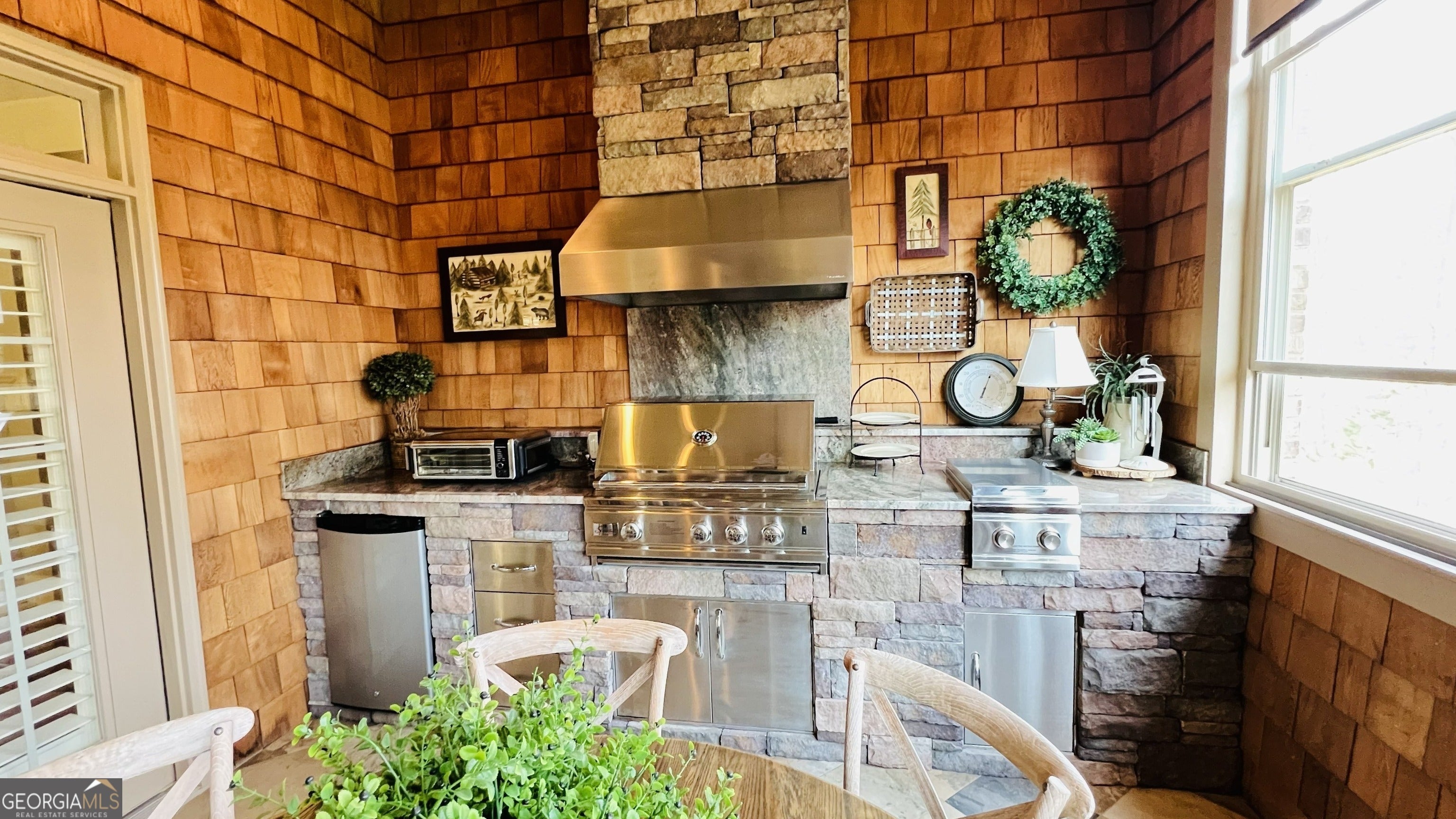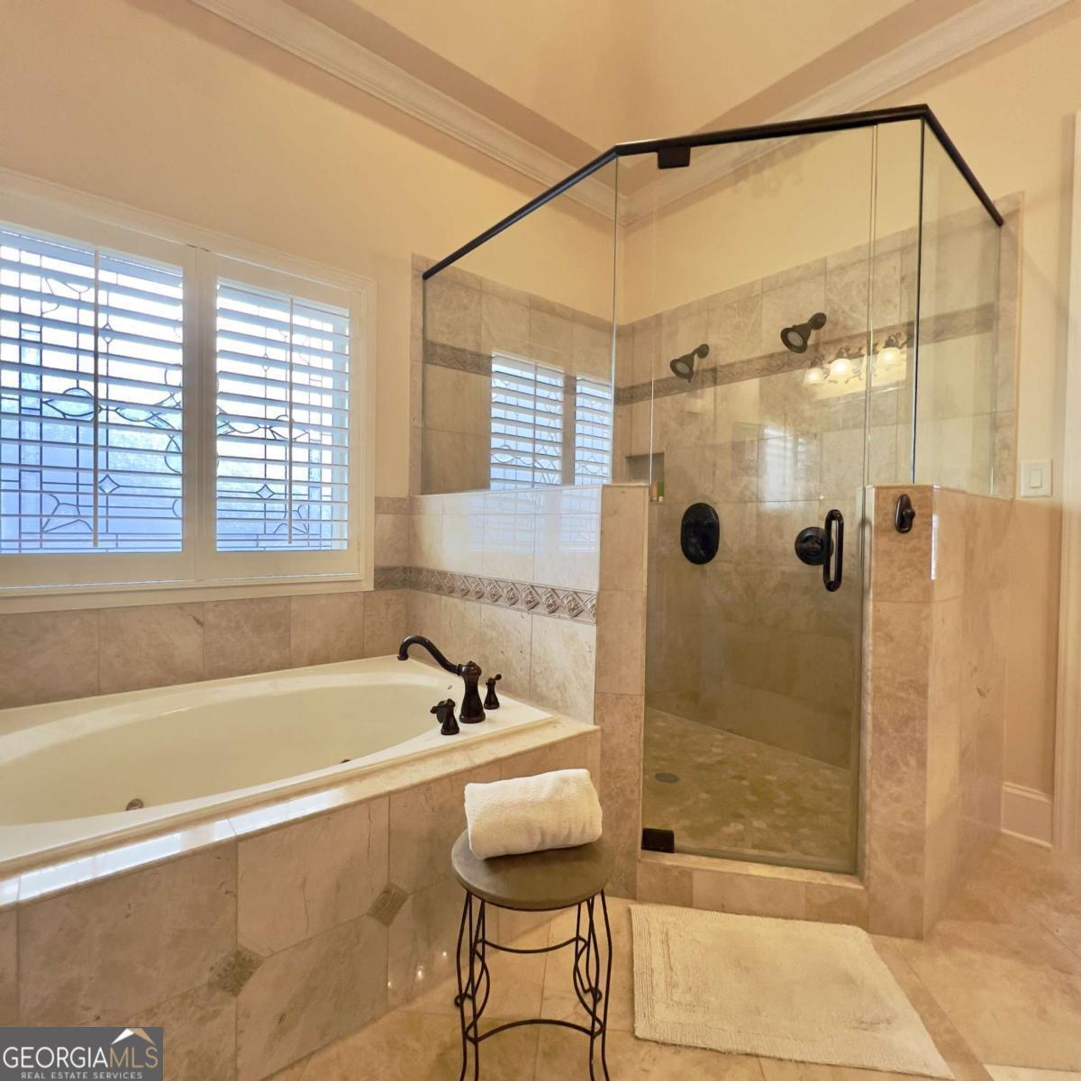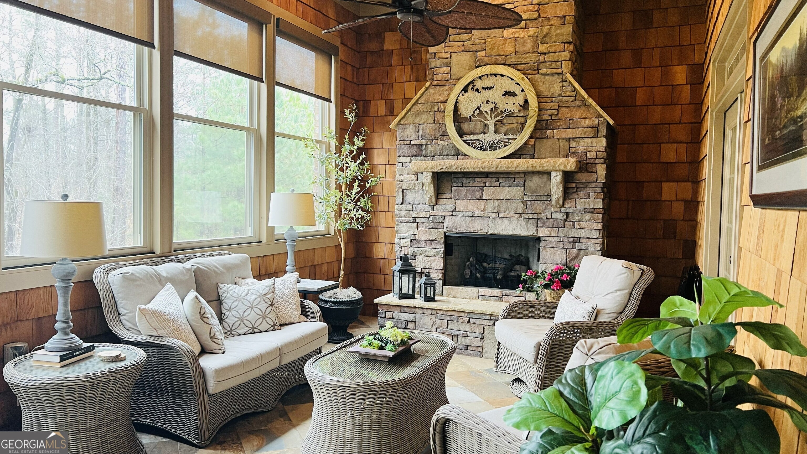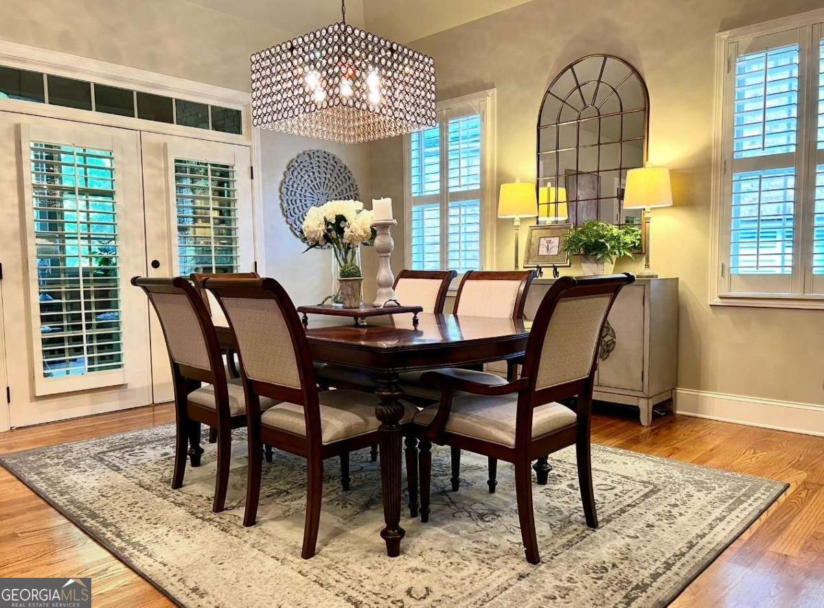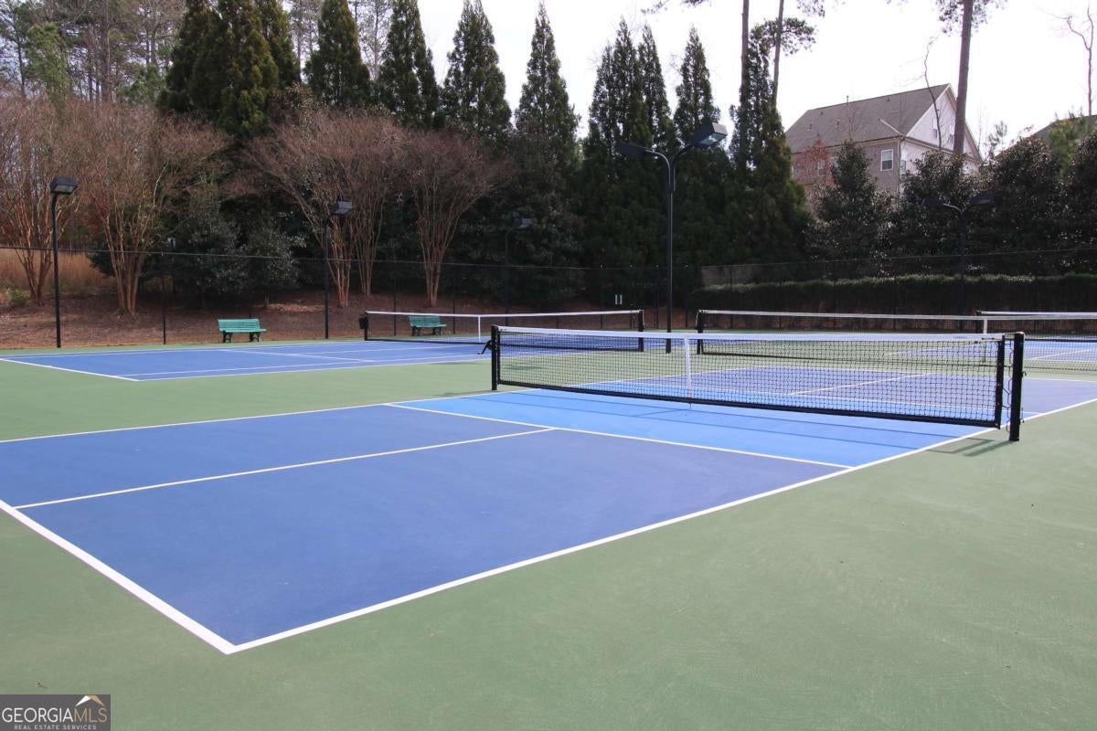 Experience a refined lifestyle in the prestigious 55+ gated community of Johns Creek, designed specifically for active adults seeking comfort and elegance. This exquisite home showcases masterful craftsmanship with many upgrades throughout its open-concept floor plan, creating a seamless blend of timeless design and modern convenience. Step through the stunning stained glass front door into a welcoming foyer adorned with travertine flooring. The private OFFICE/STUDY encompasses plenty of natural light with a view of the front porch. The FAMILY ROOM is highlighted by an inviting gas log fireplace, built-in bookcases, tray ceiling, recessed lights and stunning hardwood floors throughout the common areas. At the heart of the home lies a spacious KITCHEN that is appointed with granite counter-tops, stained cabinetry with an abundance of storage, under-cabinet lighting, stainless steel appliances, gas range, double ovens, and a large island designed for entertaining guests. The DINING area features plenty of space for seating 8 or more guests. The double french doors flow to a private and tranquil wooded view from the LANAI with insulated casement windows with remote retractable screens. This versatile space features a built-in gas grill with hood and side burners for year-round pleasure, dining area, comfortable sitting area, stacked-stone gas log fireplace and surround sound making it perfect for gatherings with friends and family. The main-level PRIMARY SUITE features a vaulted tray ceiling, abundant natural light, and a remote retractable transom shade for sleeping in late, which creates a private sanctuary for relaxation. The spa-inspired ensuite bathroom has elegant travertine tile, a vaulted ceiling, double vanity, large walk-in shower with dual shower heads, a beautiful stained-glass window above the jetted garden tub, and a walk-in dressing room. The SECOND LEVEL offers two well-appointed rooms: An oversized second primary guest suite that allows for privacy and includes plenty of space for a sitting area and office space, and a full bathroom. An additional heated and cooled Flex room can serve as a bunk room, office, exercise area or just used for additional storage. The TERRACE LEVEL features a spacious family living space area with a cozy fireplace, custom shelving, and hardwood floors and storage. This room is impressive with its surround sound for everyday listening and entertaining. The third bedroom suite features a walk-in closet and full bathroom for additional accommodation. As you flow through the family room you will find a dedicated THEATER ROOM, featuring crown molding, a 3D projector designed for an impressive 144" screen, recessed lighting, sconces, custom star ceiling, leather recliners and surround sound. Enjoy the fenced backyard with a wooded view from the private porch with surround sound - complete with remote retractable screens. The lawn maintenance and trash pickup incl in HOA fees. New roof was installed in 2024, and this home has a WHOLE HOUSE GENERATOR. Ample storage can be found in the utility that also encompasses an independent ducted dehumidifier zoned for the terrace level for continual comfort. Beyond the residence, residents enjoy manicured walking trails, community garden, bocce ball, pickleball courts, and the social elegance of a well-appointed clubhouse. The CLUBHOUSE features a billiard room, pool, fitness room, library, meeting rooms, and two kitchens that offer ample opportunities for recreation and connection. This home is conveniently located close to restaurants, shopping, golf, parks and Emory Hospital. The upcoming "Medley" will be within walking distance with a projected opening planned for October 2026. Don't miss the opportunity to make this home yours. Schedule a viewing today and envision your future here!