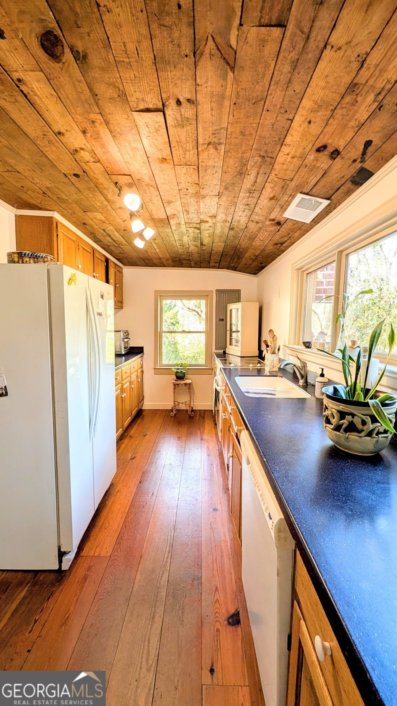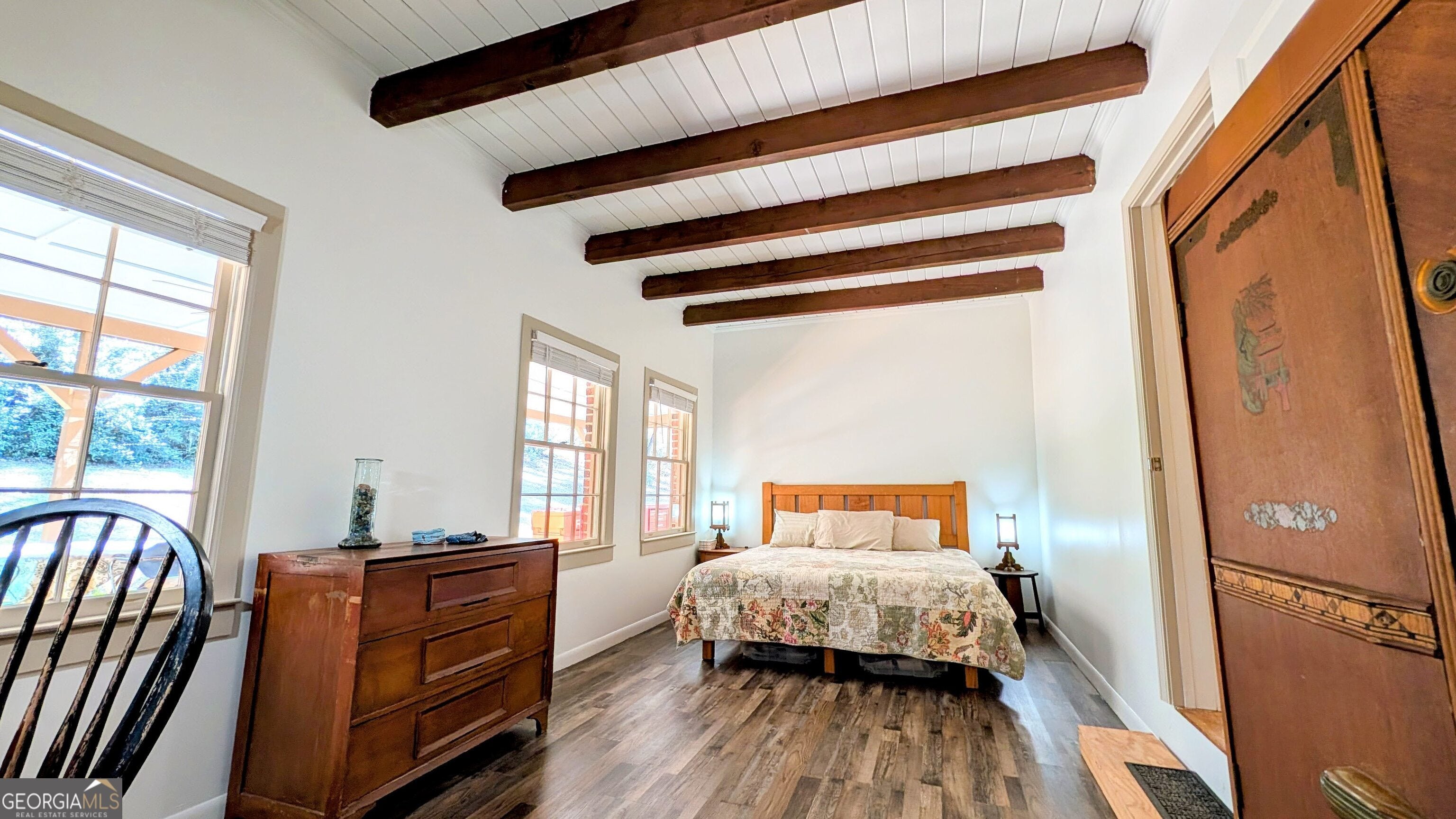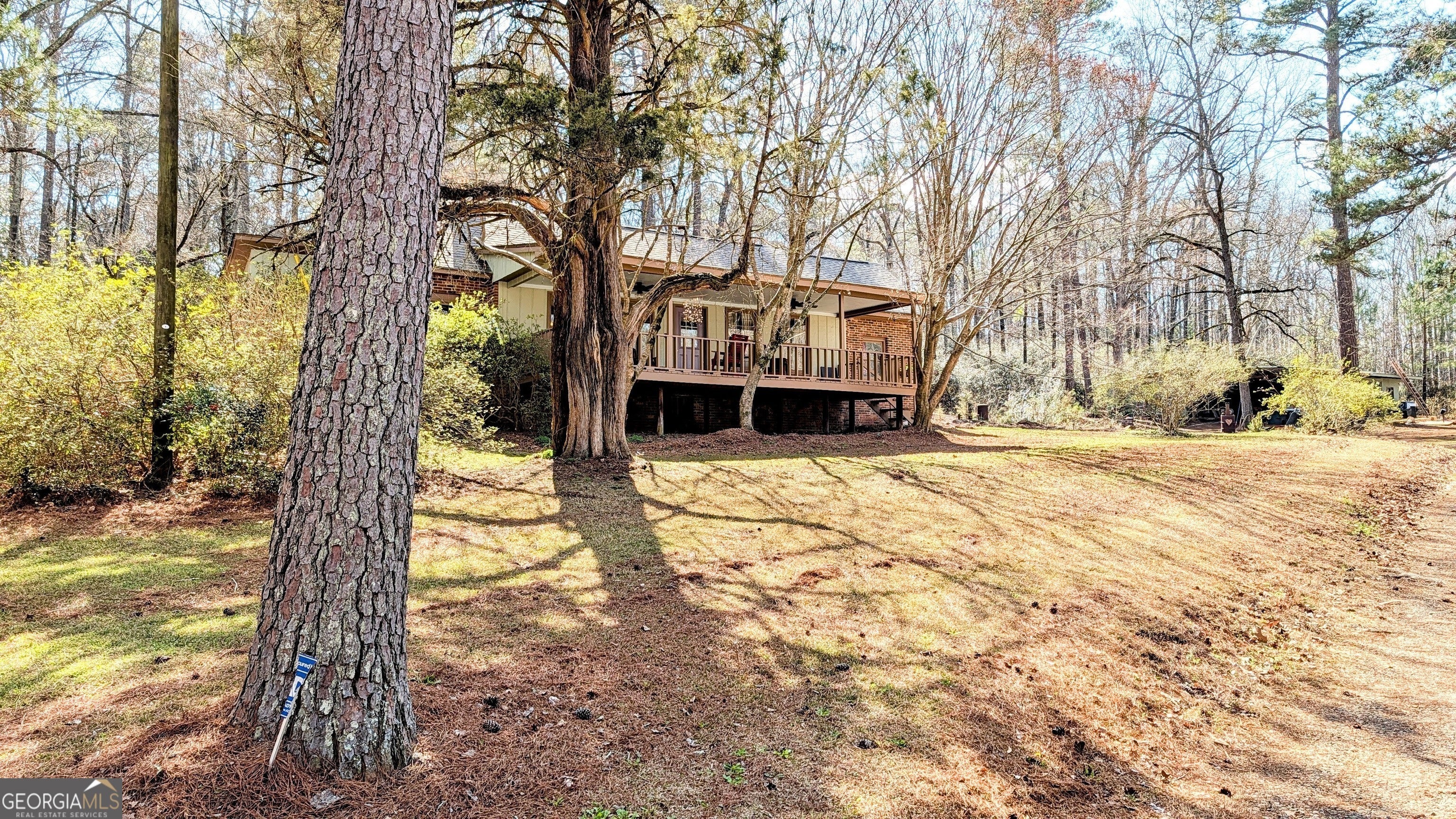 Nestled in the heart of North Macon, this 1945 cottage captures a rare ''cabin-in-the-city'' soul on a sprawling 1.6 acre lot. The interior is a masterclass in rustic character, featuring original heart pine flooring throughout the main house and exquisite brick floors in the dining room. There's no shortage of architectural details, from the beamed ceilings in the bedroom and dining room to the warm barnwood ceiling in the kitchen. While the main level offers two large bedrooms, the heated and cooled upstairs provides two additional rooms that are perfectly suited for a small guest retreat, a tucked-away reading nook, a home office, or storage. Many recent updates including a new roof, new plumbing and fresh paint inside and out. Nature lovers will find their sanctuary outside, where the property unfolds into a private park-like setting complete with mature trees and walking trails. The outdoor living spaces are equally impressive, featuring a massive front porch perfect for wildlife viewing, a side patio for alfresco dining, and a huge covered back patio finished with beautiful clay tile. A detached outbuilding includes a dedicated studio or workshop area, making this the ultimate artist's dream or a quiet creative retreat. This property offers the perfect balance of secluded woodland living and prime North Macon convenience.