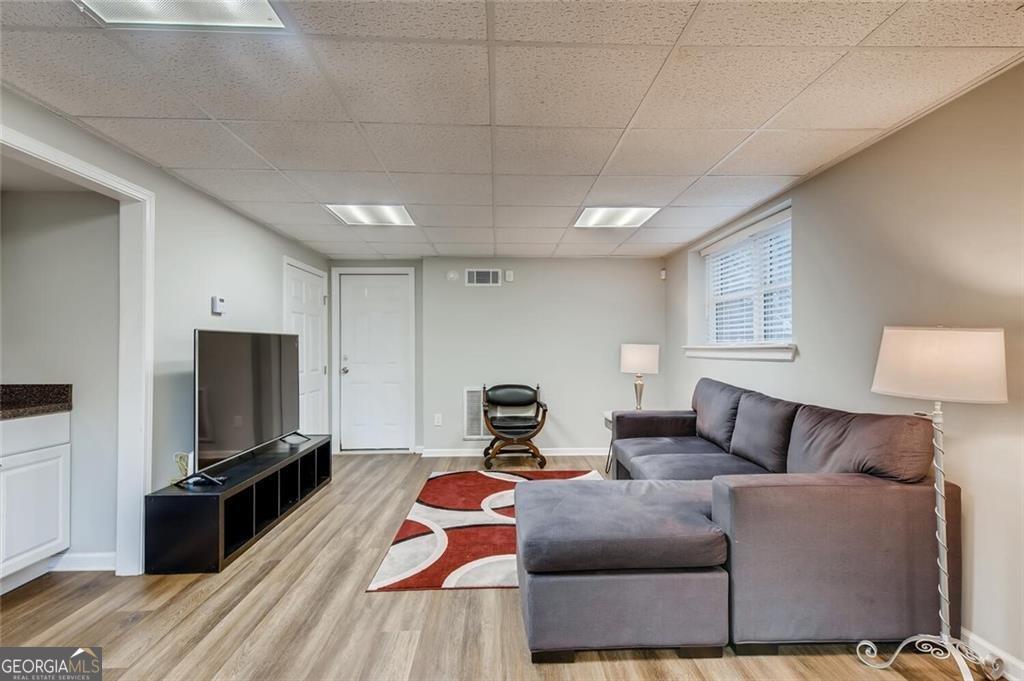 Completely rebuilt in 2019, this single-story home with a basement apartment offers a modern open floor plan and a main level primary suite. The full renovation (rebuild) included new roofing, flooring, windows, HVAC, plumbing, electrical systems, and appliances, providing updated infrastructure throughout. The main living area features hardwood floors, recessed lighting, and a gas fireplace with a white stone surround. The kitchen is open to the living room and includes stone countertops, a stone backsplash, under-cabinet lighting, a gas range, double ovens, a bar with wine storage, glass-front display cabinets, and a beverage fridge. A light-filled breakfast room and a large dining area complete the main living space. The screened porch offers a vaulted wood ceiling and a quiet space for relaxation. The main-level primary suite includes a soaking tub, a separate walk-in shower with frameless glass, and an oversized vanity. The main-level primary suite includes a generous bedroom, walk-in closet, soaking tub, a separate walk-in shower with frameless glass, and an oversized vanity. A dedicated laundry room with built-in cabinetry adds convenience. The finished basement includes a private apartment with a kitchenette, living area, bedroom, and full bath-ideal for guests, extended family, or potential rental income. Additional features include a two-car garage, stone patio and stone steps at front, basement storage, backyard shed and a quiet location on a dead-end street. Walkable to Midvale Elementary and close to area amenities.