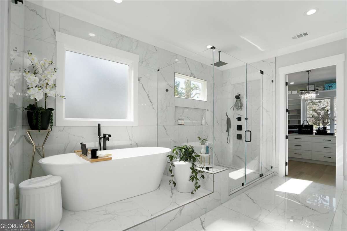 - Interior FeaturesBeamed Ceilings, Bookcases, Double Vanity, High Ceilings, Master On Main Level, Pulldown Attic Stairs, Separate Shower, Soaking Tub, Split Bedroom Plan, Tile Bath, Two Story Foyer, Walk-In Closet(s), In-Law Floorplan