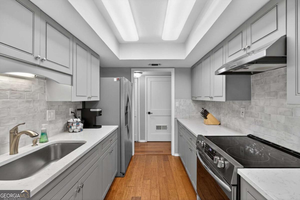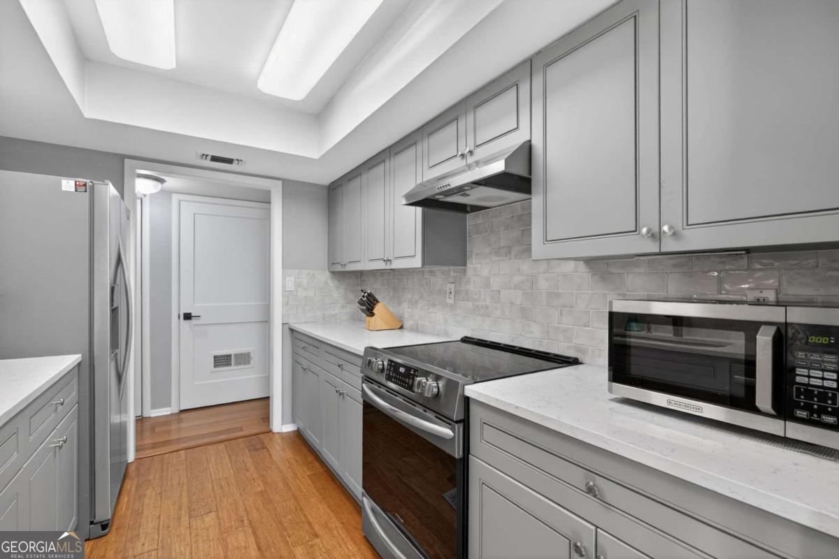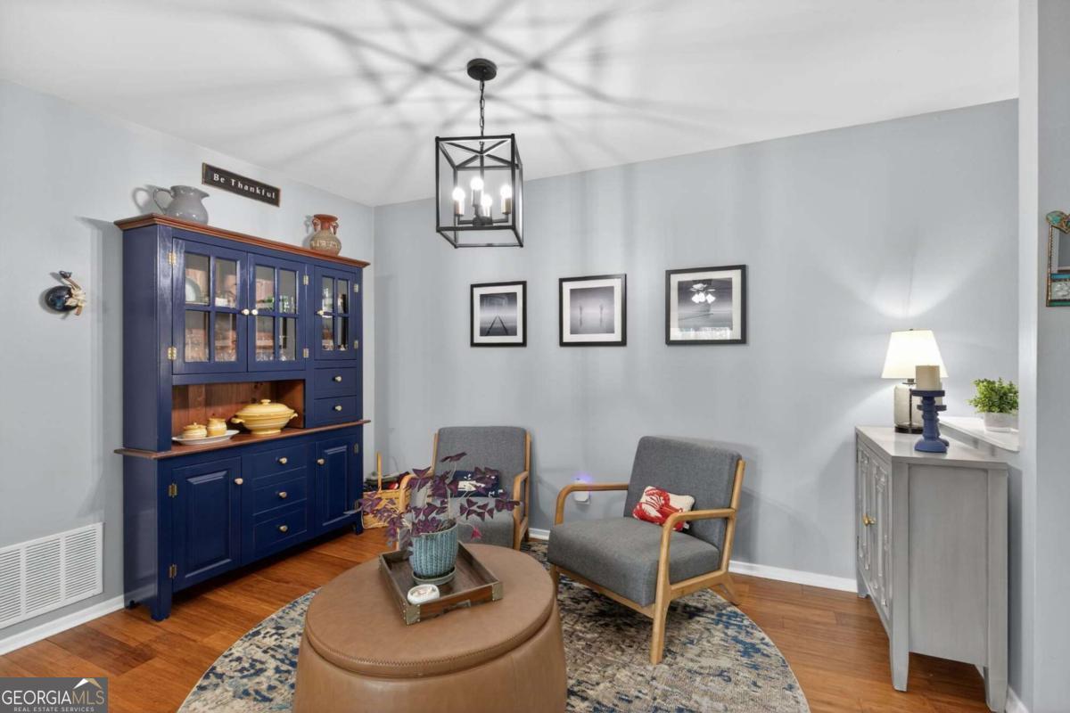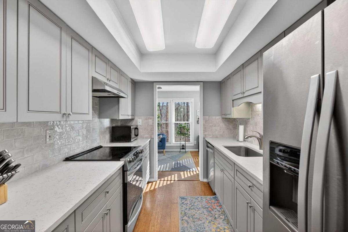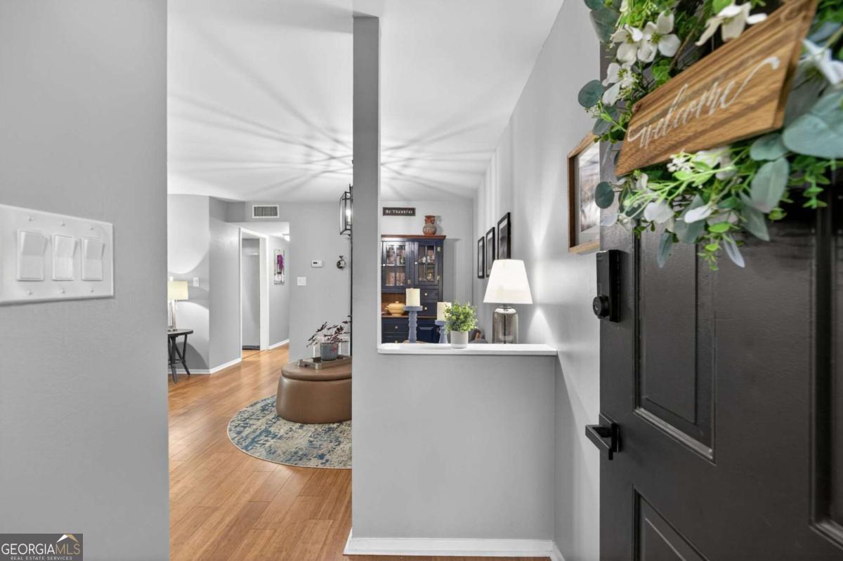 Welcome to this beautifully updated home in the desirable Canyon Point community of Roswell. This move-in ready home features hardwood floors throughout, resurfaced ceilings, and custom solid wood interior doors with updated hardware that add both style and noise reduction. The kitchen and bathrooms have been thoughtfully renovated with quartz countertops and new cabinetry. The primary suite offers a walk-in closet and a well-appointed bath. Major updates provide peace of mind, including new windows, a water heater replaced in 2022, and the roof and siding replaced in 2021. Enjoy the extended patio overlooking a private wooded setting where deer are often seen. The resurfaced saltwater pool creates the perfect space for relaxing or entertaining. Conveniently located near downtown Roswell with easy access to shopping, dining, and nearby parks including East Roswell Park, Big Creek Park & Greenway, and the Chattahoochee River trails.