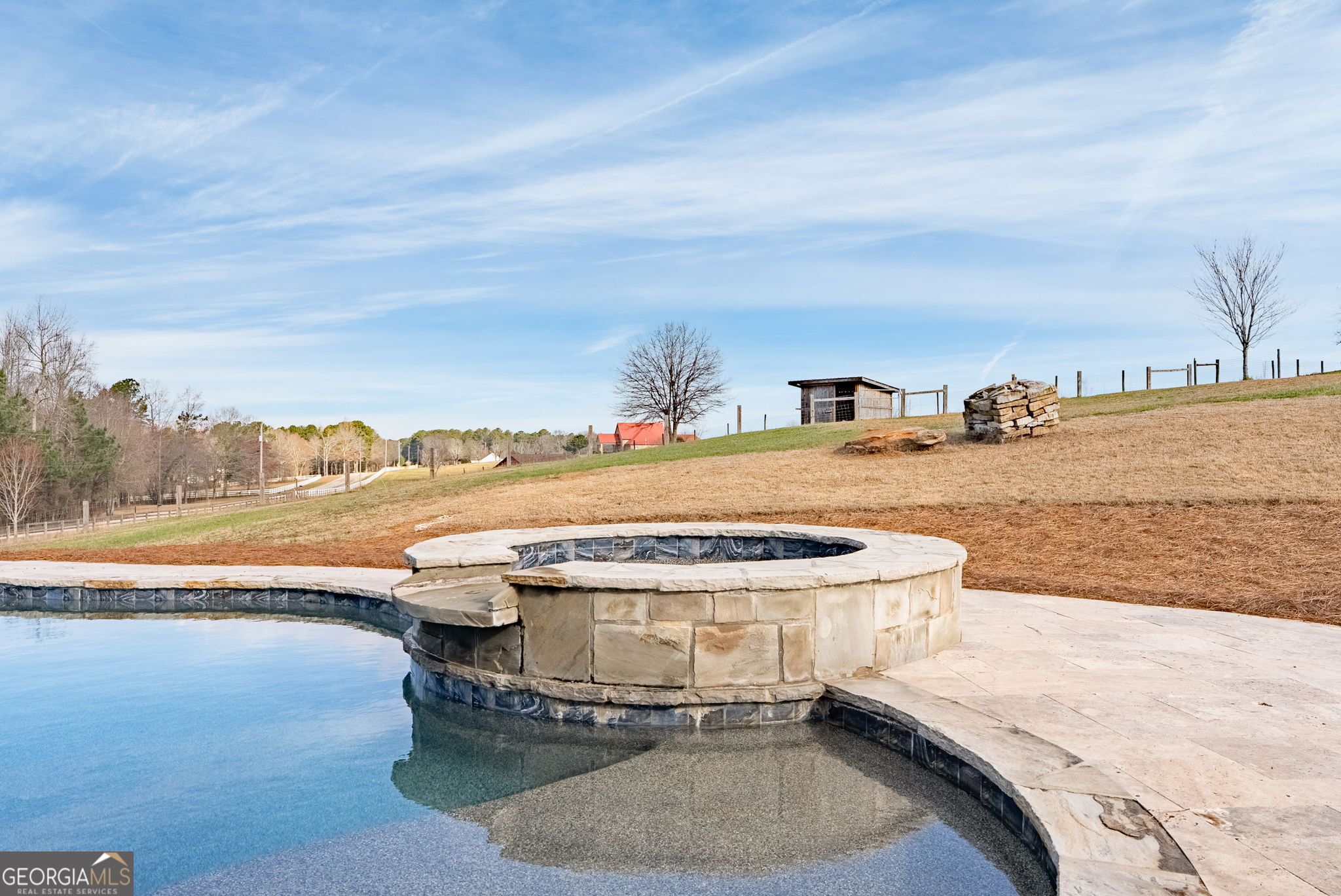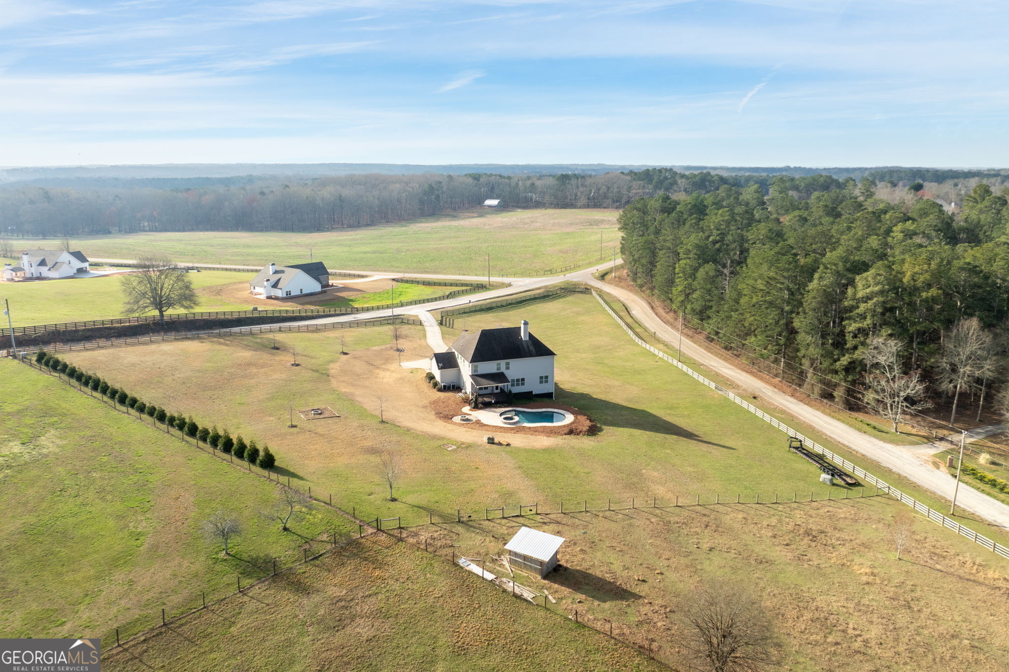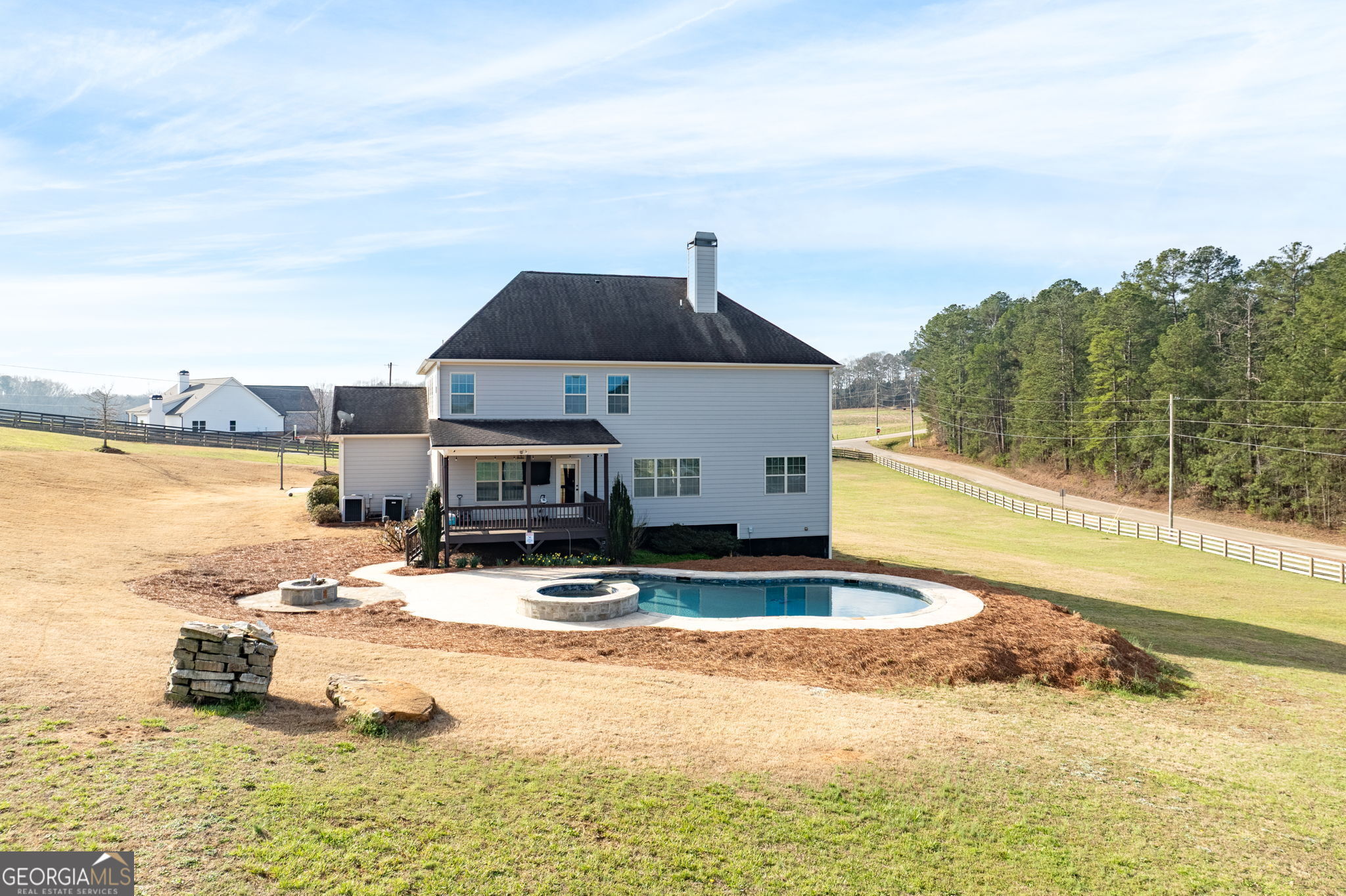 Stunning custom-built estate situated on 5 private acres in desirable Walton County. A welcoming front porch and impressive two-story entry set the tone for this beautifully designed home. Rich hardwood floors flow throughout the main living areas, leading into a remodeled chef's kitchen featuring an oversized island, tons of storage, a walk-in pantry, quartz countertops, stainless steel appliances, and a wine fridge. The open-concept layout is ideal for entertaining, anchored by a cozy fireplace in the family room. The luxurious and sprawling primary suite offers a private retreat, while the additional spacious bedrooms and loft area provide both comfort and functionality. Designed for efficiency and year-round comfort, the home includes an upgraded HVAC system with enhanced air purification. A full unfinished basement offers endless possibilities for expansion, storage, or recreation. As you step outside to your private outdoor oasis, a large covered patio/deck overlooks the completely fenced yard and sparkling inground heated saltwater pool and hot tub, perfect for relaxing, entertaining, or enjoying warm Georgia summers. A fire pit area adds charm for evening gatherings under the stars. This home is awaiting its new owners!