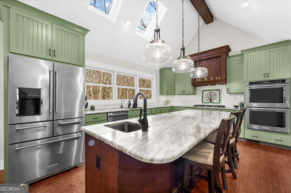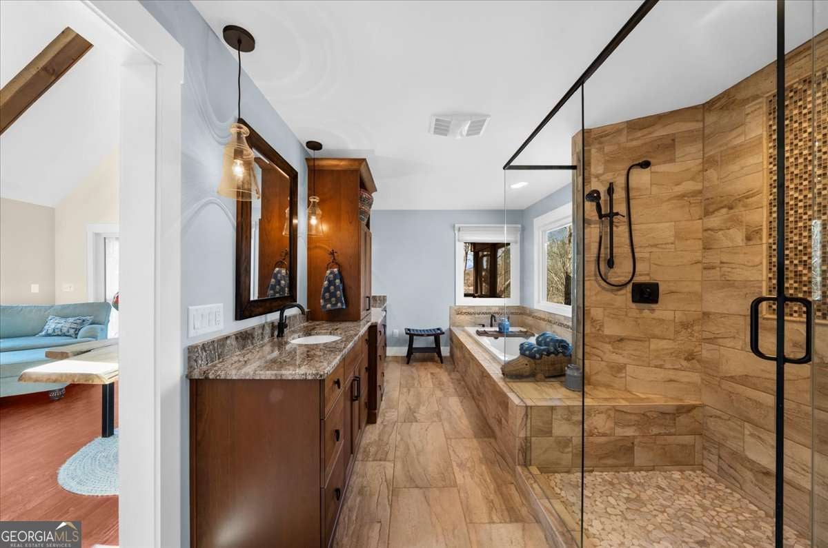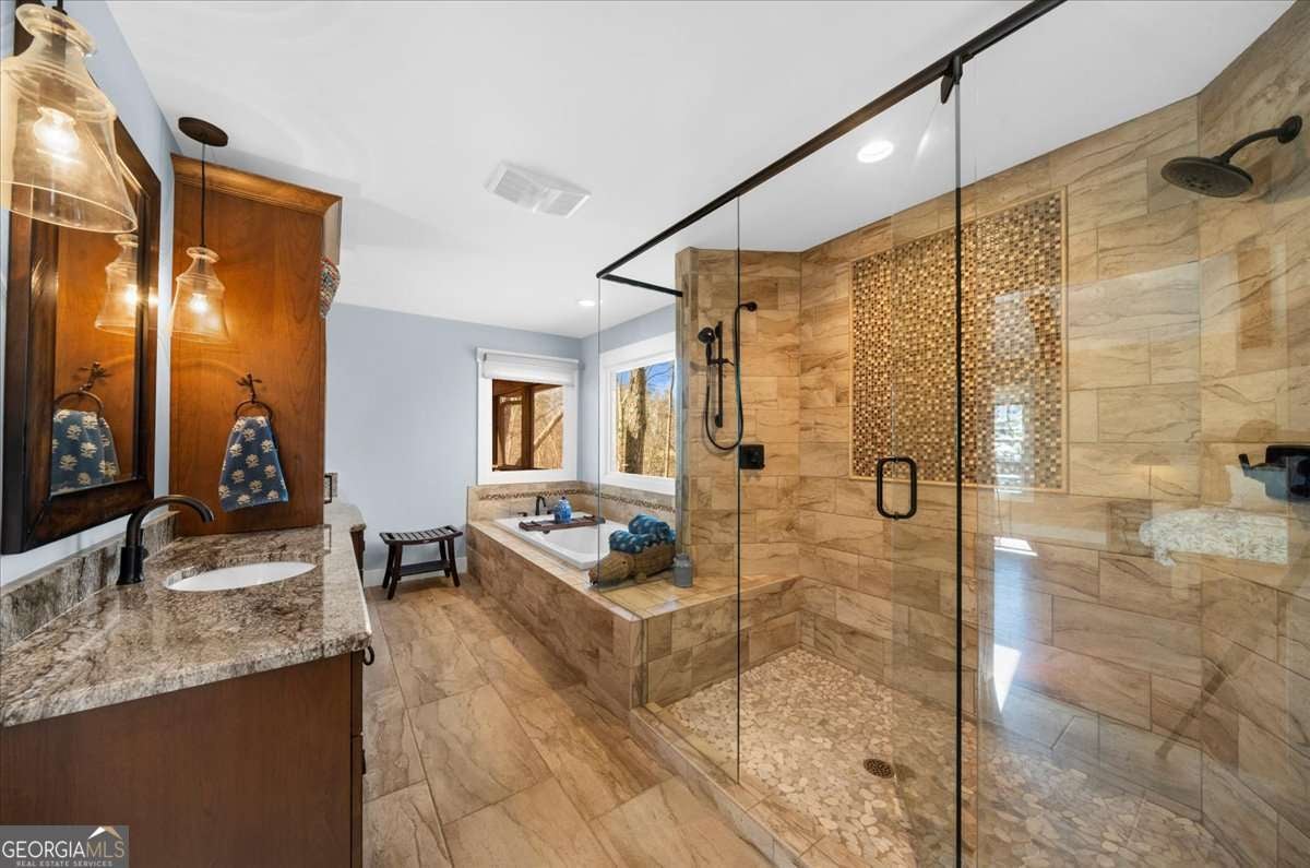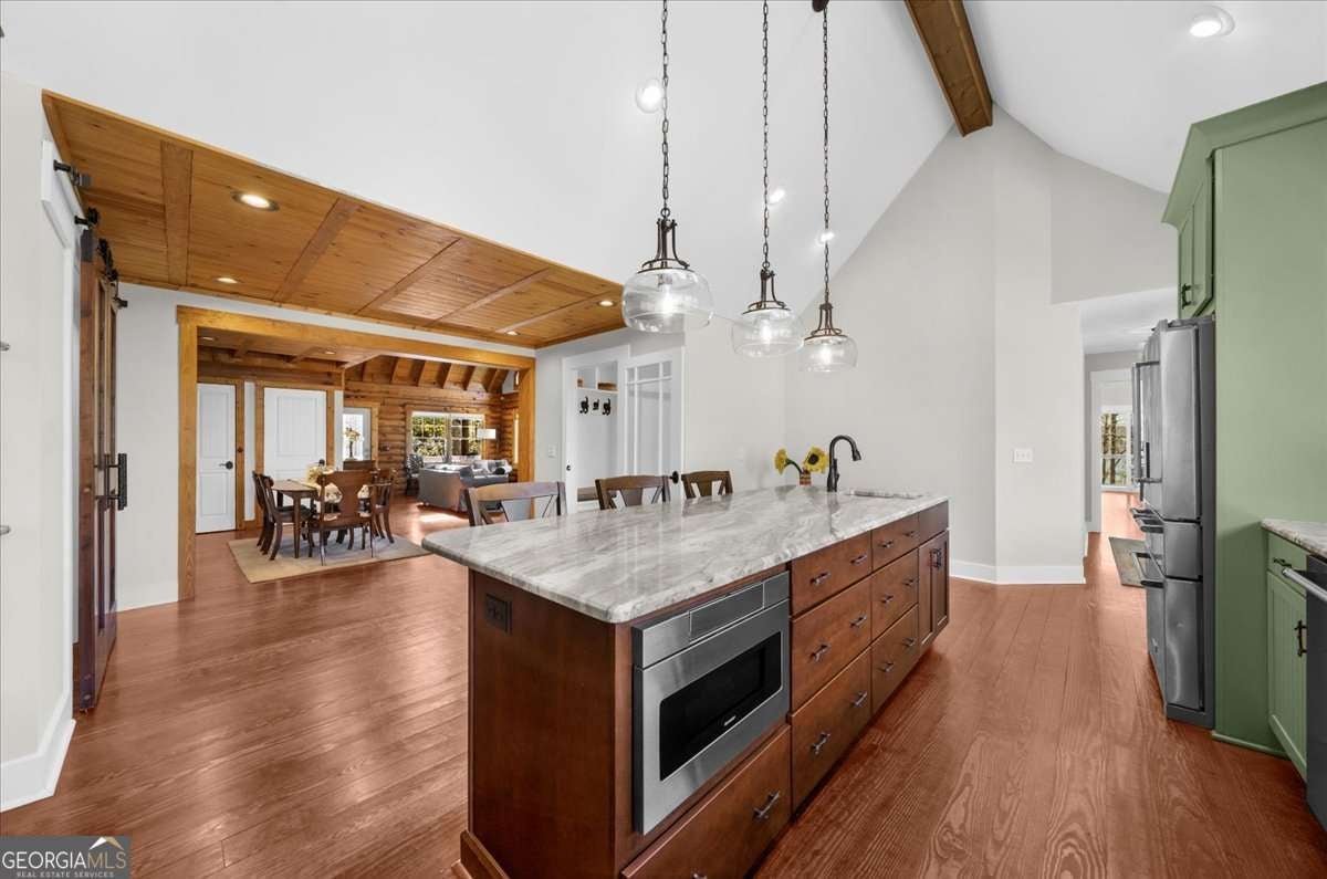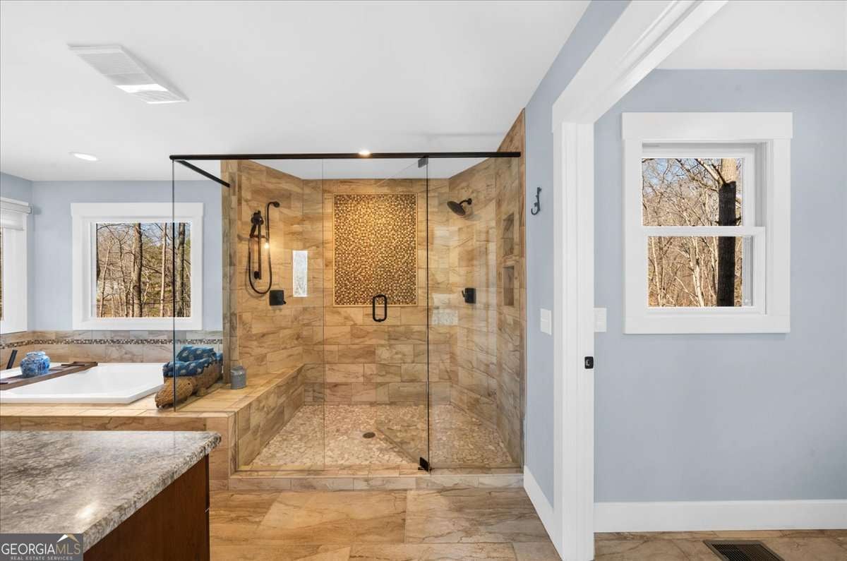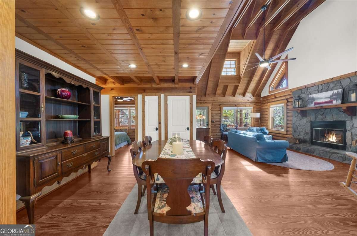 This home has the feel of both a mountain cabin and an elegant lake retreat. With a major addition in 2020, including the lake facing extraordinary primary suite, loft, gourmet kitchen, laundry room, garage, basement, and oversized screened porch, it is the culmination of several years of thoughtful planning and meticulous design to blend the beauty of the natural world that this home is surrounded by, into indoor living space. Every room was created to be aesthetically warm, welcoming, and spacious. Lighting, color, and choice of building material played a significant role. From custom cabinetry, outlet placement, closet designs, a one of a kind mudroom, ADA accessibility, and reverse osmosis water filters, functionality was key. At the heart of the home, the kitchen serves as a central gathering place, yet this very special property offers multiple private environments for creativity, work, and reflection. The expansive decks and porches have hosted countless gatherings, offering an effortless flow for entertaining. An additional 2330 square feet daylight basement with french doors facing the lake, plumbed, framed, with high end HVACs and tankless water heater, is ready for your imagination. The property is on a point, with 552 feet of lake frontage and bordered by CORPS land on two sides, one with a creek. The enchanting cove is peaceful, quiet, and relaxing. The dock is always in deep water and has electricity at the dock as well as an easy walk to the dock. Stand up paddling, kayaking, boating, swimming, treks, and relaxing with delightful and caring neighbors and family is what the sellers have experienced while in their home. Evenings are extraordinary. Moonlight pours through skylights, and the shifting seasons unfold through walls of windows. At sunset, the lake casts shimmering reflections across the interior of this gorgeous and unique home. The fenced garden has irrigation and the grounds have been transformed into a certified native habitat sanctuary, recognized by Birds Georgia and the National Wildlife Federation, making for minimal maintenance and maximum enjoyment. Although you are located 10 minutes from a new Publix, and have easy access to Dawsonville and 400, Gainesville and I 985, Dahlonega and the North Georgia mountains, you will come home and feel like you are a million miles away from it all. Please treat yourself and take a tour of one of Lake Lanier's most special homes.